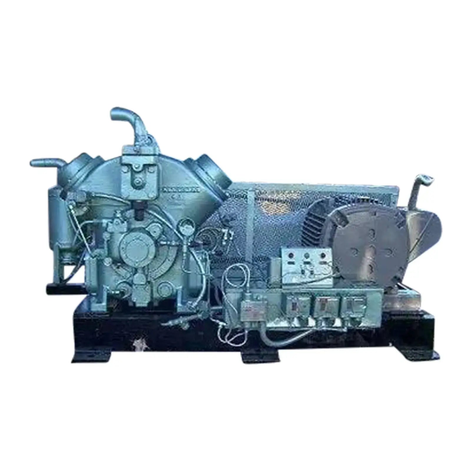 Compresor alternativo Mycom de 4 cilindros. Modelo: 4WJ-BB. S/N: 470225. Refrigerante: Freón únicamente. Presión de prueba de fugas (alta/baja): 313/185 psig. Presión de prueba hidrostática (alta/baja): 470 psig. Motor General Electric, 50 hp, 1780 rpm, 230/460 V, 121,6/60,8 amperios, 60 Hz, trifásico. Diámetro de la polea motriz: 11-1/2 pulg. Diámetro de la polea conducida: 1 pie 4 pulg. de diámetro. Relación de polea: 0,71. Revoluciones finales: 1279. Separador de aceite: 2 galones, dimensiones interiores de pared recta: 8 pulgadas de diámetro. x 11 pulg. H. Entradas: (1) 2 pulg. puerto de succión del compresor. Salidas: (1) 2 pulg. de diámetro. Puerto de descarga de refrigerante. El anterior propietario lo instaló en 2005 para usarlo en un sistema de agua helada. Dimensiones totales: 6 pies 9 pulgadas de largo x 3 pies 7 pulgadas de ancho x 3 pies 4 pulgadas de alto (H12).