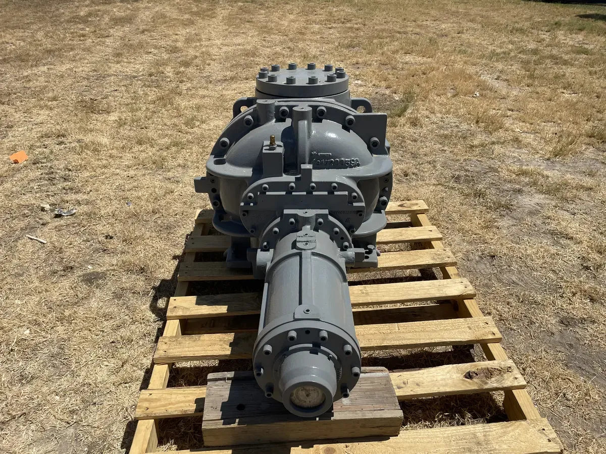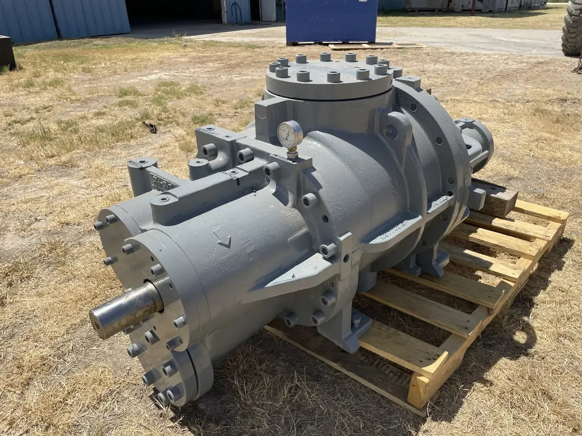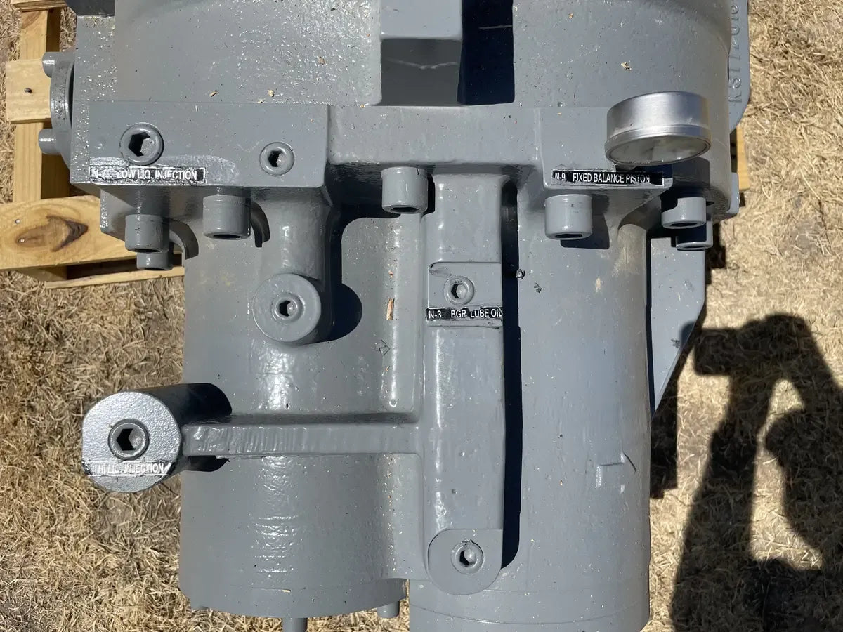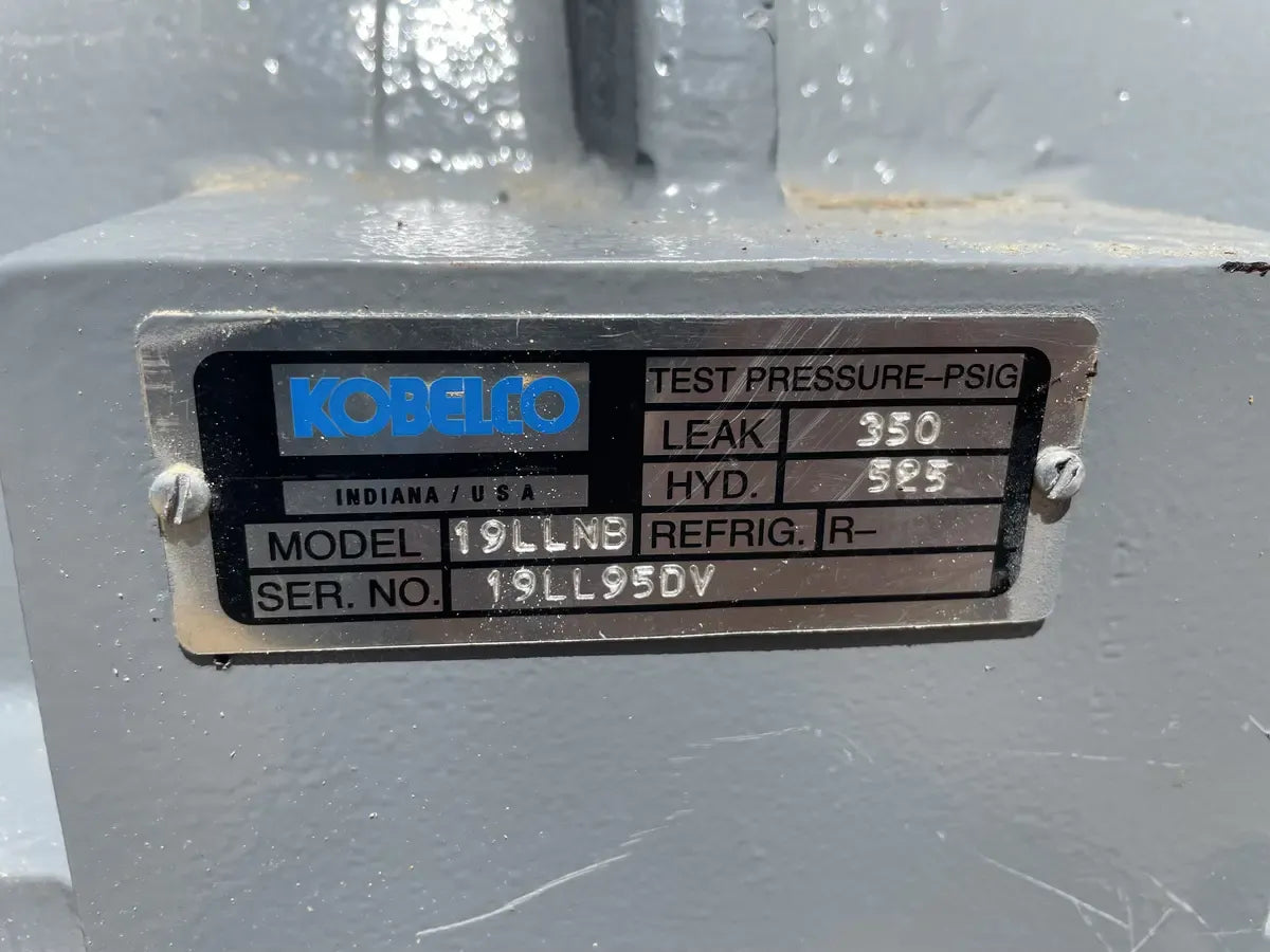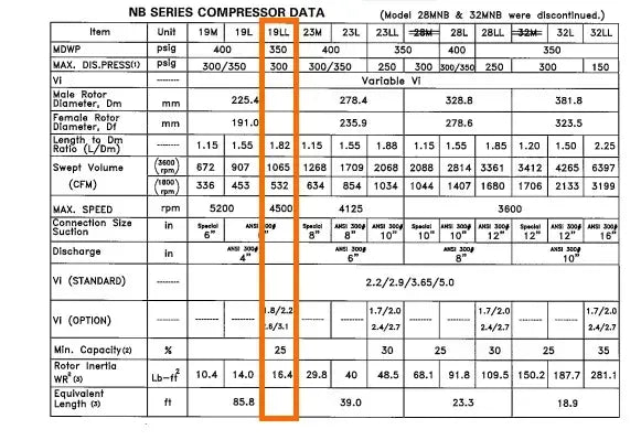 Compresor de tornillo desnudo a gas Kobelco. Modelo: 19LL. N.º de serie: 19LL95DV. Presión de prueba (PSIG): Fuga: 350, HYD: 525. Desplazamiento a 3600 RPM: 1065 CFM, m3/h: 1809. Desplazamiento a 1800 RPM: 532 CFM, m3/h: 905. Presión máxima de trabajo (PSIG): 350 PSIG. Volumen barrido (CFM): 1065 cfm a 3600 RPM, 532 CFM a 1800 RPM. RPM máximas: 4500.