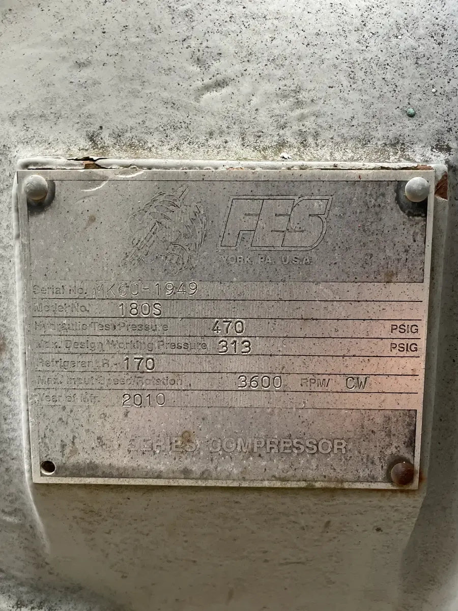 SE EXTRACTO DE UN COMPACTADOR DE TORNILLO FES 180S - N.° de serie: MK60-1949, N.° de modelo: 180S, Presión de prueba hidráulica: 470 PSIG, Presión máxima de trabajo de diseño: 313 PSIG, Refrigerante: R170, Velocidad máxima de entrada: 3600 RPM. Año de fabricación: 2010.