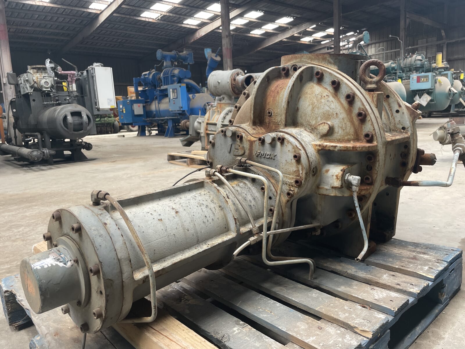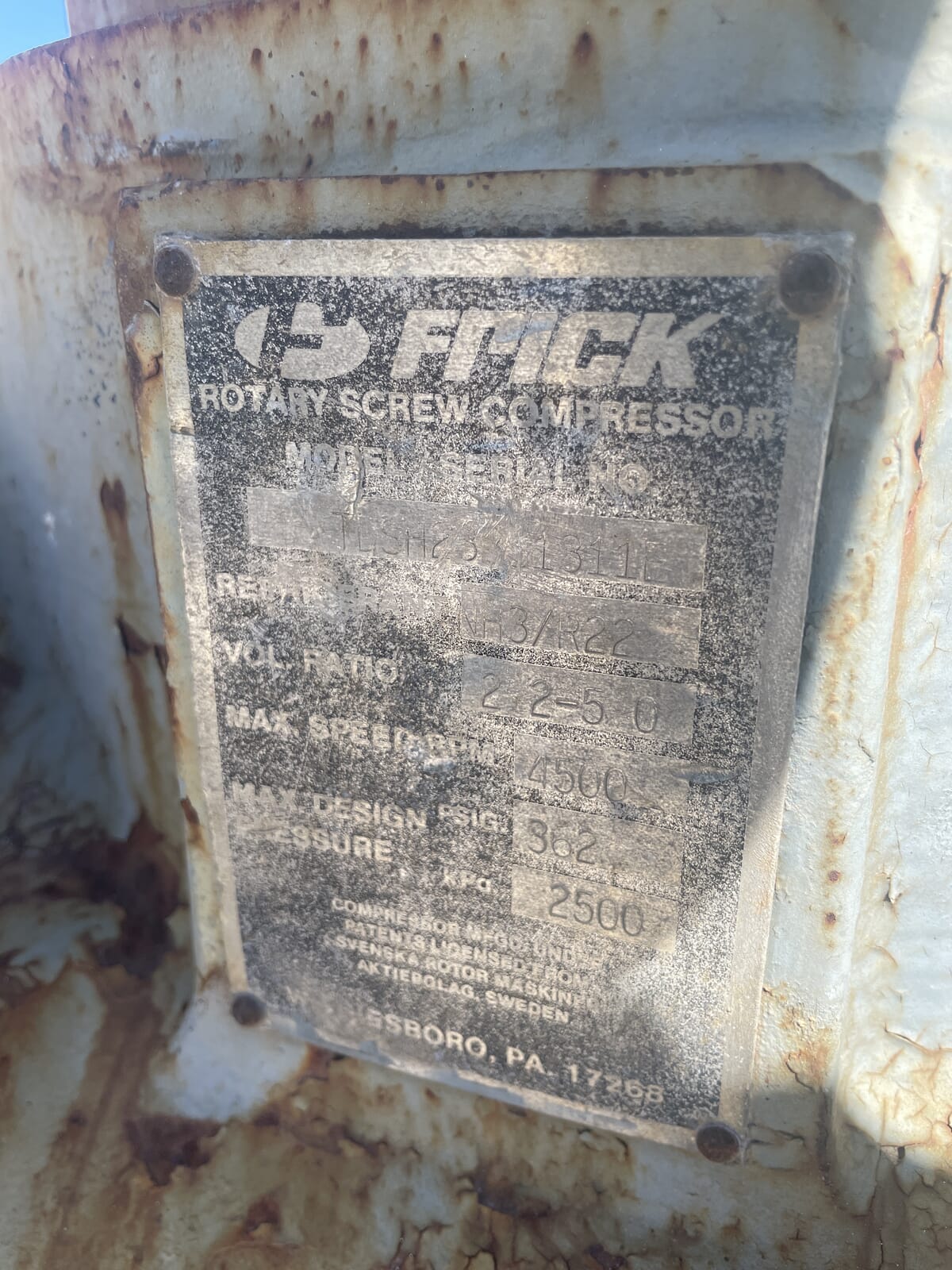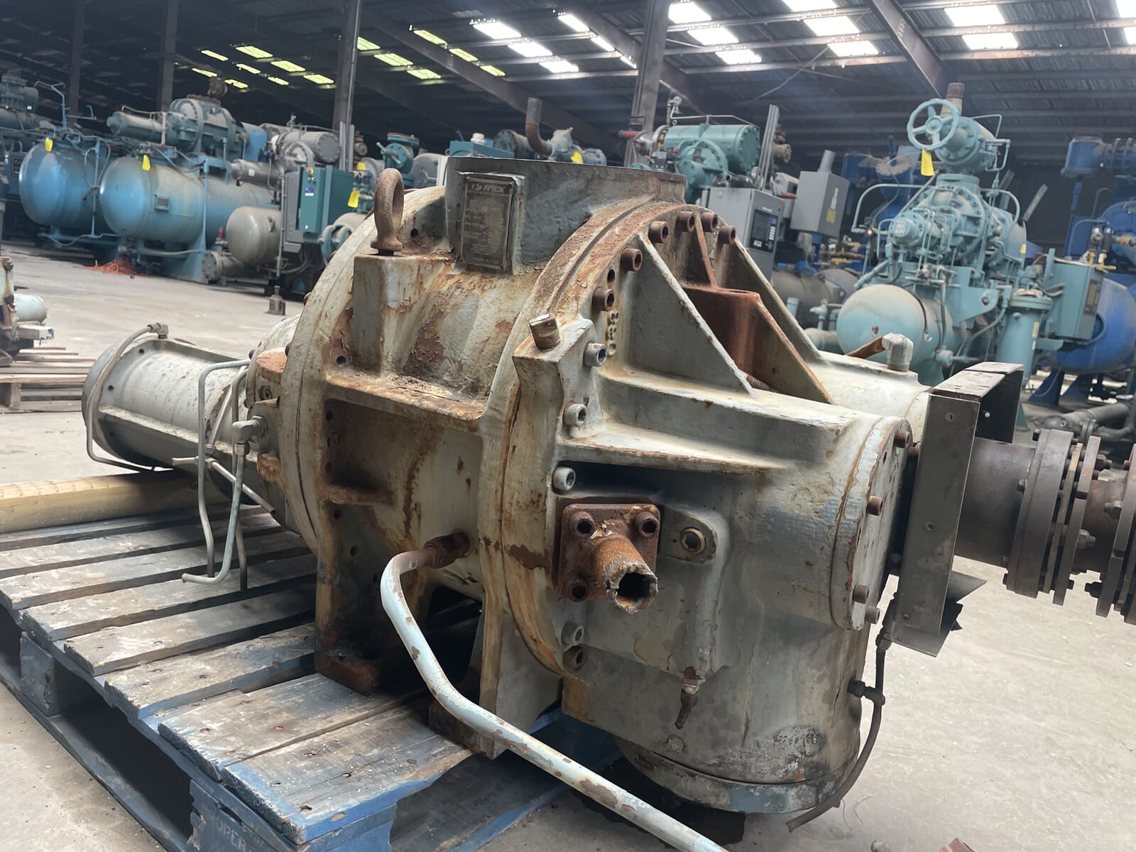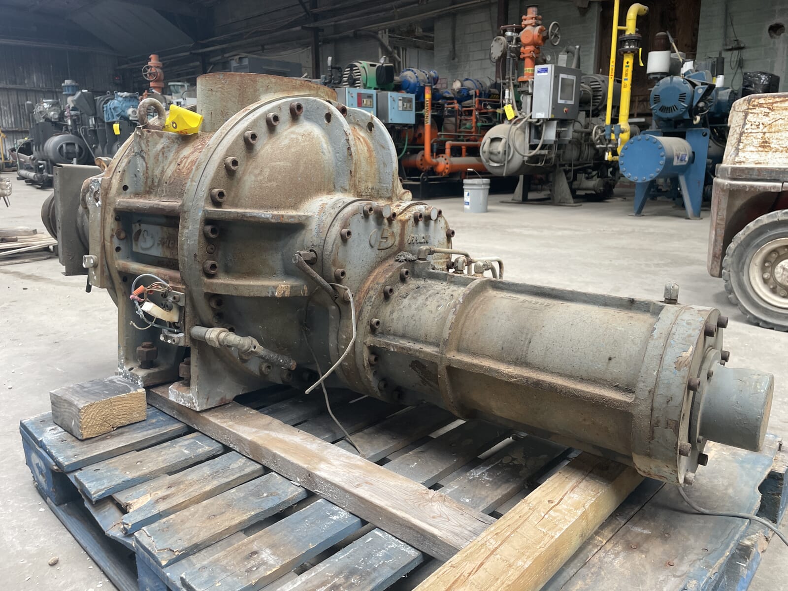 Compresor de tornillo desnudo Frick: Modelo: TDSH233S, Número de serie: 1311E. Relación de volumen: 2,2-5,0. Velocidad máxima (RPM): 4500. Presión máxima de diseño (PSIG): 362. Refrigerante anterior: NH3/R22.