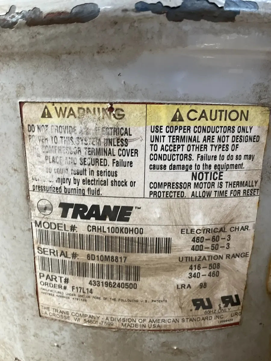 Compresor Scroll Trane - Modelo: CRHL100K0HO0, Número de serie: 6D10M8817, Número de pedido: F17L14. Carga Eléctrica: 460V/60HZ/3PH. LRA: 98. Rango de utilización