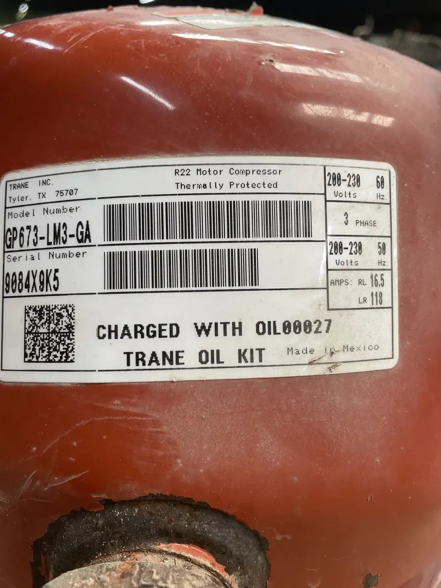 Compresor Scroll Trane - Número de modelo: GP673-LM3-GA, Número de serie: 9084X9K5. Fuente de alimentación: 200-230 Voltios, 60 Hz, 3 PH. Cargado con el kit de aceite Trane OIL0027.