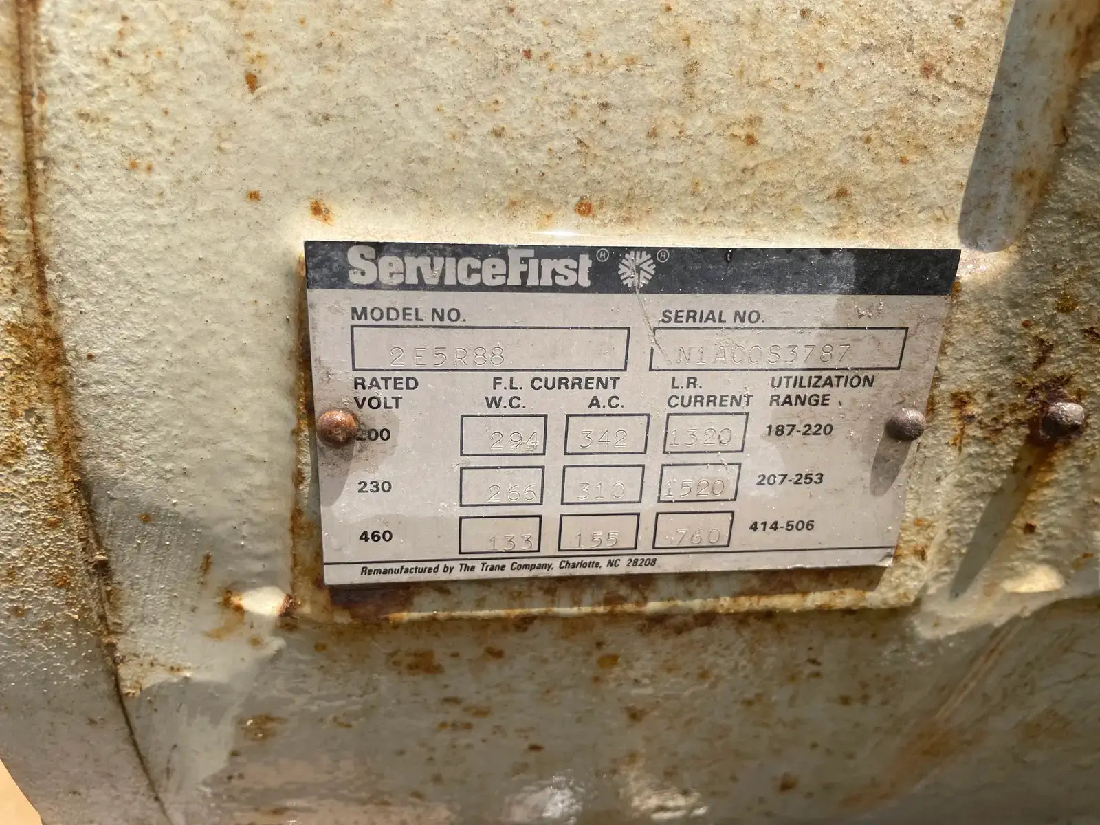 Compresor semihermético Trane: 80 toneladas. Modelo: 2E5R88. Número de serie: N1A00S3787. Motor: 8 cilindros. Capacidades: 200-230-460 V, 294-266-133 FL WC, 342-310-155 AC, 1320-1520-760 LR, Rango de utilización: 187-220 & 207-253 & 414-506. Dimensiones totales: 43 pulgadas de largo x 34 pulgadas de ancho x 30 pulgadas de alto (ACN75)