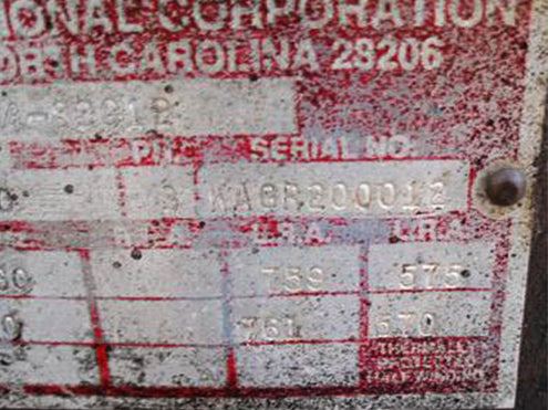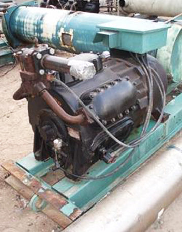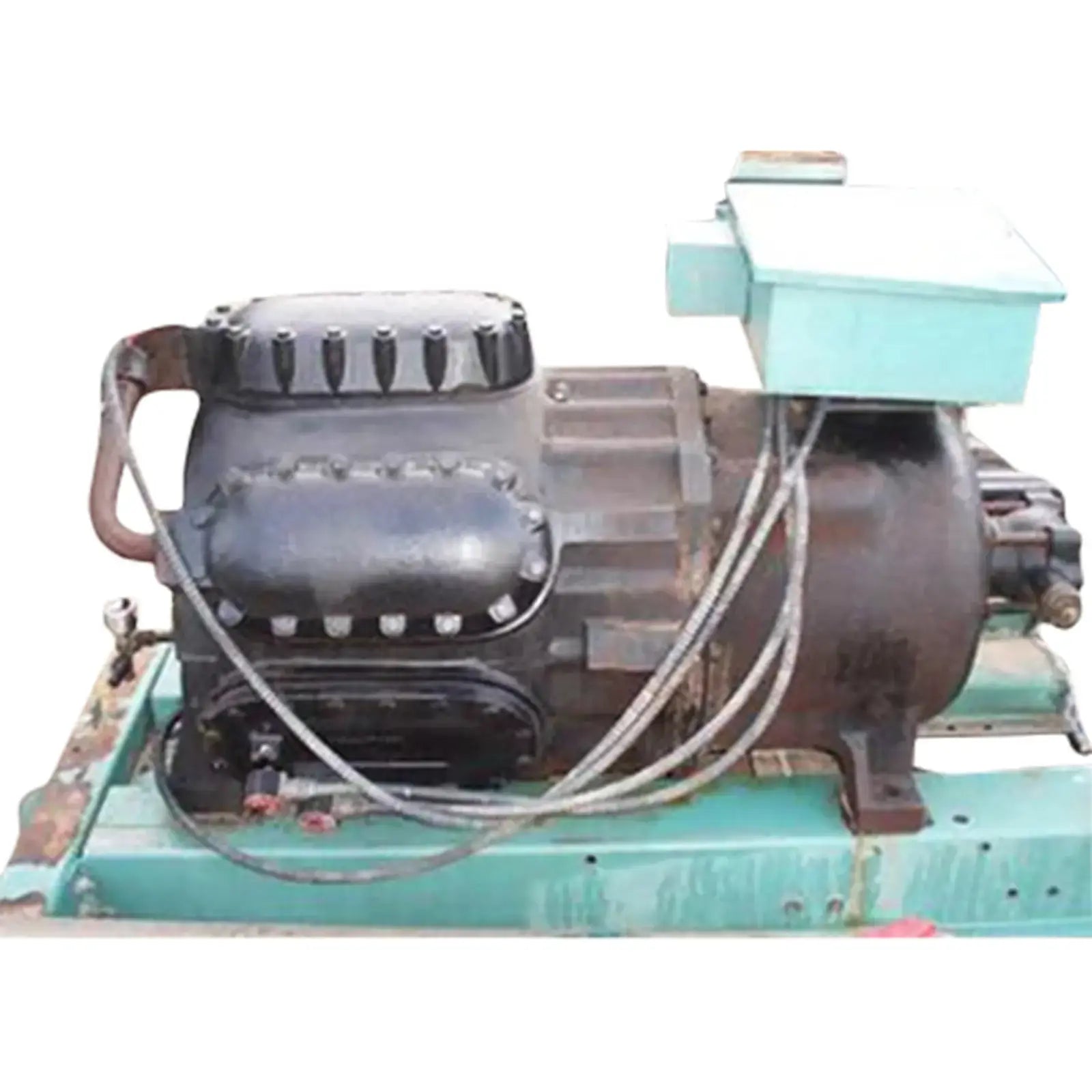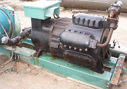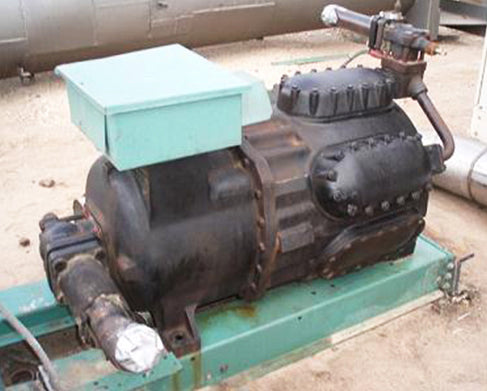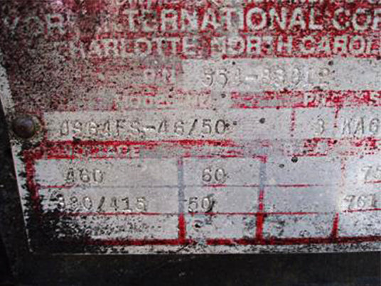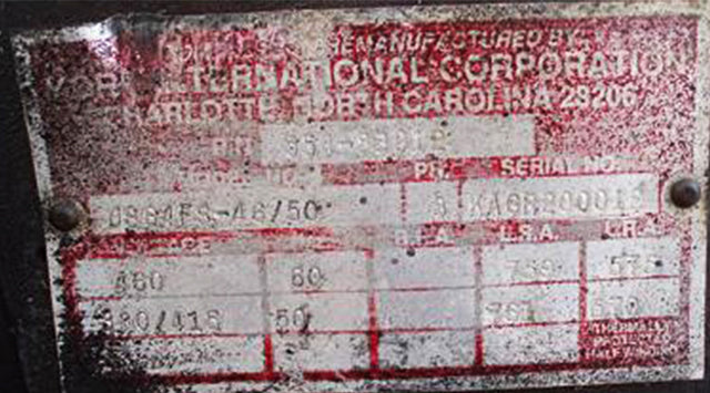 Compresor semihermético de 6 cilindros York International. Modelo: JS64FS-46/50. Número de serie: KAGR200012. P/N: 554-83012. Refrigerante: R-22. Fuente de alimentación: 460-380/415 V, 759/575-761/570 amperios, 60/50 Hz, trifásica. Entradas: (1) 2-1/2 pulg. de diámetro. Puerto de refrigerante de cobre. Salidas: (1) 3 pulg. de diámetro. Puerto de descarga de refrigerante de cobre. Dimensiones totales: 4 pies 11 pulgadas de largo x 3 pies 4 pulgadas de ancho x 3 pies 4 pulgadas de alto.