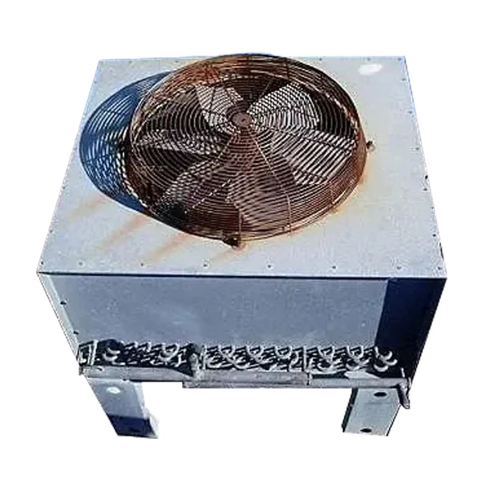 Condensador enfriado por aire de Gulf+Western Manufacturing Company. Modelo: RDD0062F. Número de serie: BTD8121. Número de trabajo: 5386. División de transferencia de calor de Bohn. Presión de trabajo: 400 psig. Diámetro del ventilador: 2 pies. Motor del ventilador: 1/2 hp, 230 V, 3,2 amperios, 60 Hz, trifásico. Ampicidad mínima del circuito: 4,0. Entradas/salidas: (1) 1 pulg. de diámetro. Puertos de cobre. Dimensiones totales: 3 pies 3 pulgadas de largo x 2 pies 10 pulgadas de ancho x 3 pies 7 pulgadas de alto.