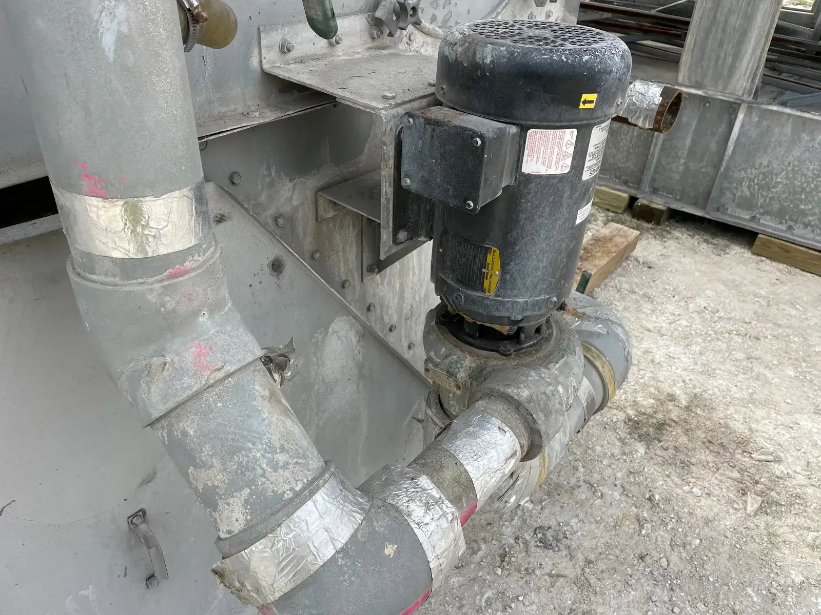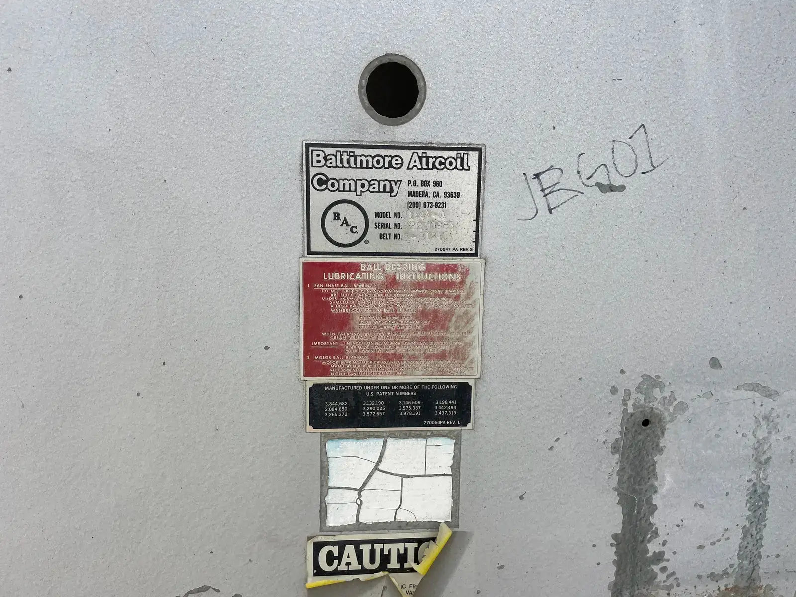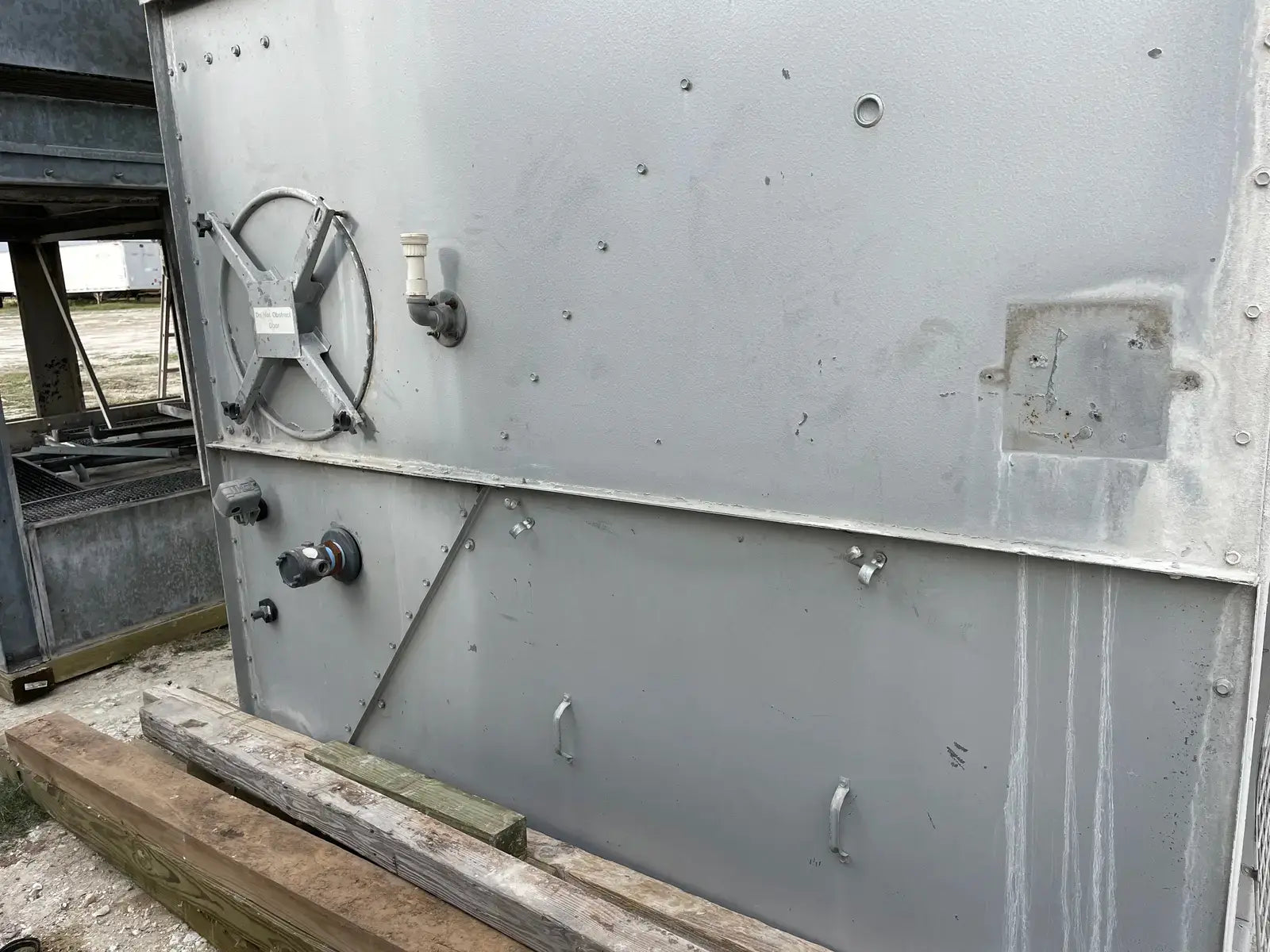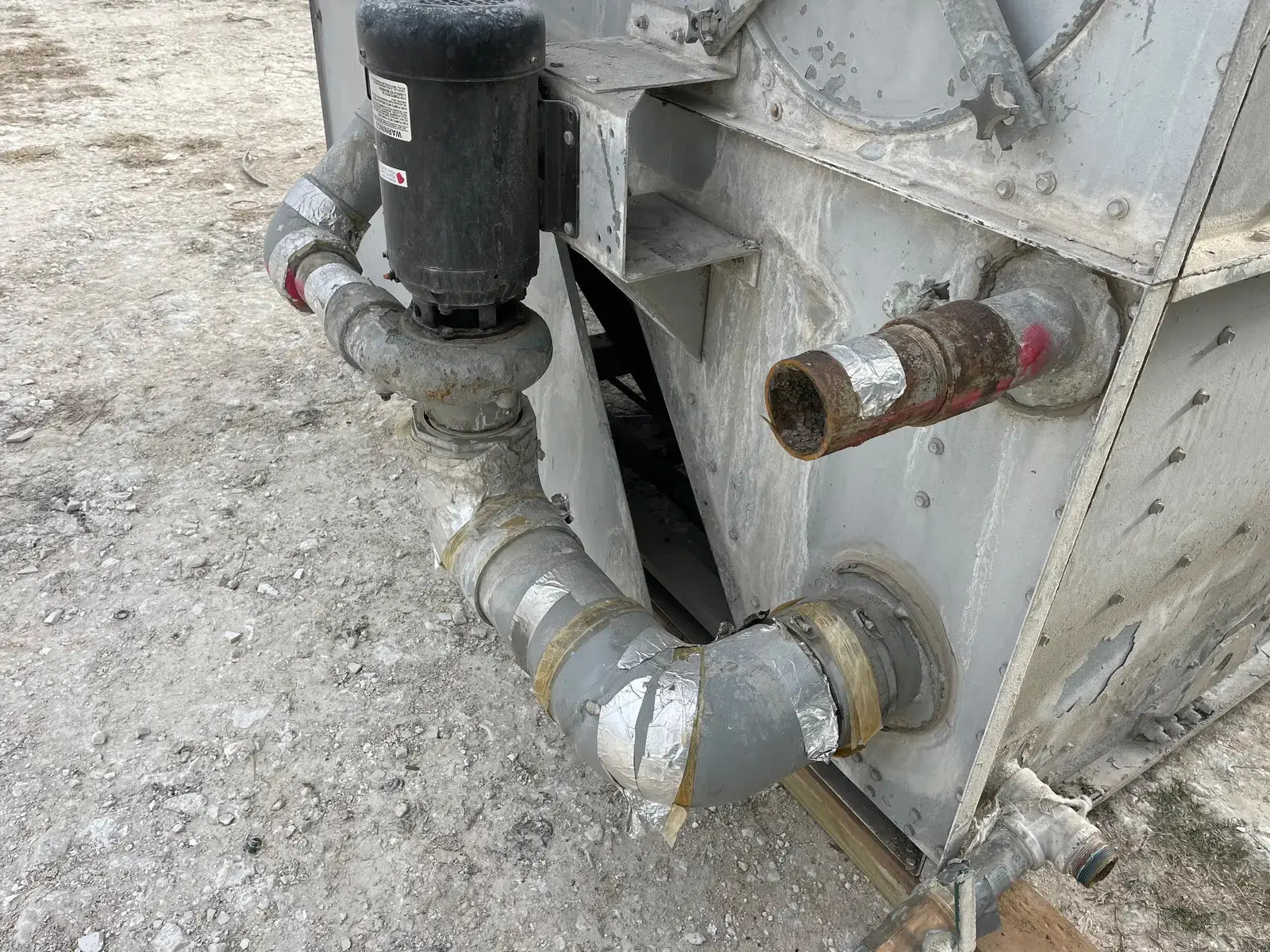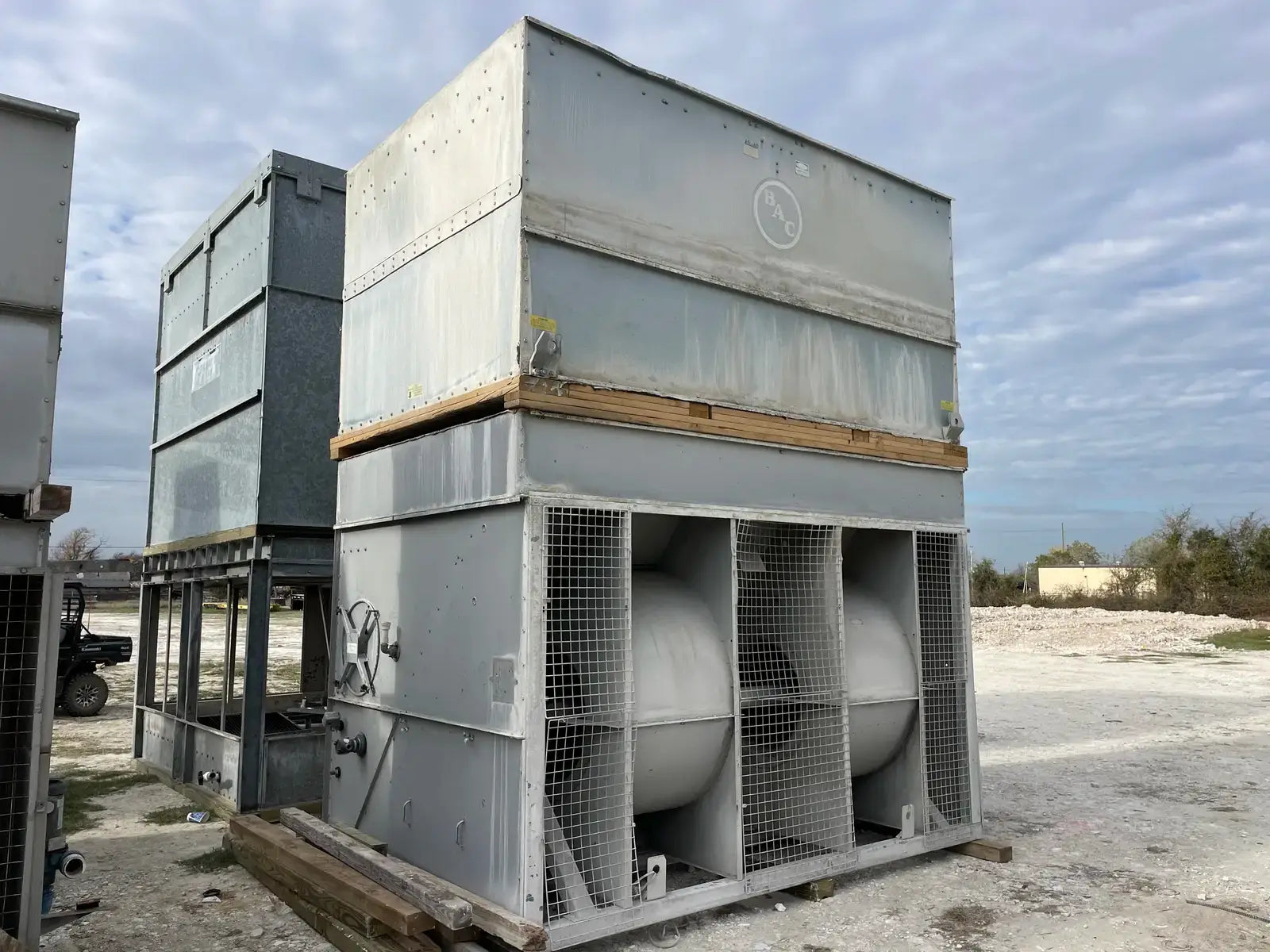 Condensador evaporativo BAC C1444-O (315 toneladas nominales, 2 motores, 1 unidad de torre) Número de serie: 92200983 Este paquete contiene 1 unidad de torre. Toneladas Nominales: 315. Toneladas de Amoníaco: 223 . Anteriormente funcionaba con Amoníaco (R-717). Se incluyen 2 motores.