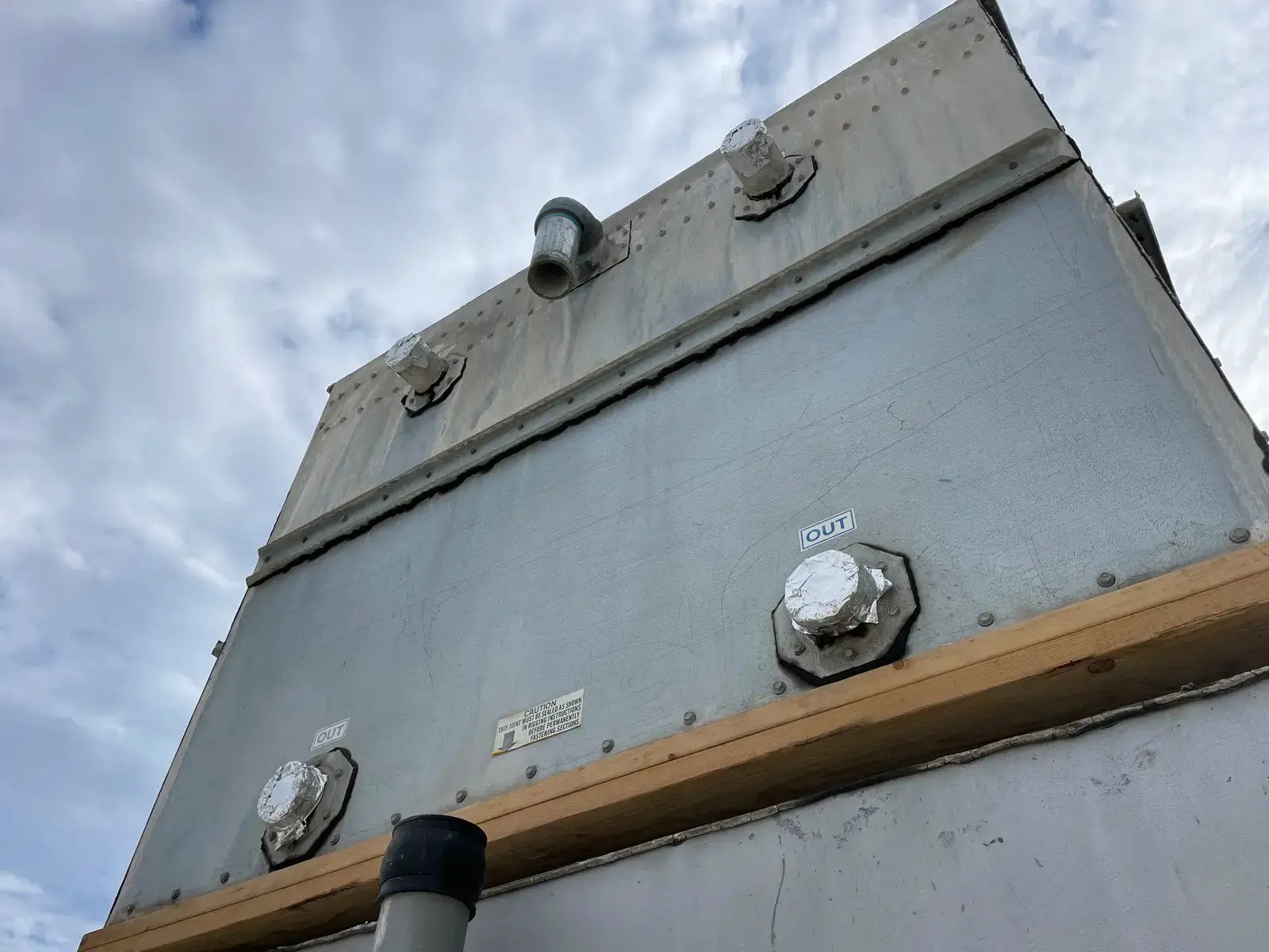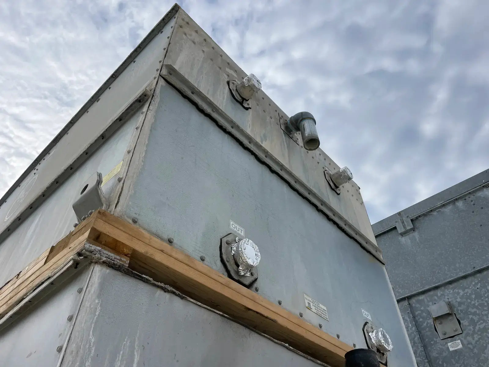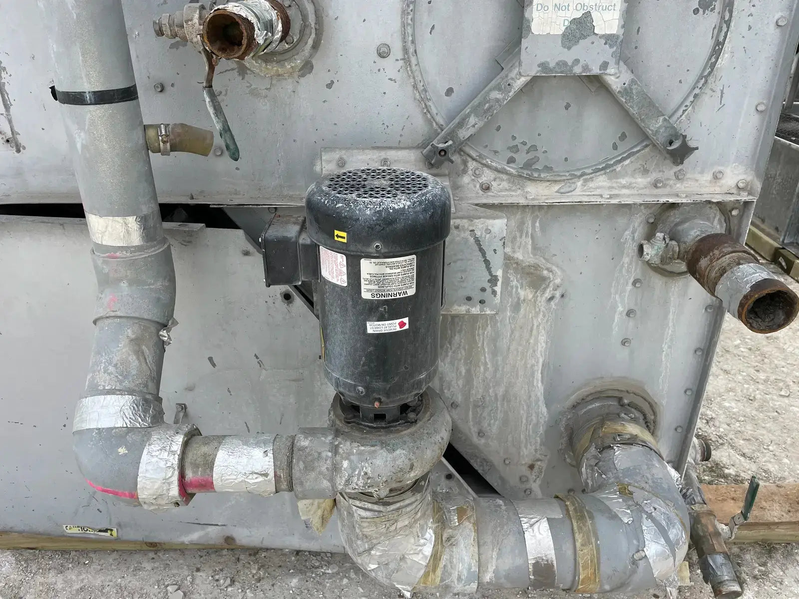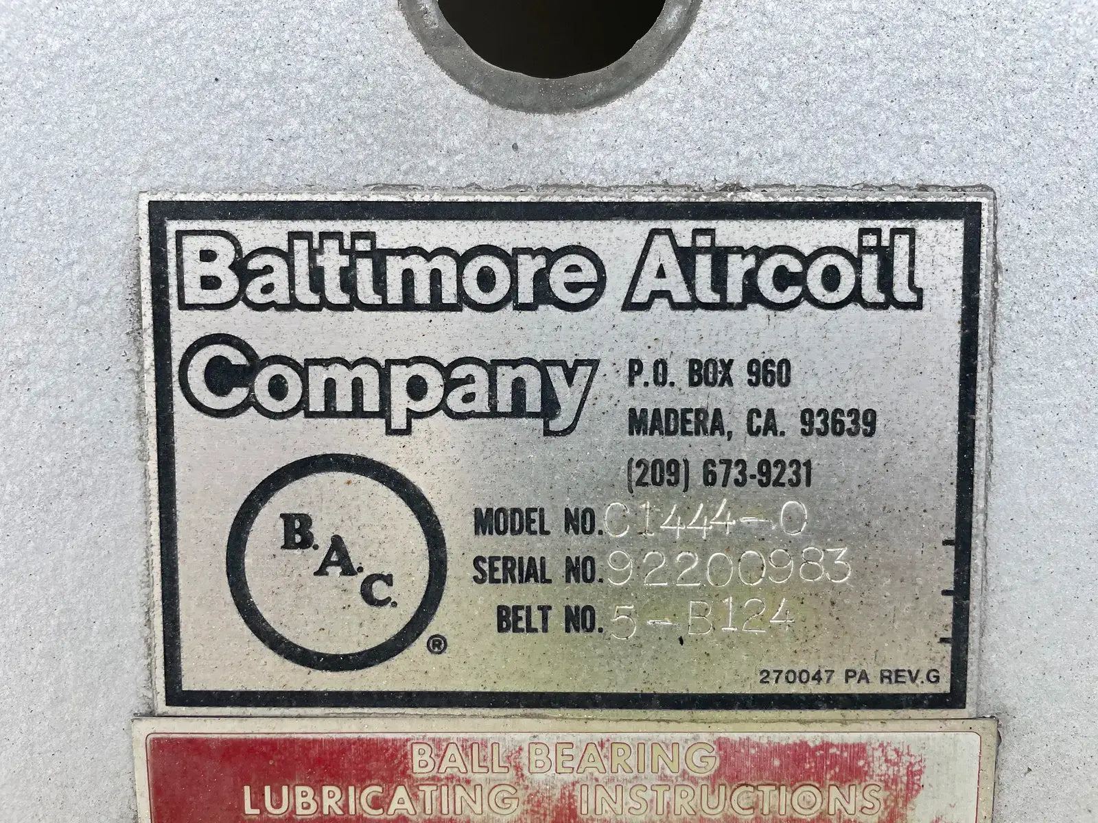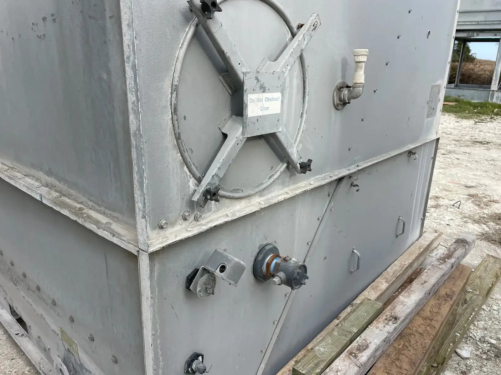 Condensador evaporativo BAC C1444-O (315 toneladas nominales, 2 motores, 1 unidad de torre) Número de serie: 92200983 Este paquete contiene 1 unidad de torre. Toneladas Nominales: 315. Toneladas de Amoníaco: 223 . Anteriormente funcionaba con Amoníaco (R-717). Se incluyen 2 motores.