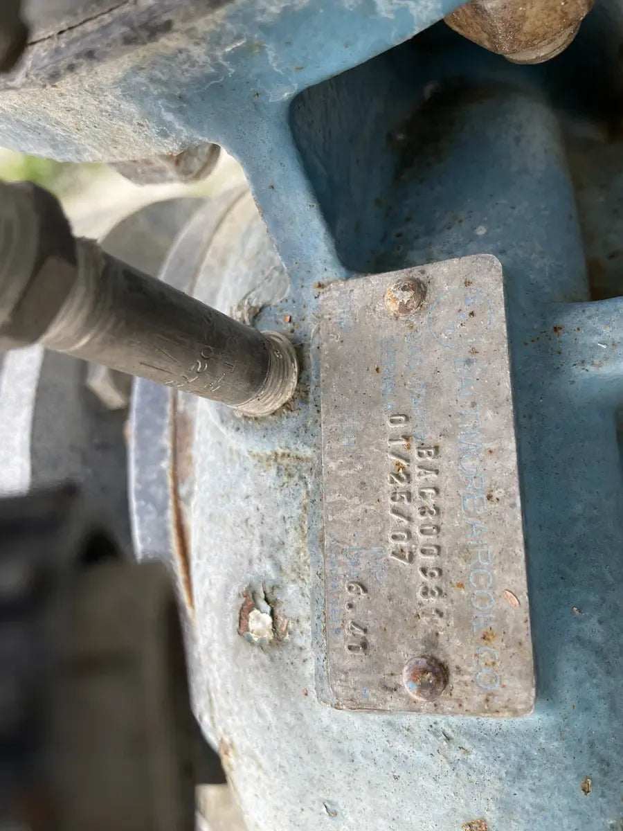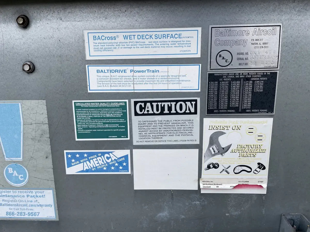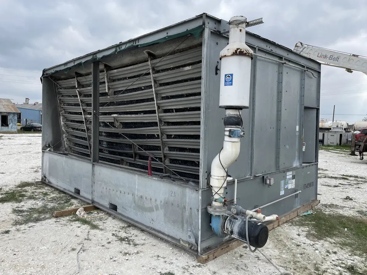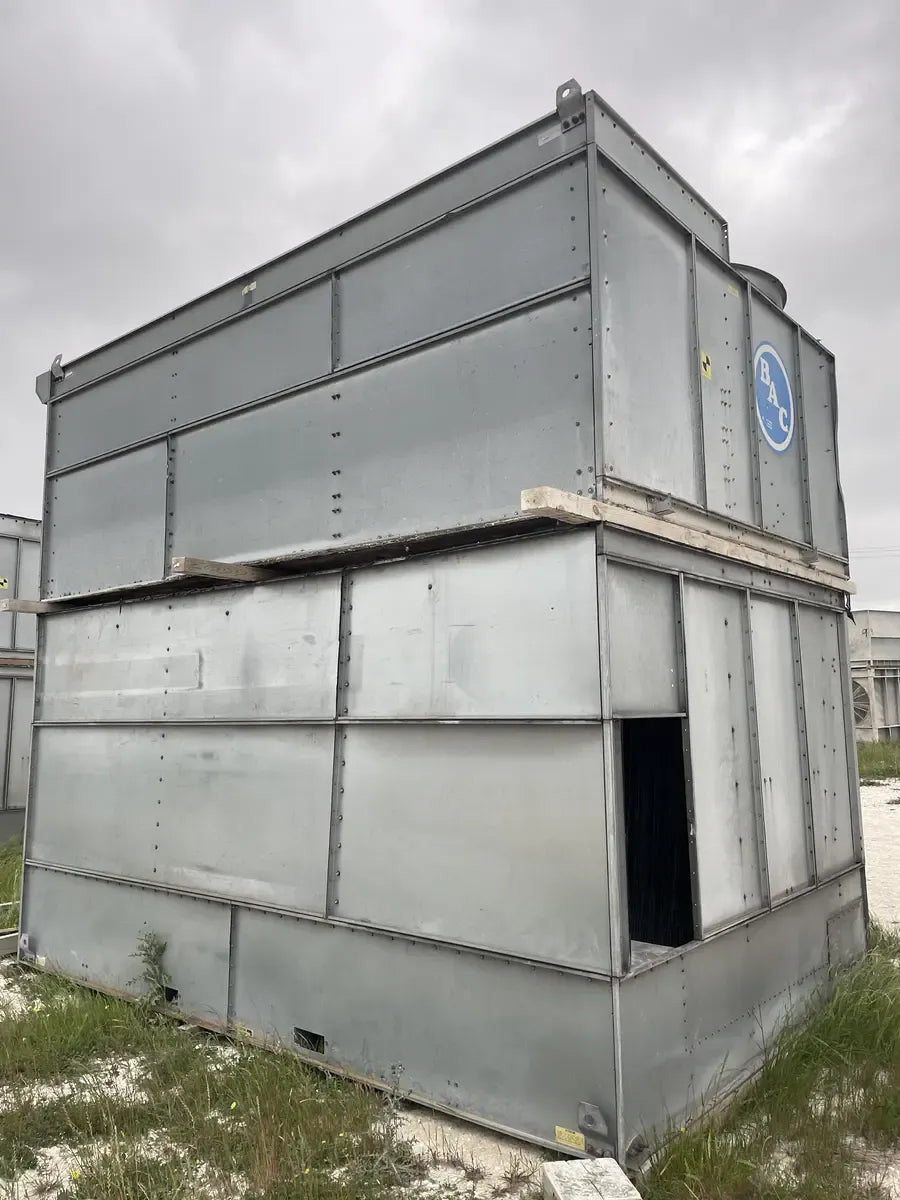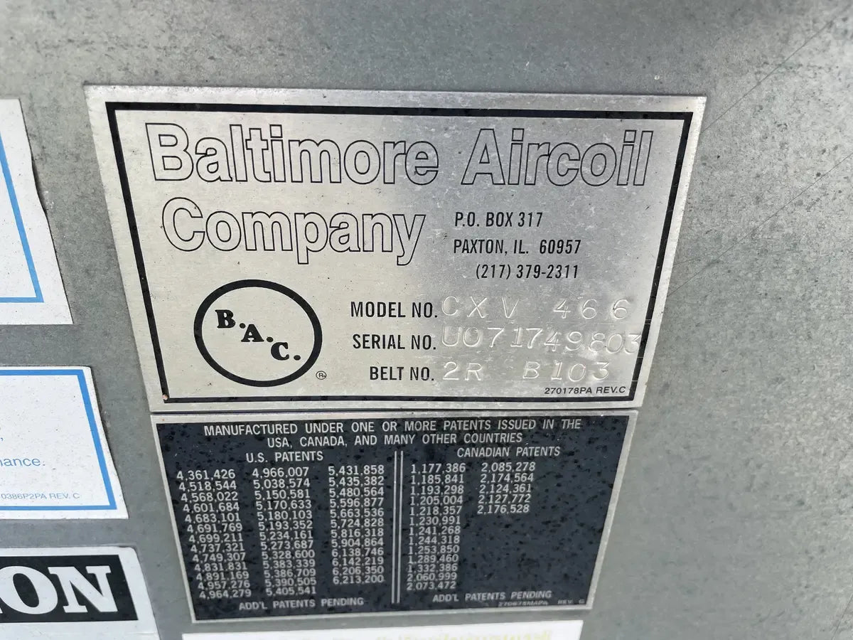 Condensador Evaporativo BAC CXV 466 (590 Toneladas Nominales, 1 Unidad de Torre). Número de serie: U071749803. Este paquete contiene 1 unidad de torre. 590 Toneladas Nominales. 466 Toneladas de Amoníaco. Anteriormente funcionó con amoníaco (R717 | NH3).