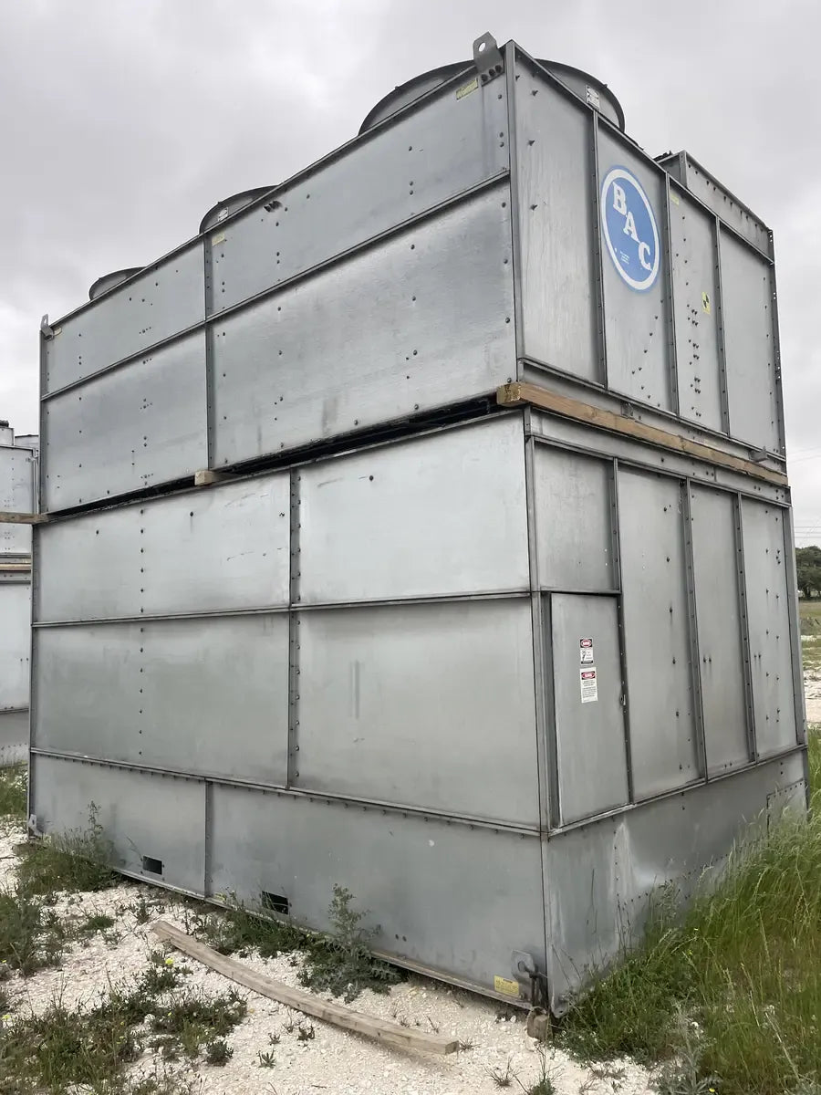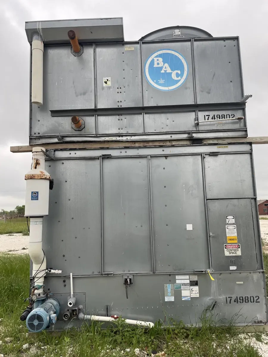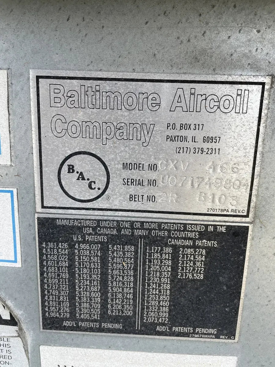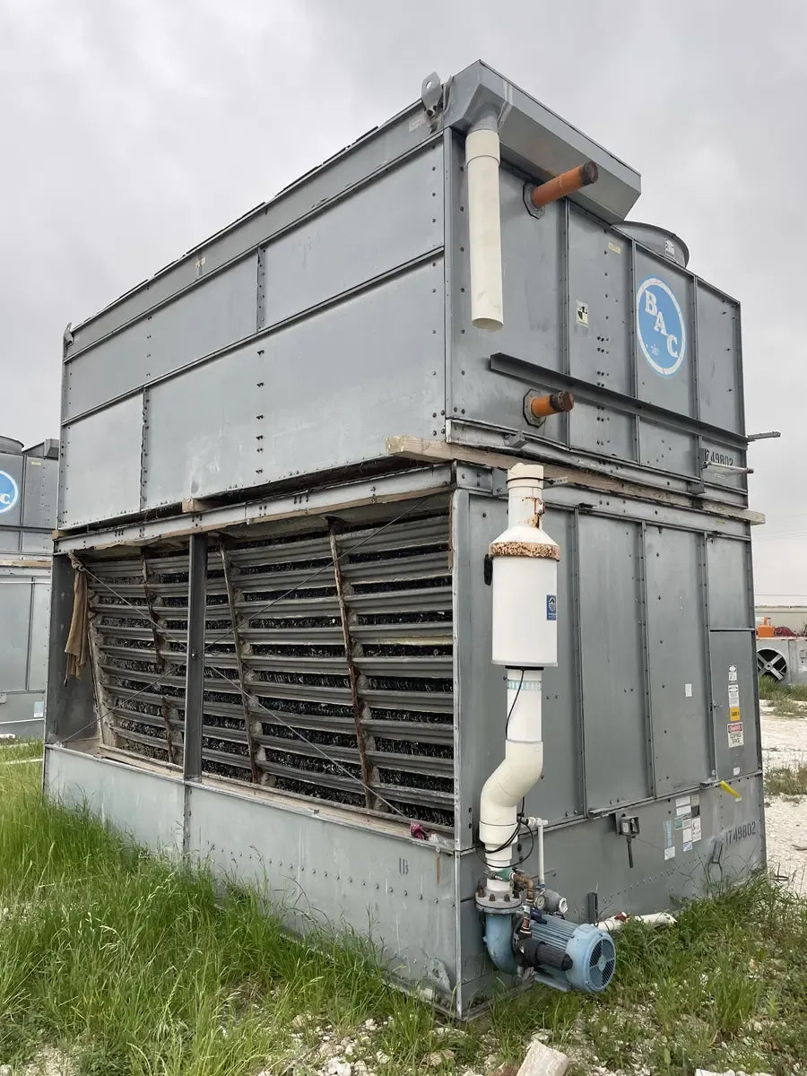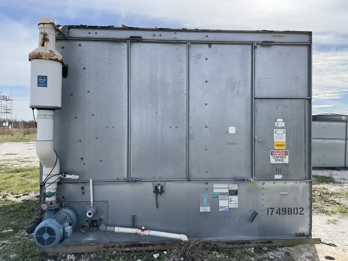 Condensador Evaporativo BAC CXV 466 (590 Toneladas Nominales, 3 Motores, 1 Unidad de Torre). Número de serie: U071749804. Este paquete contiene 1 unidad de torre. 590 Toneladas Nominales. 466 Toneladas de Amoníaco. Anteriormente funcionó con amoníaco (R717 | NH3). Se incluyen motores de 3 HP.