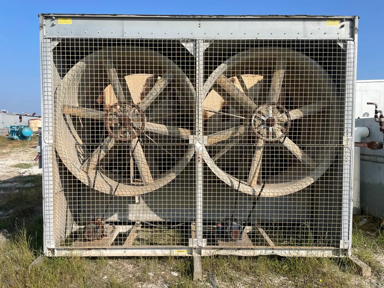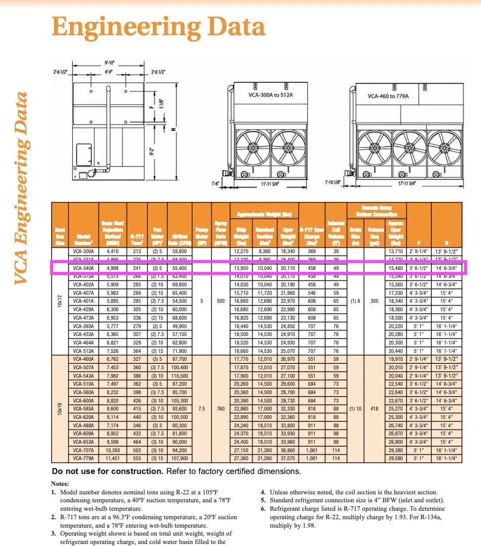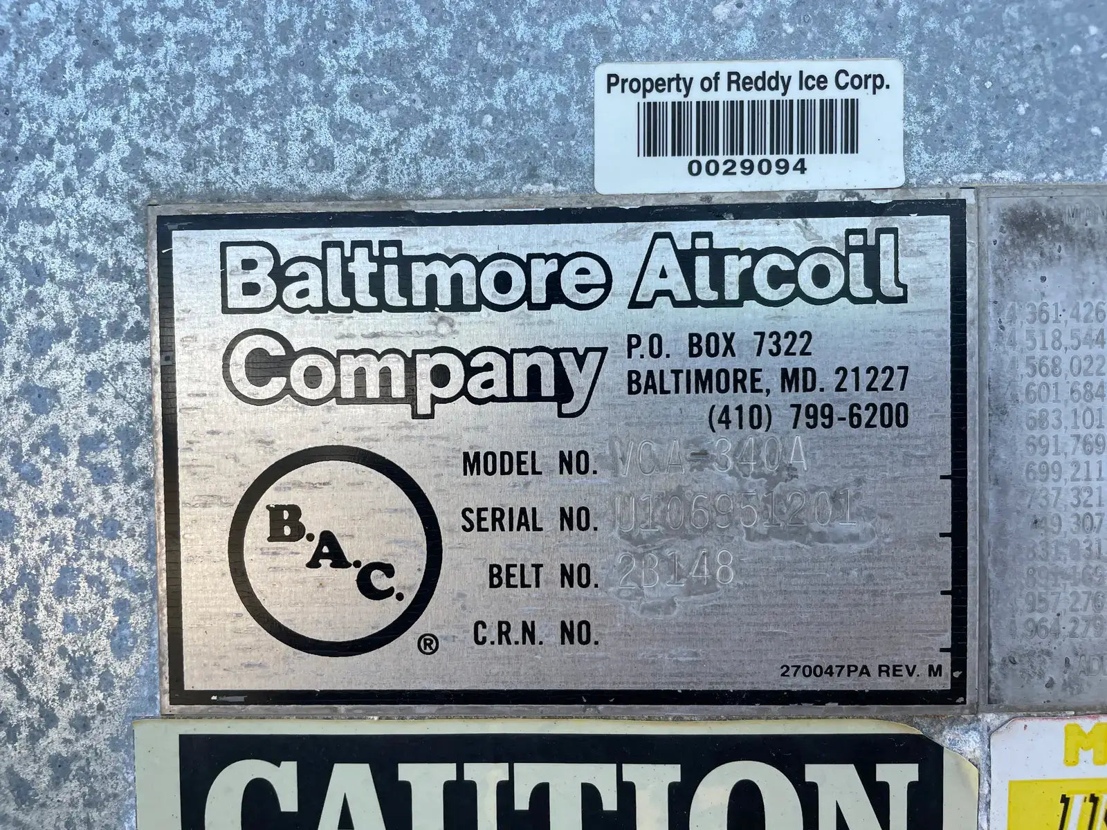Condensador evaporativo de unidad de una torre BAC VCA-340A. Modelo: VCA-340A. Número de serie: U106951201. Número de cinturón: 2B148. Toneladas nominales: 340. Amoníaco (R-717): 241. Flujo de aire (CFM): 55,440. Volumen del serpentín interno: 49 pies. Rechazo de calor base (MHB): 4998. Motores de ventilador (2): 5 HP. Motor de bomba(1): 5 HP. Tamaño de la caja NOM: 10X12.