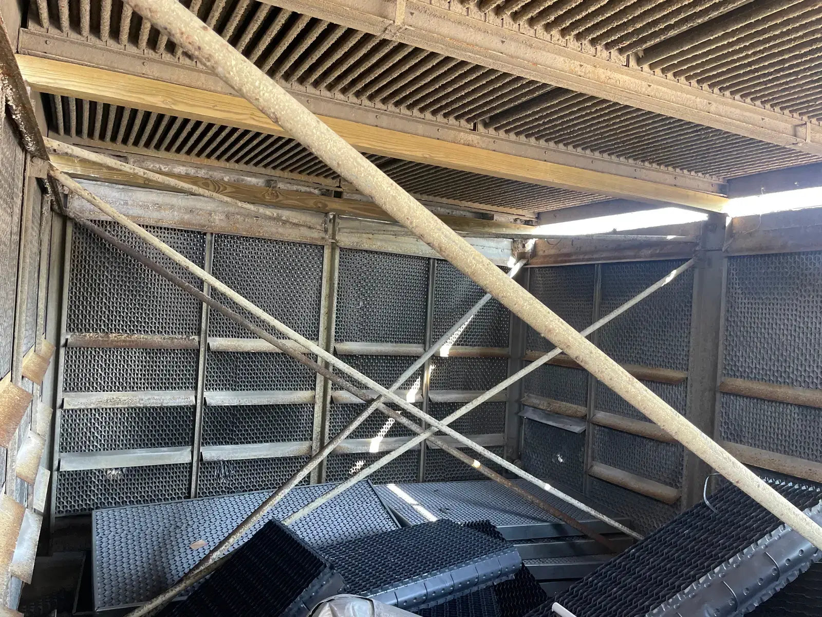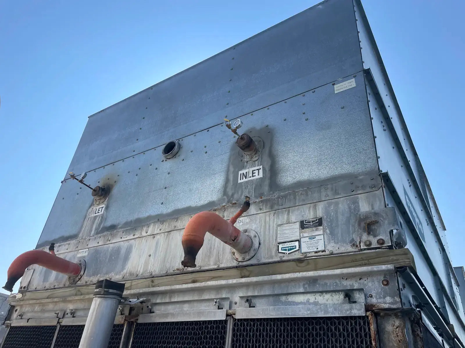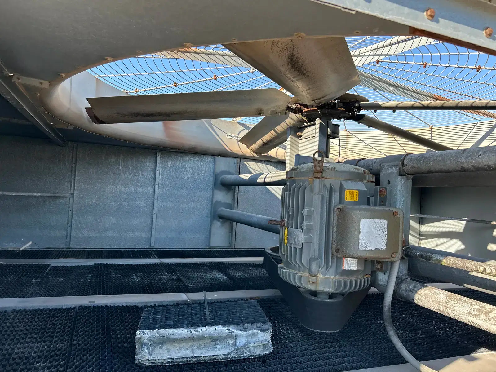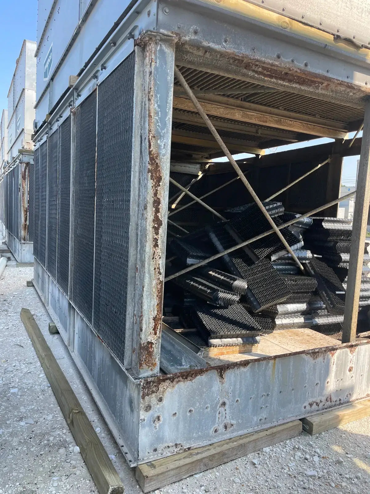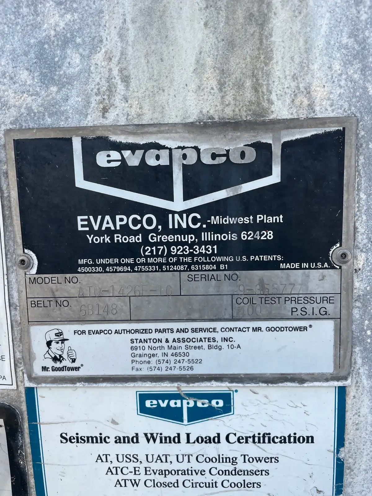 Condensador evaporativo Evapco. Modelo: ATC-1426E-1G. Número de serie: 9-355777. Este paquete contiene (1) unidad de torre. 713 toneladas nominales. 506 toneladas de amoníaco. Anteriormente funcionaba con amoníaco (R-717). Se incluyen 2 motores. Anteriormente se combinaban como un paquete.