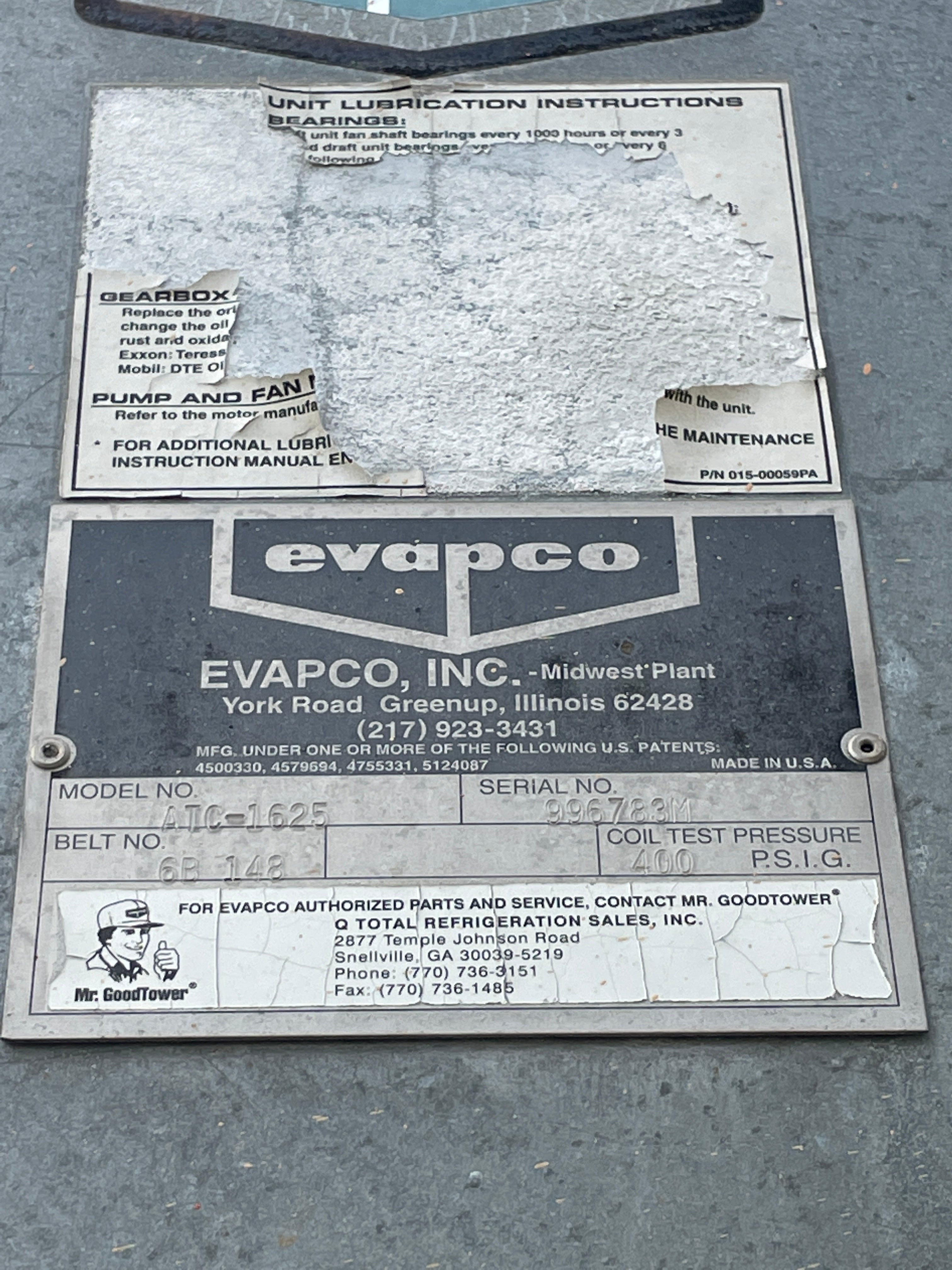 Condensador evaporativo Evapco ATC-1625 (812,5 toneladas nominales, motor de 1-30 HP, 2 unidades de torre)