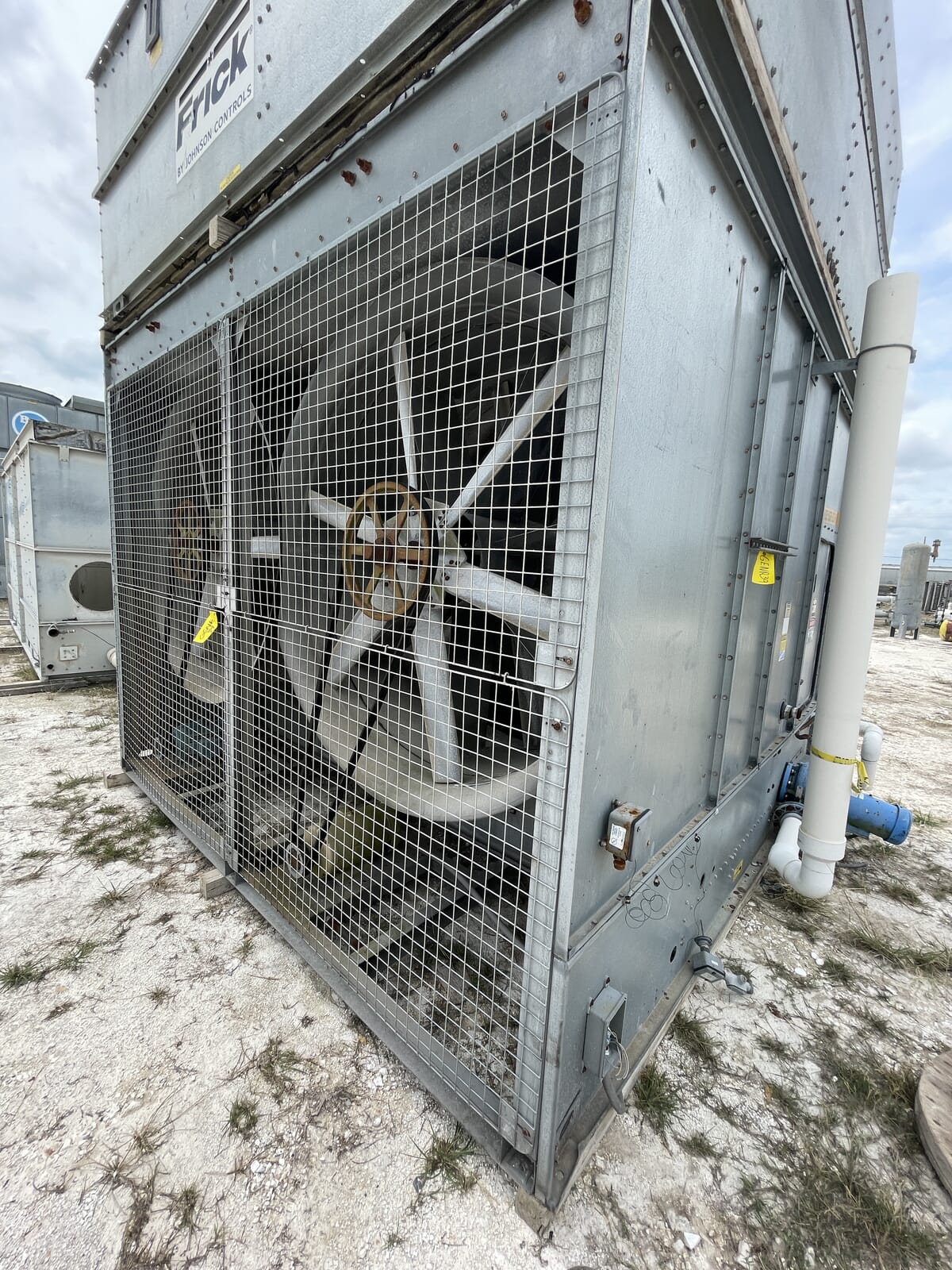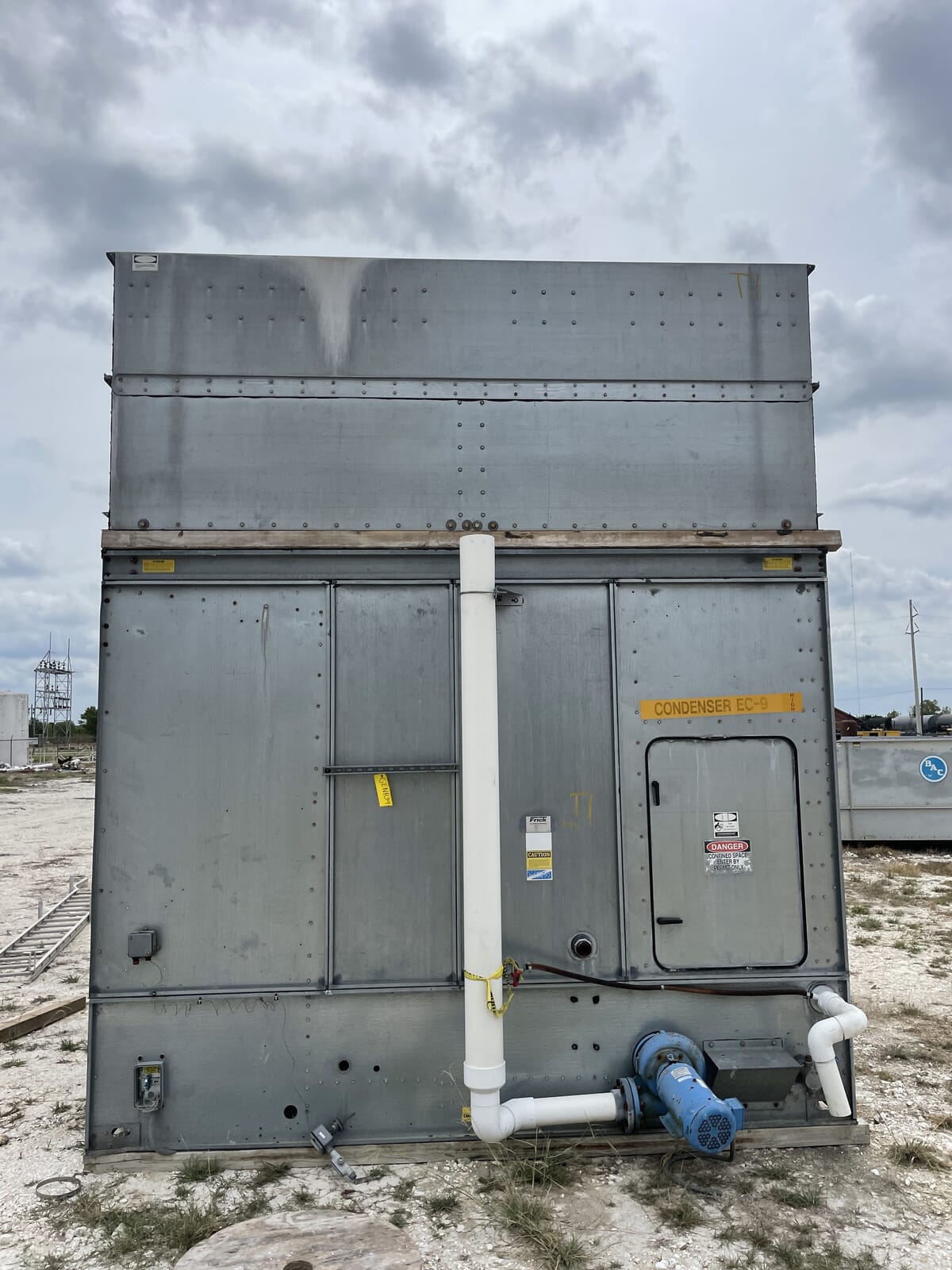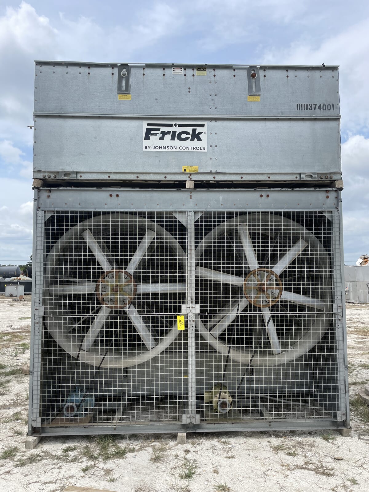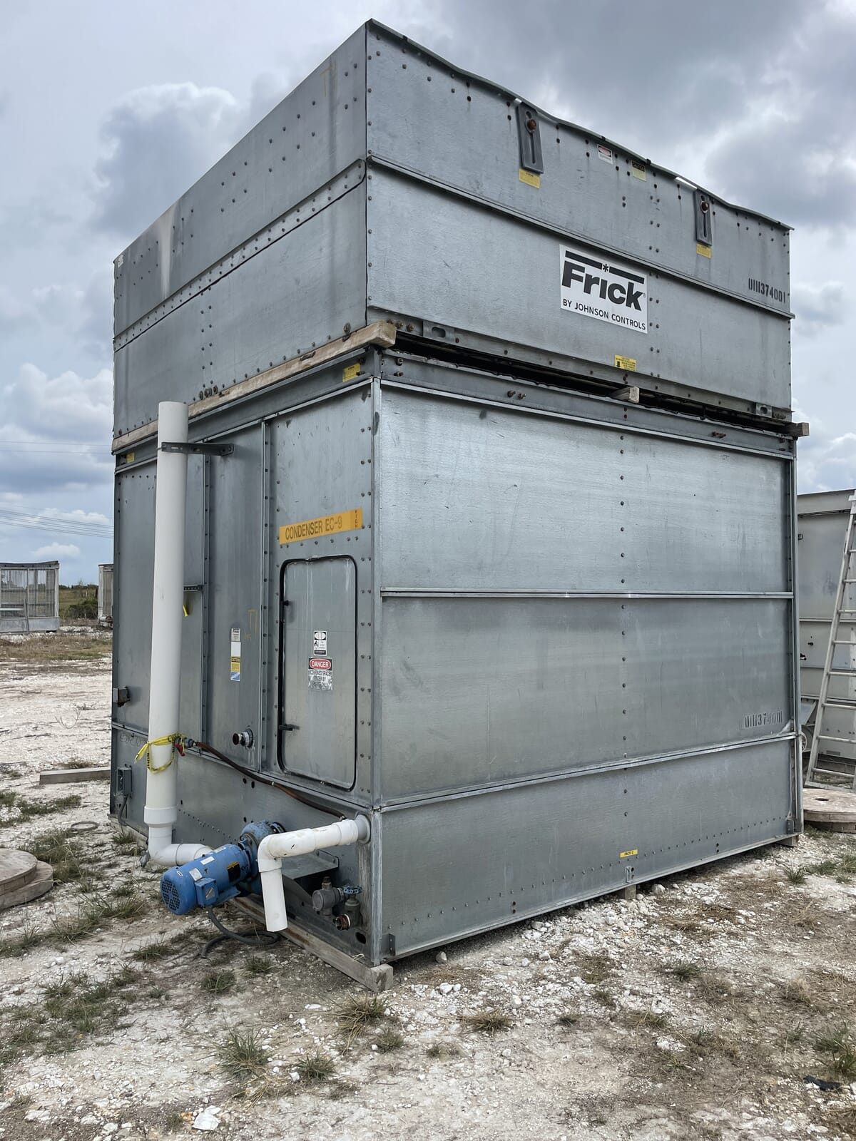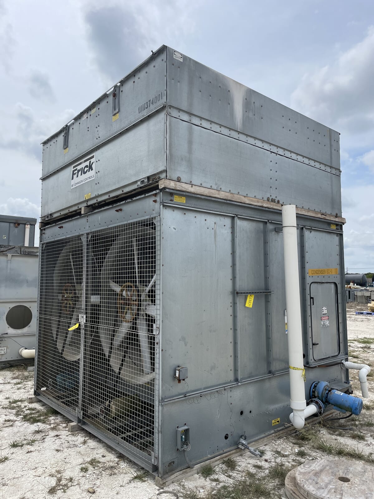 Condensador Evaporativo Frick VCA-404A (404 Toneladas Nominales, 2 Motores de 10 HP, 1 Unidad de Torre). Número de serie: U111374001. Este paquete contiene 1 unidad de torre. 404 Toneladas Nominales. 287 toneladas de amoníaco. Anteriormente funcionó con amoníaco (R717 | NH3). Se incluyen motores de 2 a 10 HP.
