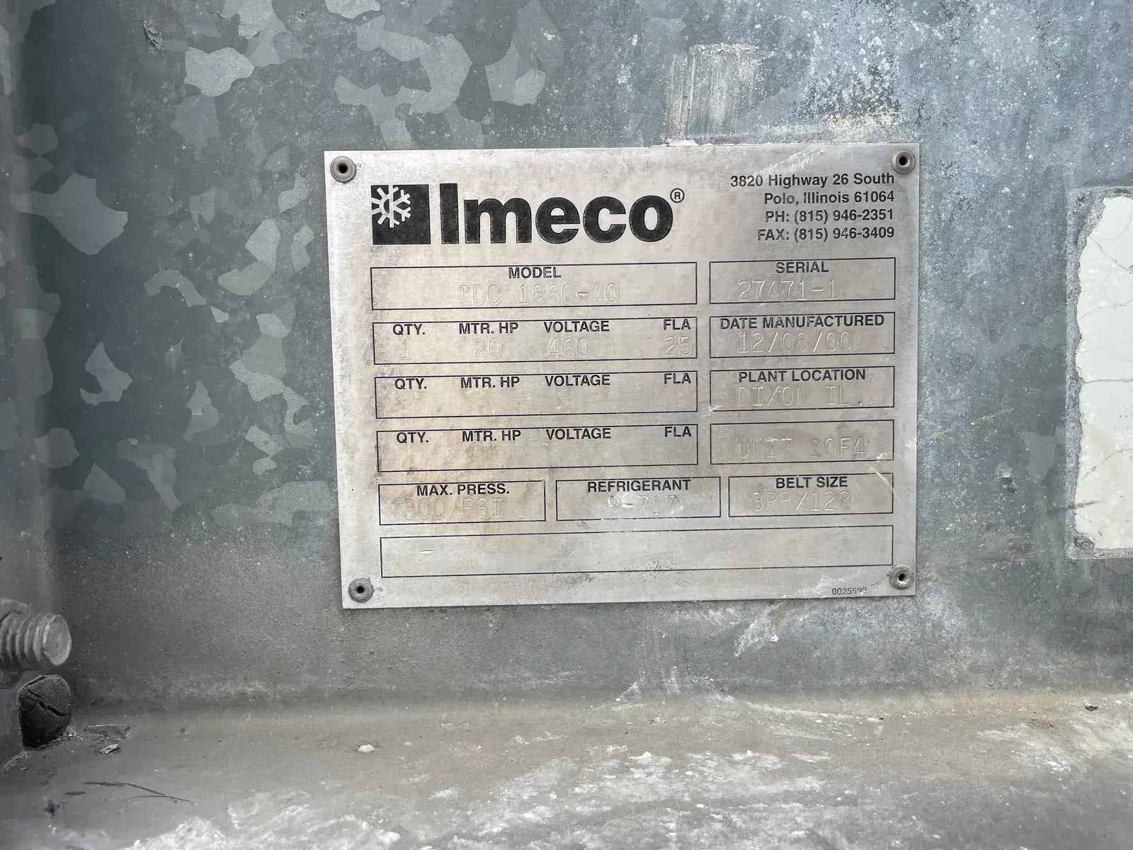 Condensador Evaporativo Simple Imeco. Modelo: IDC-1880-4Q. Número de serie: 27471-1. Toneladas Nominales: 470 TR. Toneladas de amoniaco: 333,25 TR. Presión máxima: 300 PSI. Refrigerante anterior: R-717. Tamaño del cinturón: 3RBX128. Fecha de fabricación: 08/12/00.
