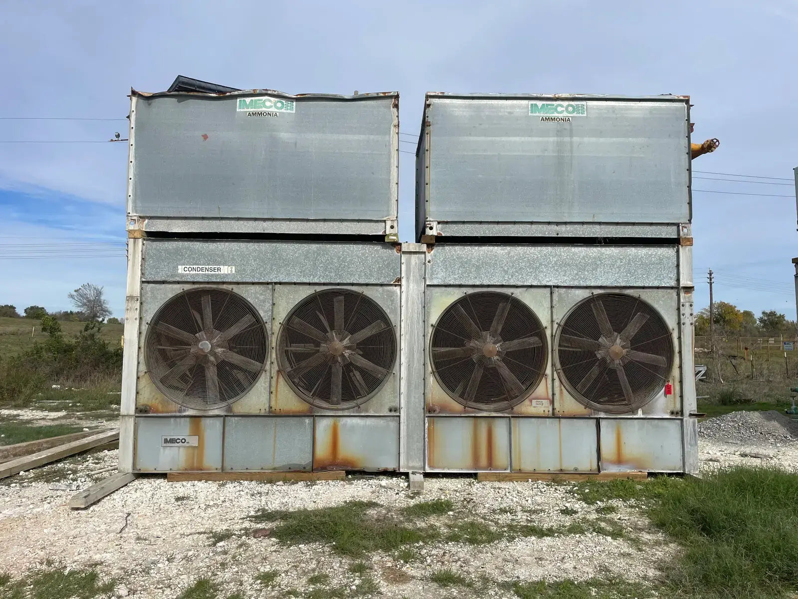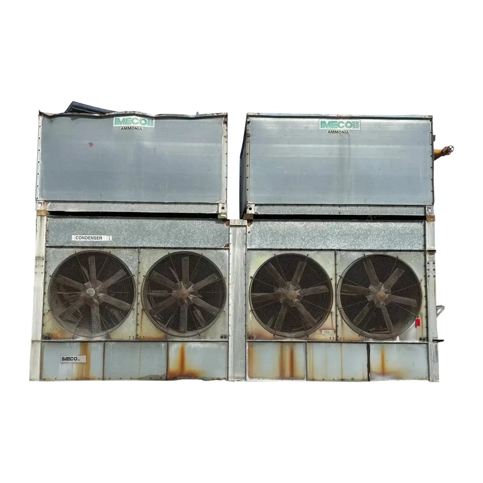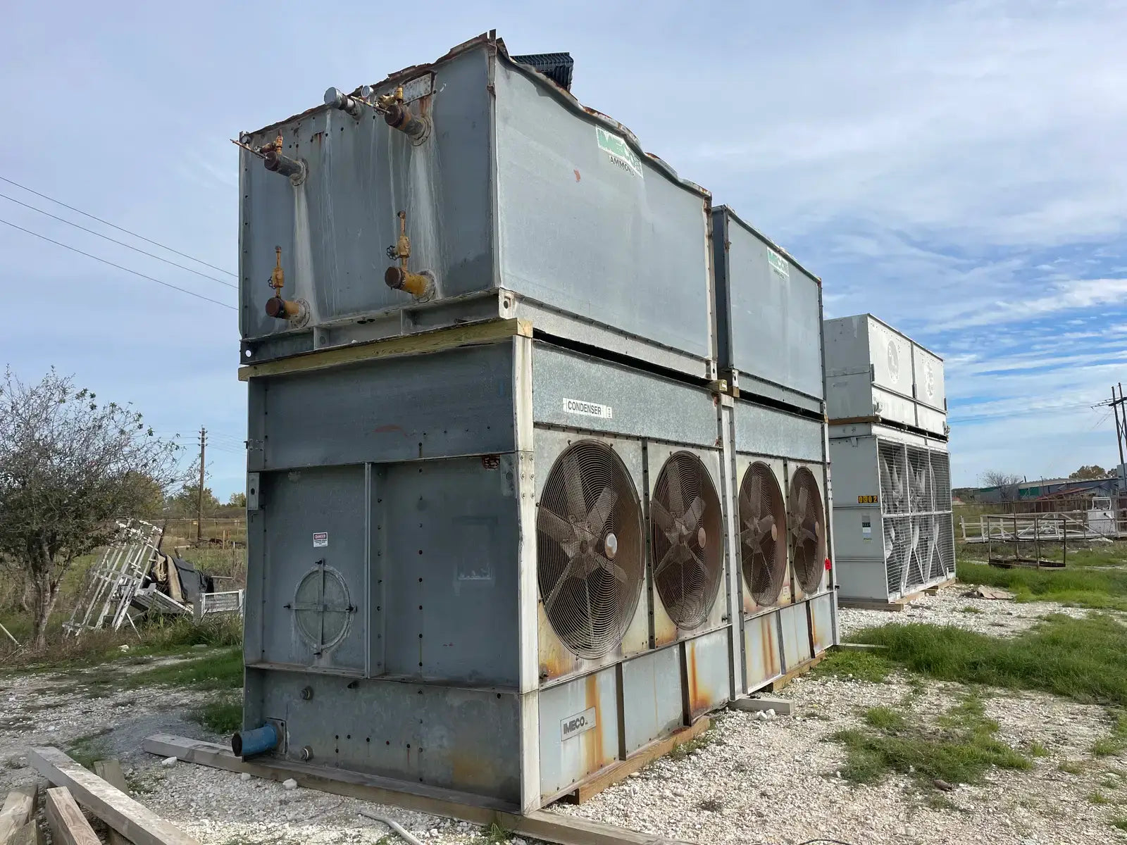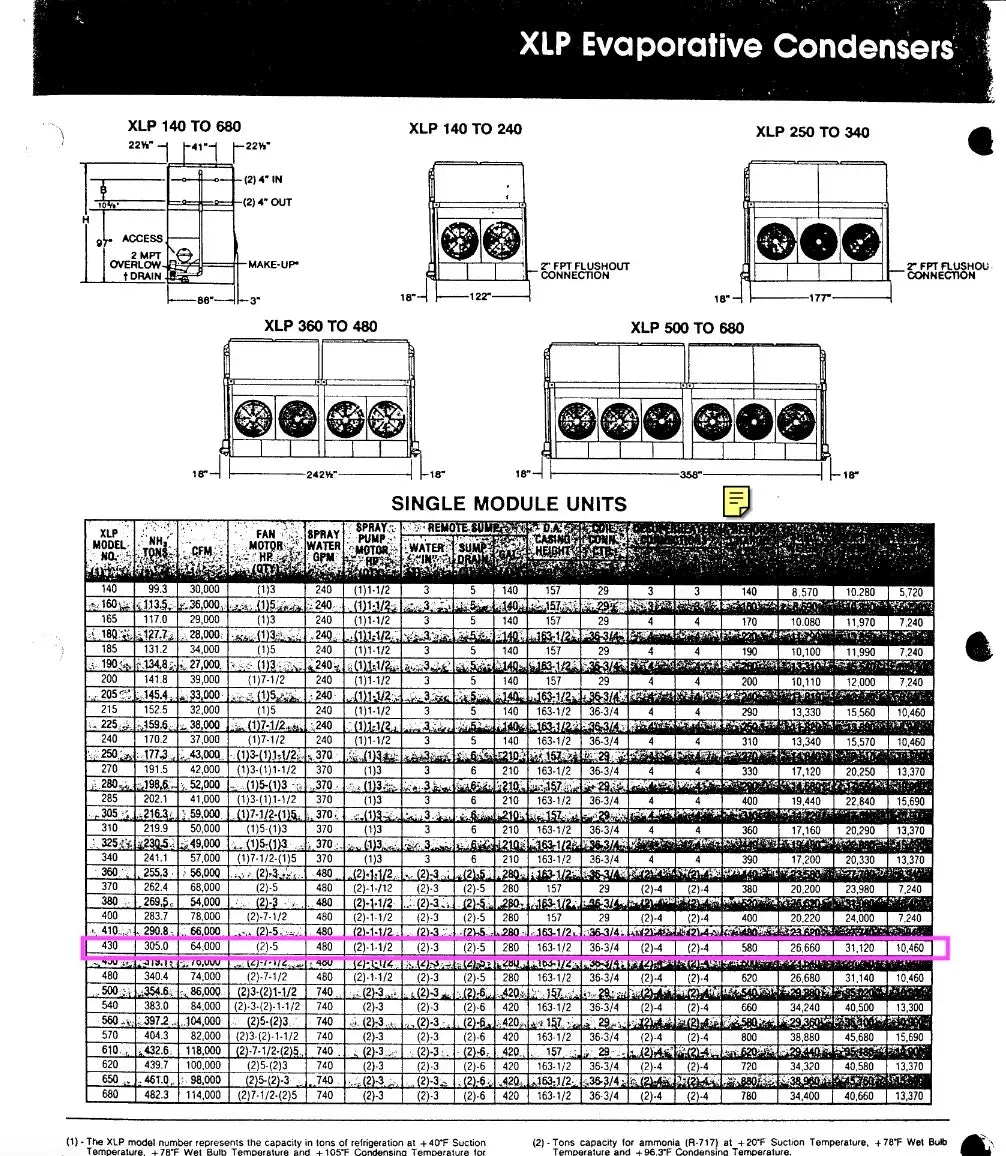 Condensador Evaporativo Imeco. Modelo: XLP430. Número de serie: 4551.1. Toneladas Nominales: 430. Comparte una base inferior con dos secciones en la parte superior.
