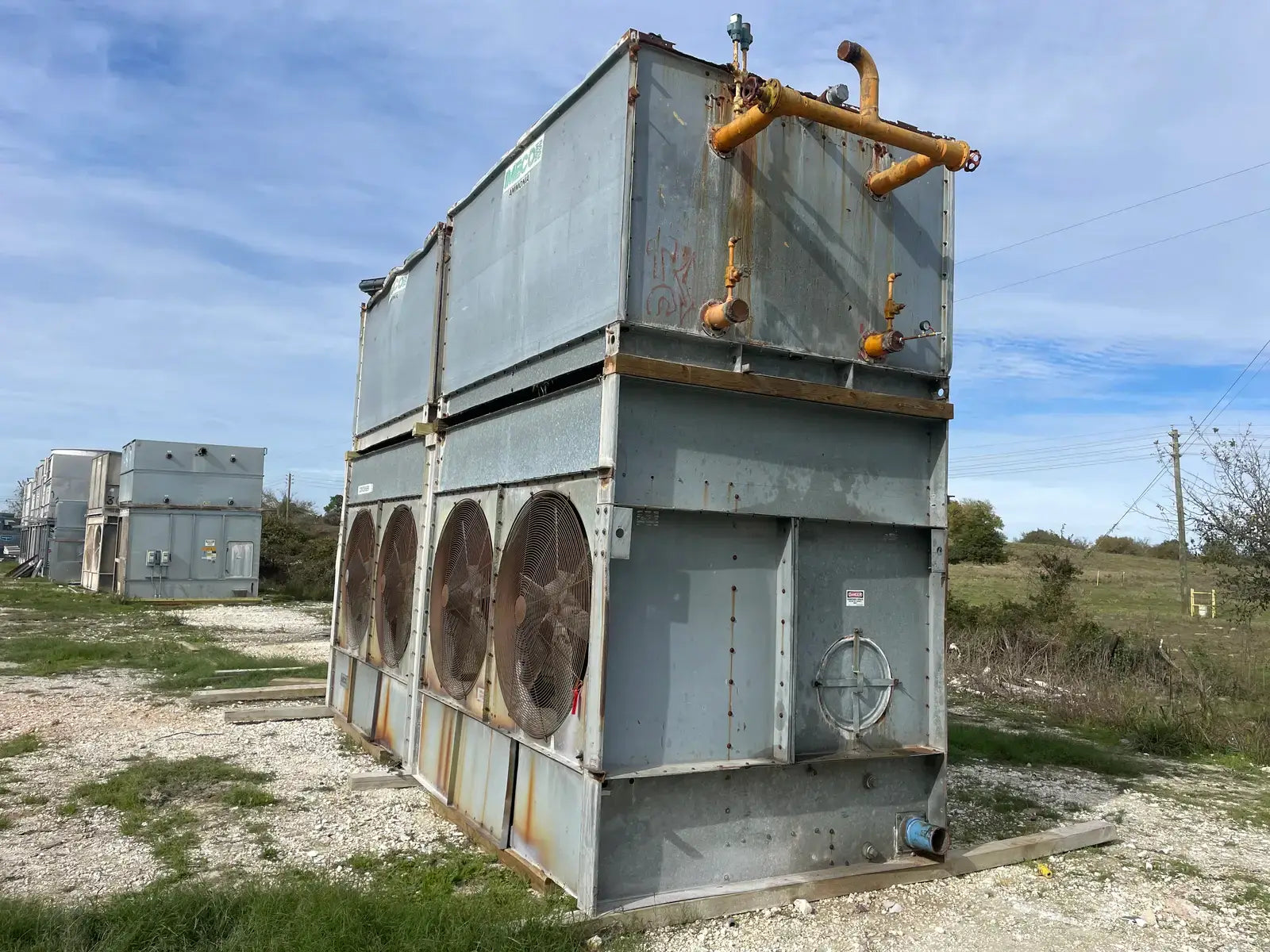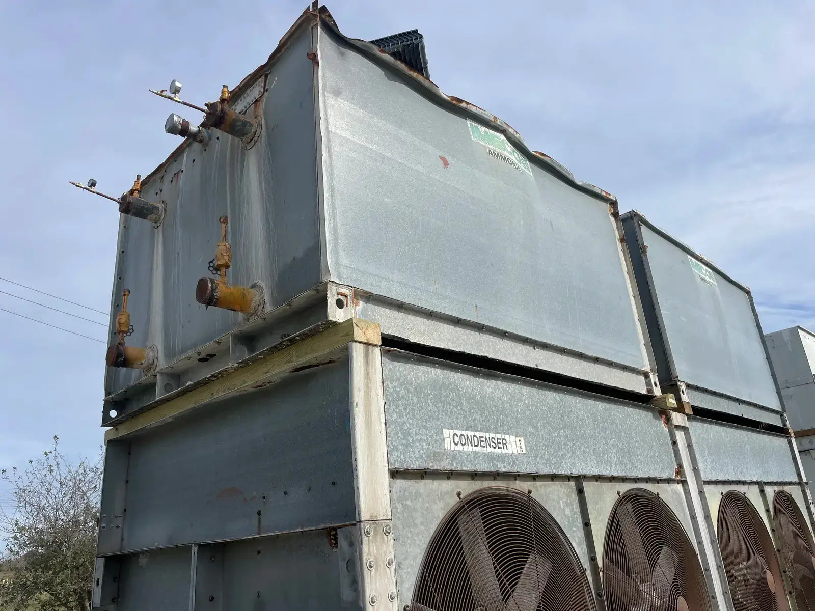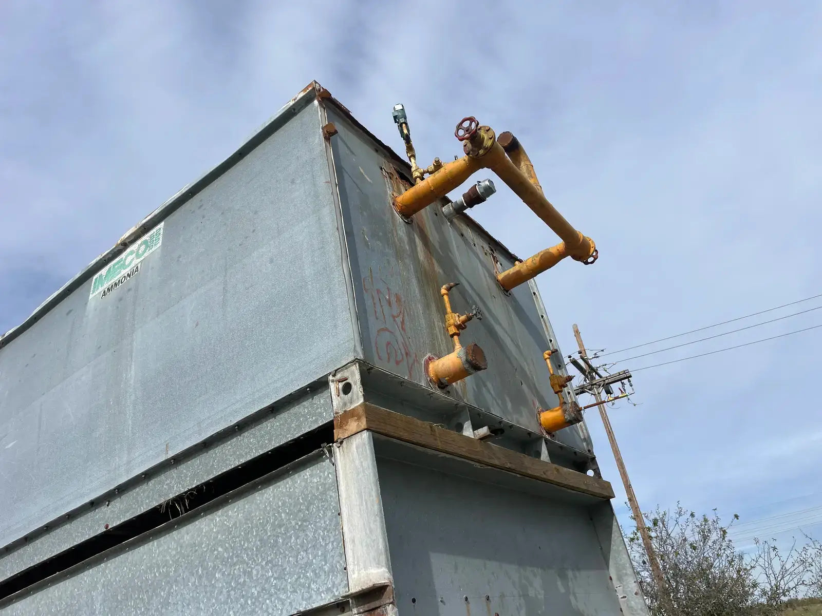 Condensador Evaporativo Imeco. Modelo: XLP430. Número de serie: 4551.1. Toneladas Nominales: 430. Comparte una base inferior con dos secciones en la parte superior.