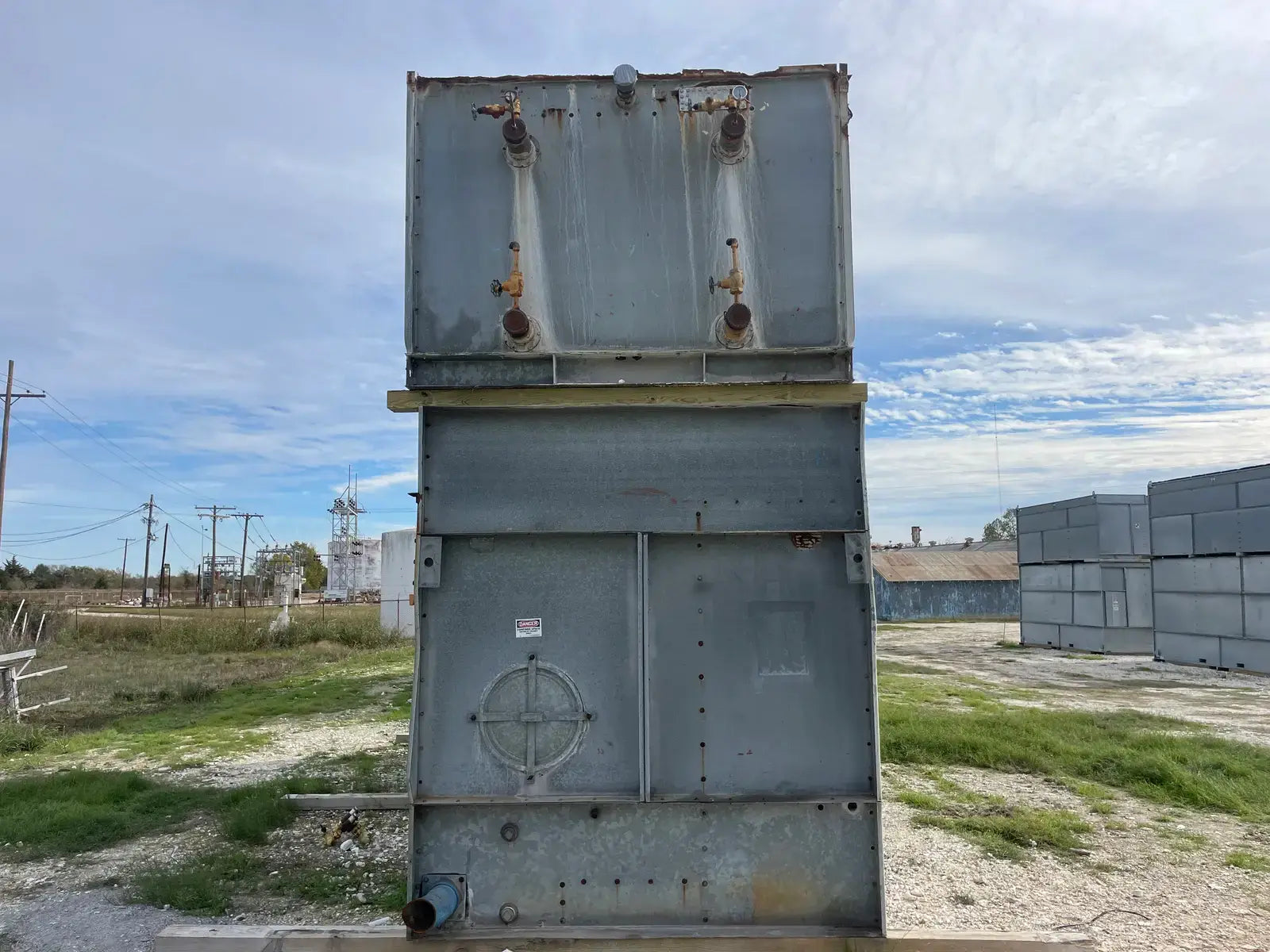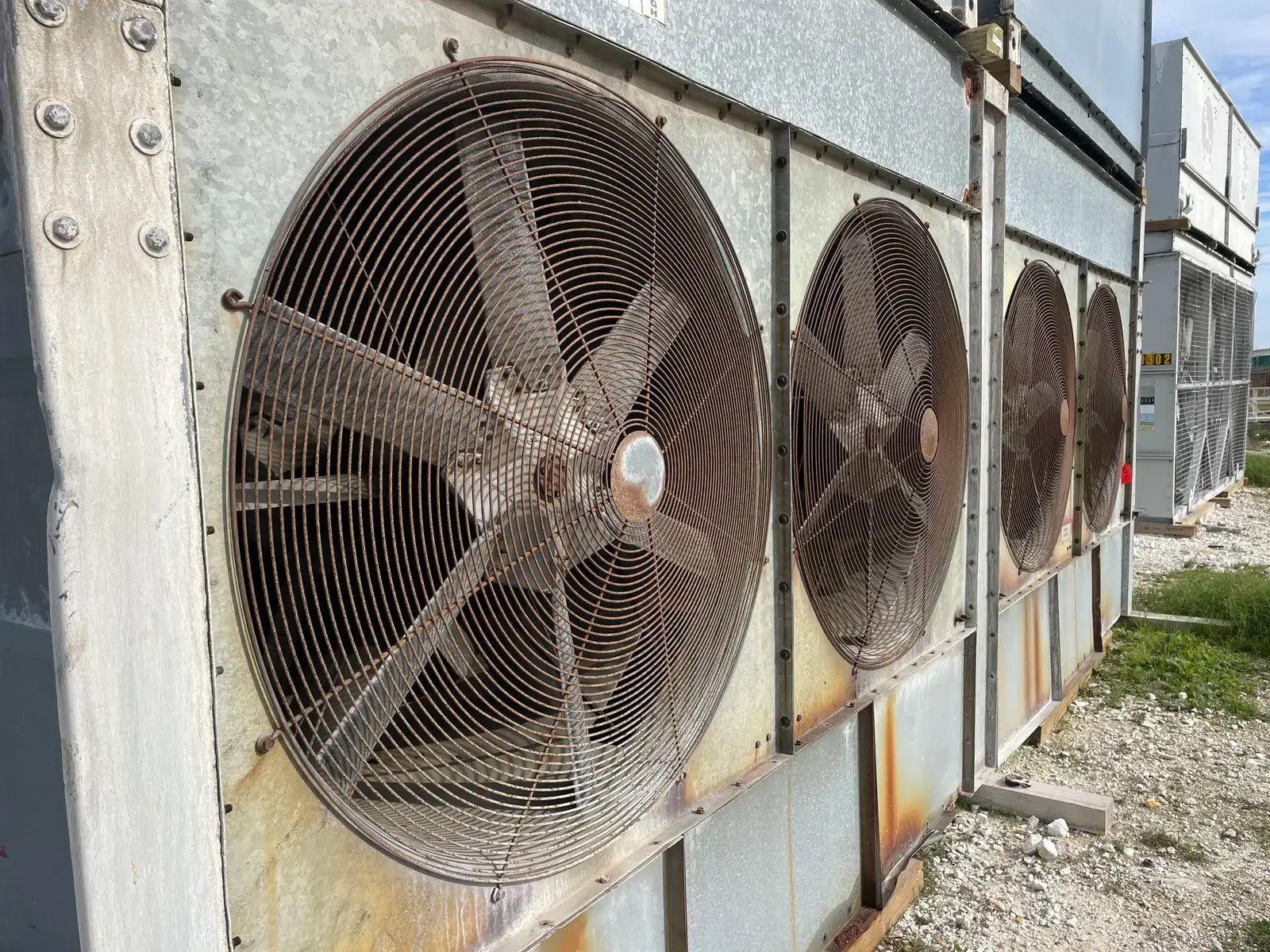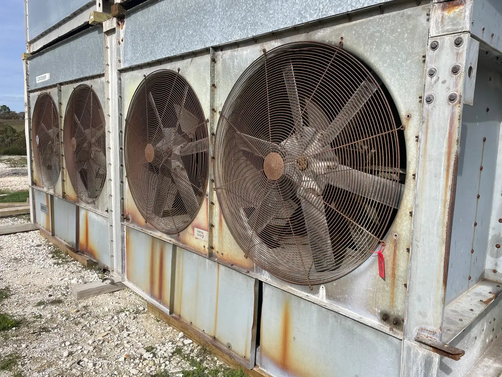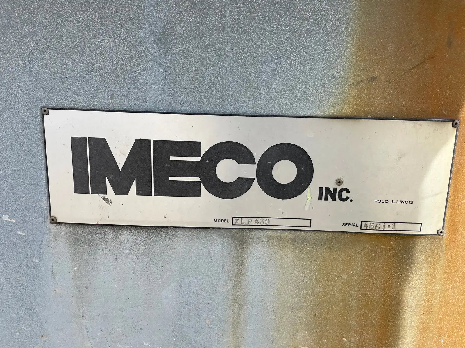 Condensador Evaporativo Imeco. Modelo: XLP430. Número de serie: 4551.1. Toneladas Nominales: 430. Comparte una base inferior con dos secciones en la parte superior.