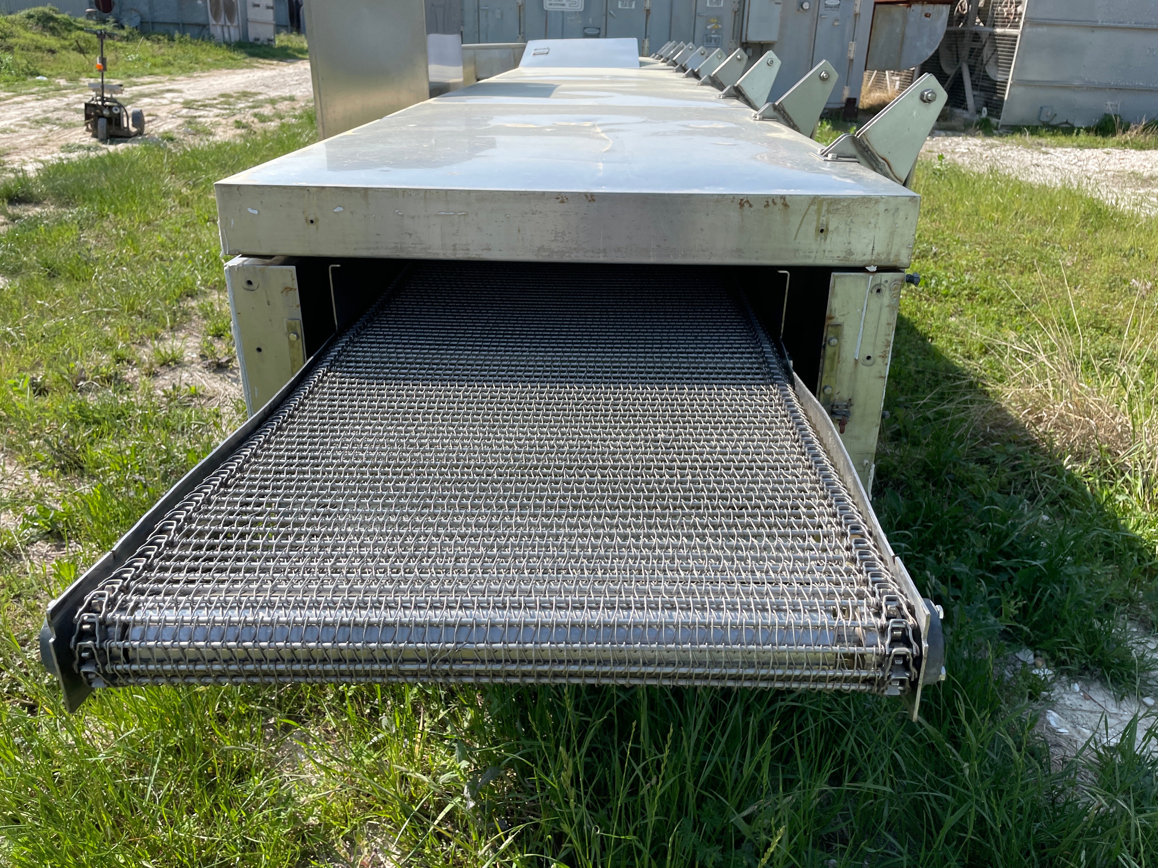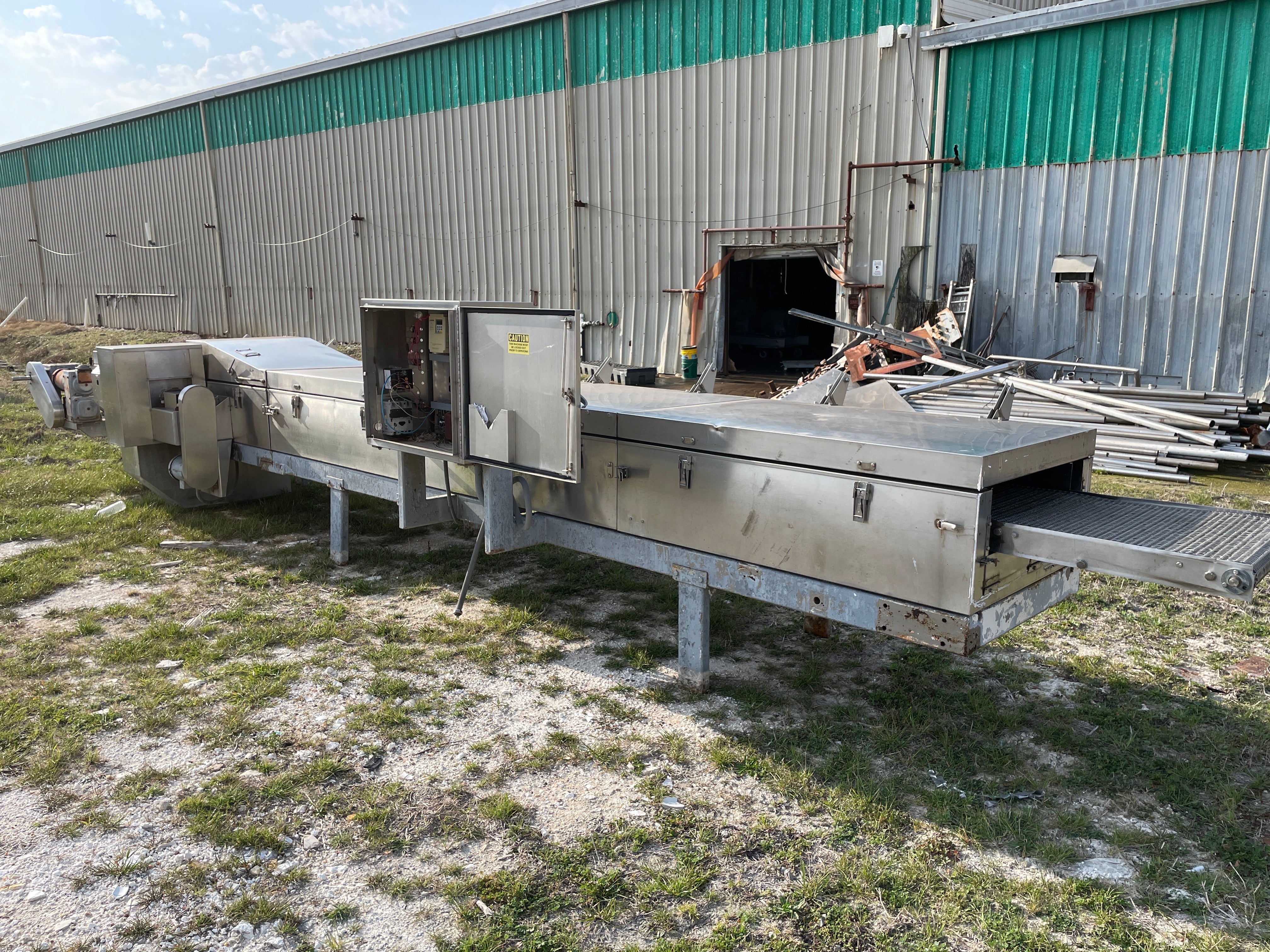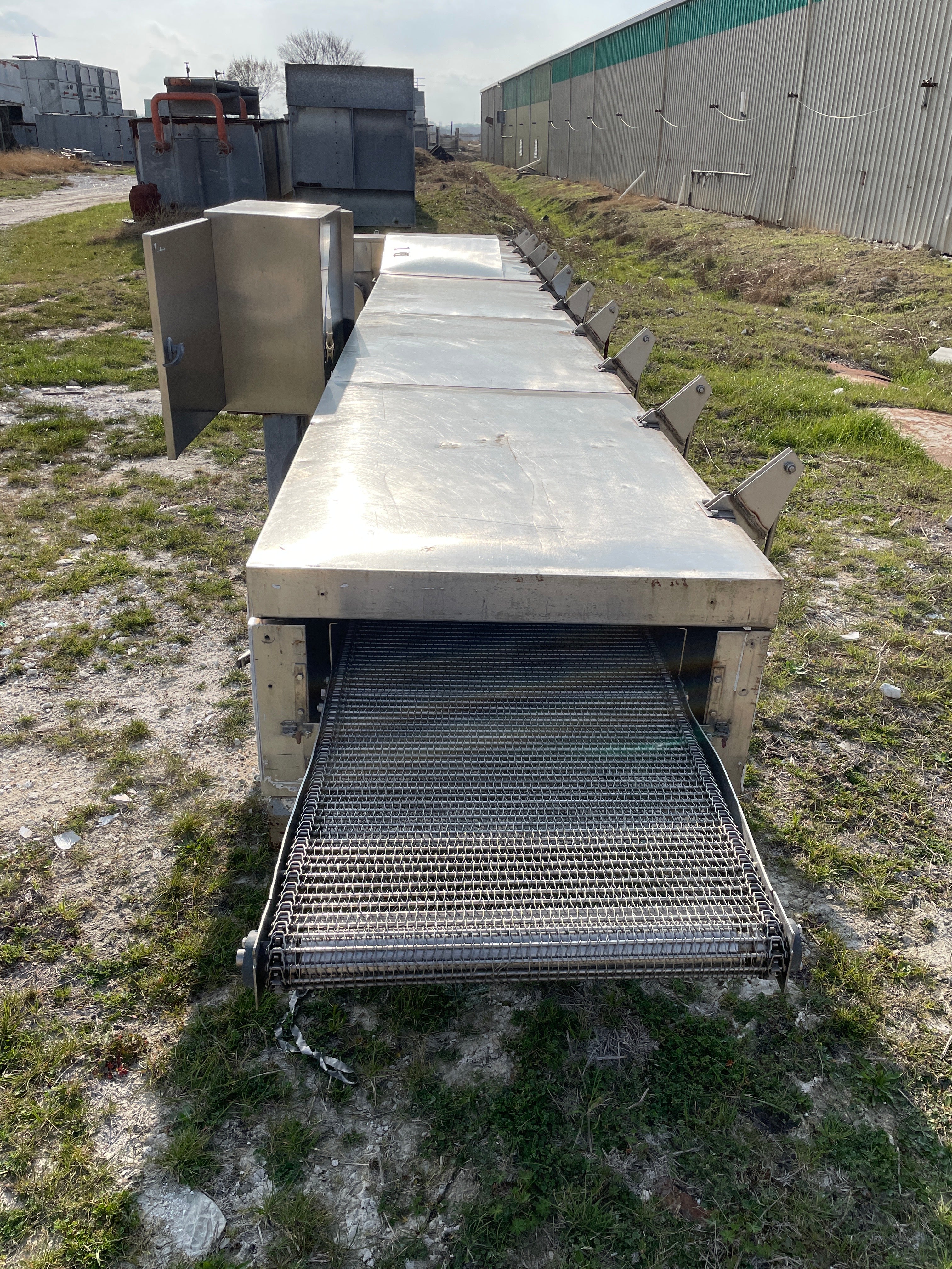 Congelador de túnel IQF de criotransferencia con sistemas de proceso integrados. Proceso de congelación instantánea con nitrógeno. Ventilador de distribución de aire frío forzado. Cinta transportadora de malla de acero inoxidable de 24 pulgadas de ancho. Espacio libre para producto de 2-1/2 pulgadas, longitud total de 27 pies. Cubiertas elevadoras asistidas por pistón. Motor de accionamiento Sterling Electric Lube Free y motor de accionamiento Speedtrol. Temperatura digital Honeywell GN2. control.