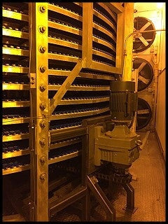 Congelador en espiral Cloudy & Britton. Trabajo de controles integrados: J990420. Correo postal: 2508-8391k. Tipo 4. Eléctrico: 460V, 60 Hz, trifásico. Material del cinturón: plástico azul. Ancho del cinturón: 35,5 pulgadas. Espacio libre de altura del producto: 3,5 pulgadas. Anteriormente utilizado con refrigeración con amoníaco para congelar diversos productos del mar (filetes y productos de valor agregado) en una planta Kosher. La aplicación anterior era de 7500-8500 LBS de porciones de salmón con piel de 6 oz por día de 10 horas (750-850 LBS/HR). La temperatura de entrada de la aplicación anterior era de +38 °F con una temperatura de salida de -10 °F a -12 °F. Otra aplicación anterior fue filetes de salmón de 6 oz a 1200 LBS/HR (+38F adentro, -12F afuera). Radio de la espiral: 10 pies. Dimensiones totales: 26 pies de ancho x 40 pies de largo x 12 pies 7,5 pulgadas de alto.