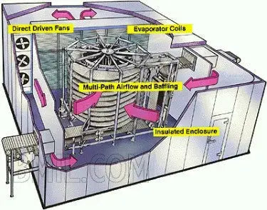Congelador en espiral de acero inoxidable blanco IJ de 1993. Aproximadamente 16 niveles de alto x 14 pies de diámetro. Espacio libre del producto 24 pulgadas de ancho x 4-3/8 pulgadas de alto. Longitud de la correa: 720 pies utilizables, 770 pies en total. La correa es de 26 pulgadas de ancho, 1 x 1, de acero inoxidable, con doble refuerzo y cinta transportadora de eslabones metálicos. Paso de nivel: 7 1/8. Configurado para producir 3000 libras/hora de varios cortes de carne de res. Anteriormente operado con un sistema de refrigeración de amoniaco 45 TR. Sistema de tensión de correa, cámara de congelación aislada modular Bally. Transportador de descarga de enlace metálico inclinado. Dimensiones totales de la caja: 26 pies 11 pulgadas de largo x 22 pies 2-1/2 pulgadas de ancho x 15 pies de alto.