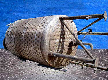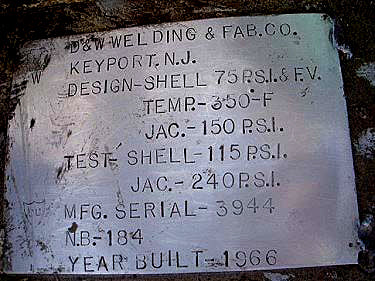Tanque de acero inoxidable para soldadura con camisa con hoyuelos D & W, 775 galones. S/N: 3944. Junta Nacional: 184. Carcasa de diseño: 75 psi a 350 °F, chaqueta: 150 psi. Carcasa de prueba: 115 psi, chaqueta: 115 psi. Agitador: Motor Pace Maker, 10 hp, 1725 rpm, 230/460 V, 24,4/12,2 amperios, 60 ciclos, trifásico. Impulsión del motor, salida: 155 y 52, relación del reductor: 11,49, rpm finales: 150. La parte inferior del agitador está suspendida aproximadamente a 6 pulgadas por encima del fondo del tanque. Indicador de temperatura. Eje del mezclador: 2-1/2 pulgadas de diámetro x 92 pulgadas de largo, hélice: 30 pulgadas de largo, (4) deflectores. Entrada: 15-3/4 pulg. de diámetro. Entrada del tanque: 5 pulgadas de diámetro, brida: 10 pulgadas de diámetro con (8) orificios, de centro a centro: 8 pulgadas de largo, entrada: 2 pulgadas de diámetro, brida: 8 pulgadas de diámetro con (4) orificios, centro al centro: tubo de 7 pulg. de largo y 1-1/2 pulg. Salida central/inferior: 3 pulgadas NPT reducida a 2 pulgadas NPT. Dimensiones totales: 61 pulgadas de diámetro x 16 pies 3 pulgadas de alto.