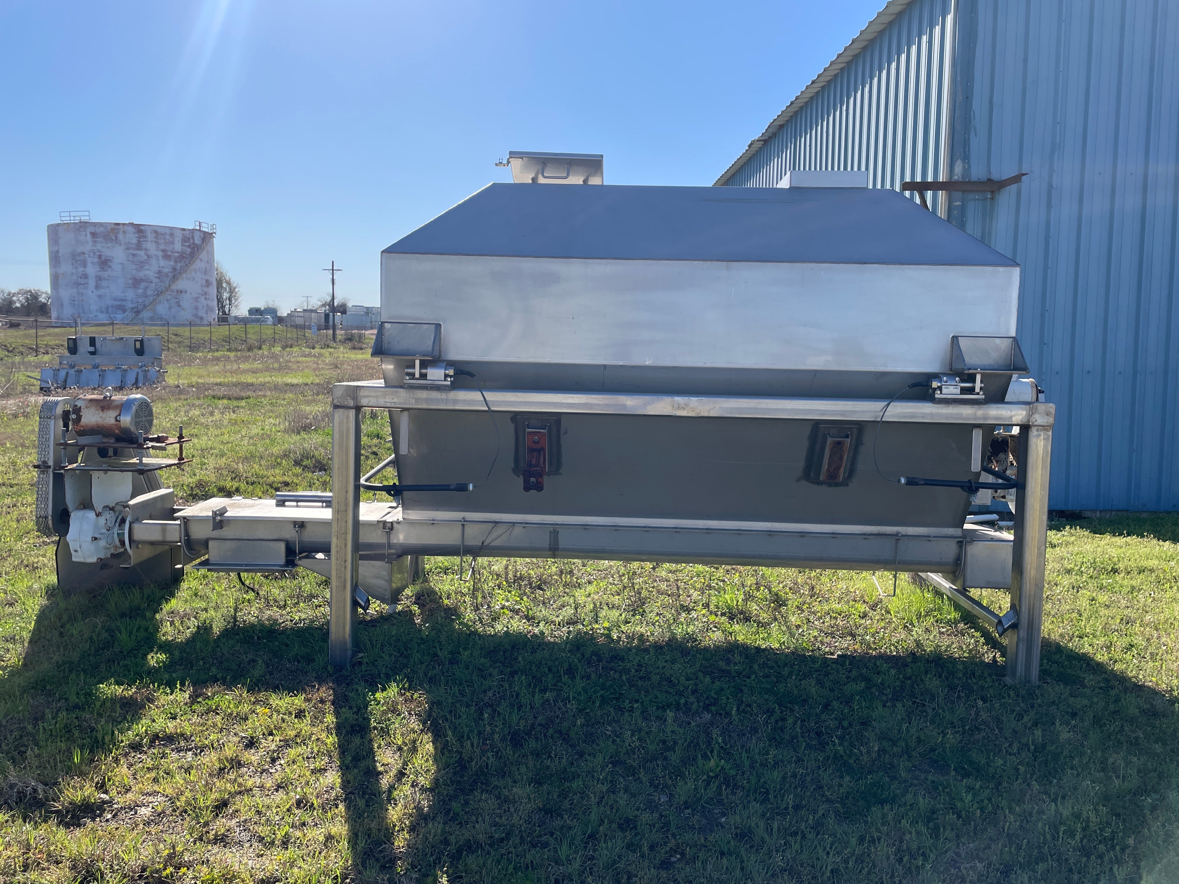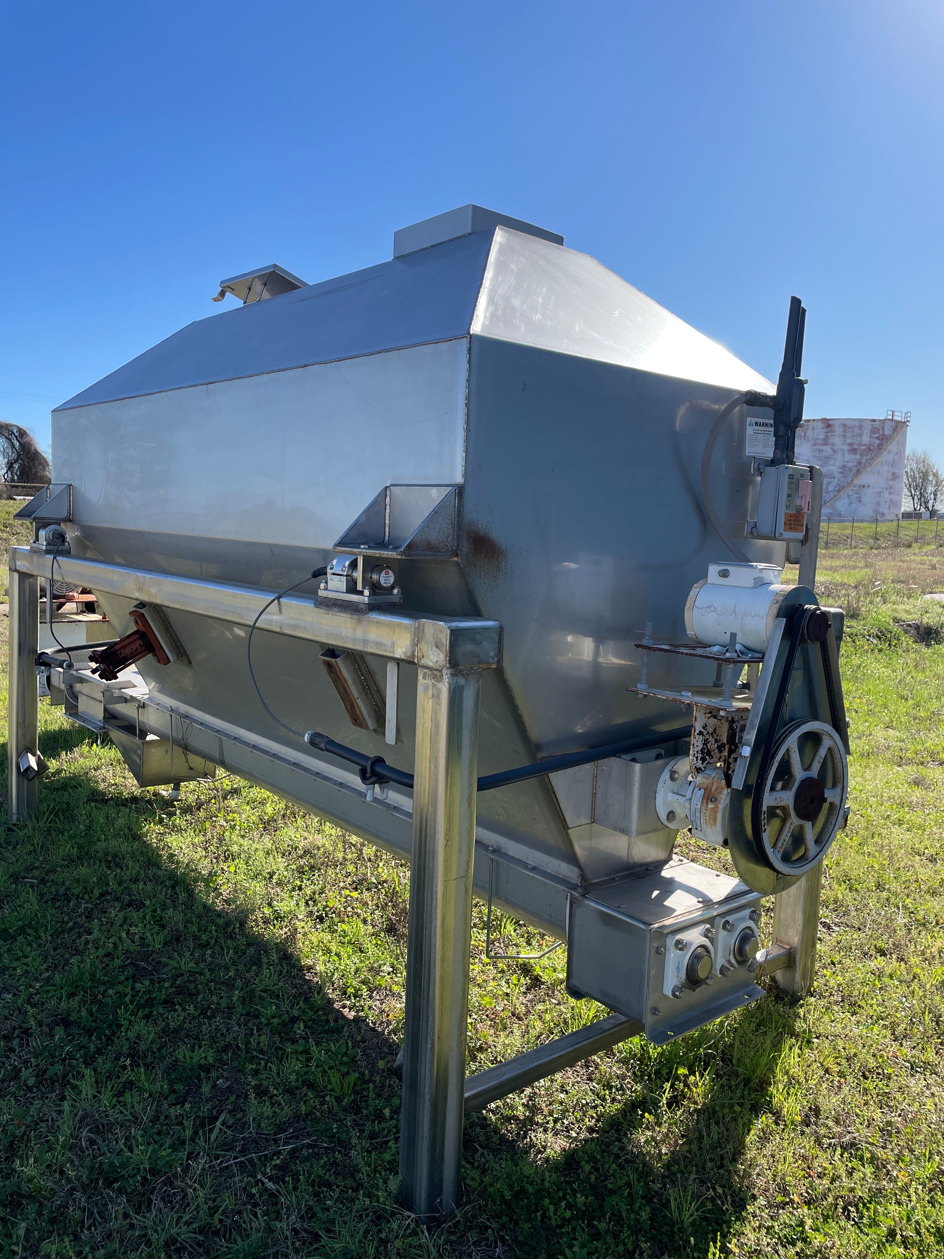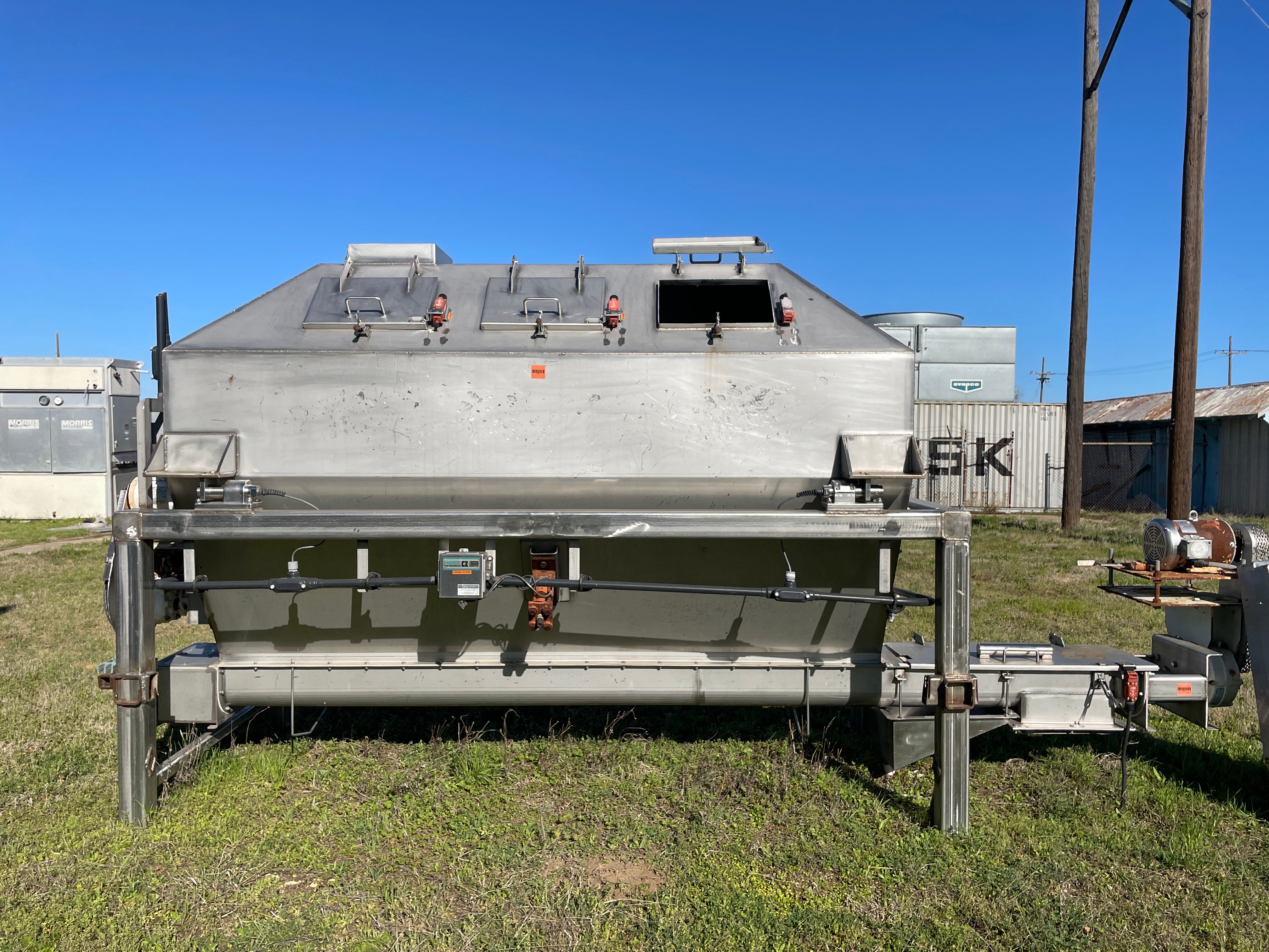 Depósito de almacenamiento de hielo de acero inoxidable con dos sinfines y paleta niveladora encima de los sinfines. Este contenedor mide 48 X 48 X 9' de largo, dos barrenas de 6 diámetros también tienen celdas de carga y un vibrador en cada lado. Construcción de acero inoxidable. Unidad de 5HP en sinfines, Unidad de 1HP en agitador. Longitud de carga: 16'.
