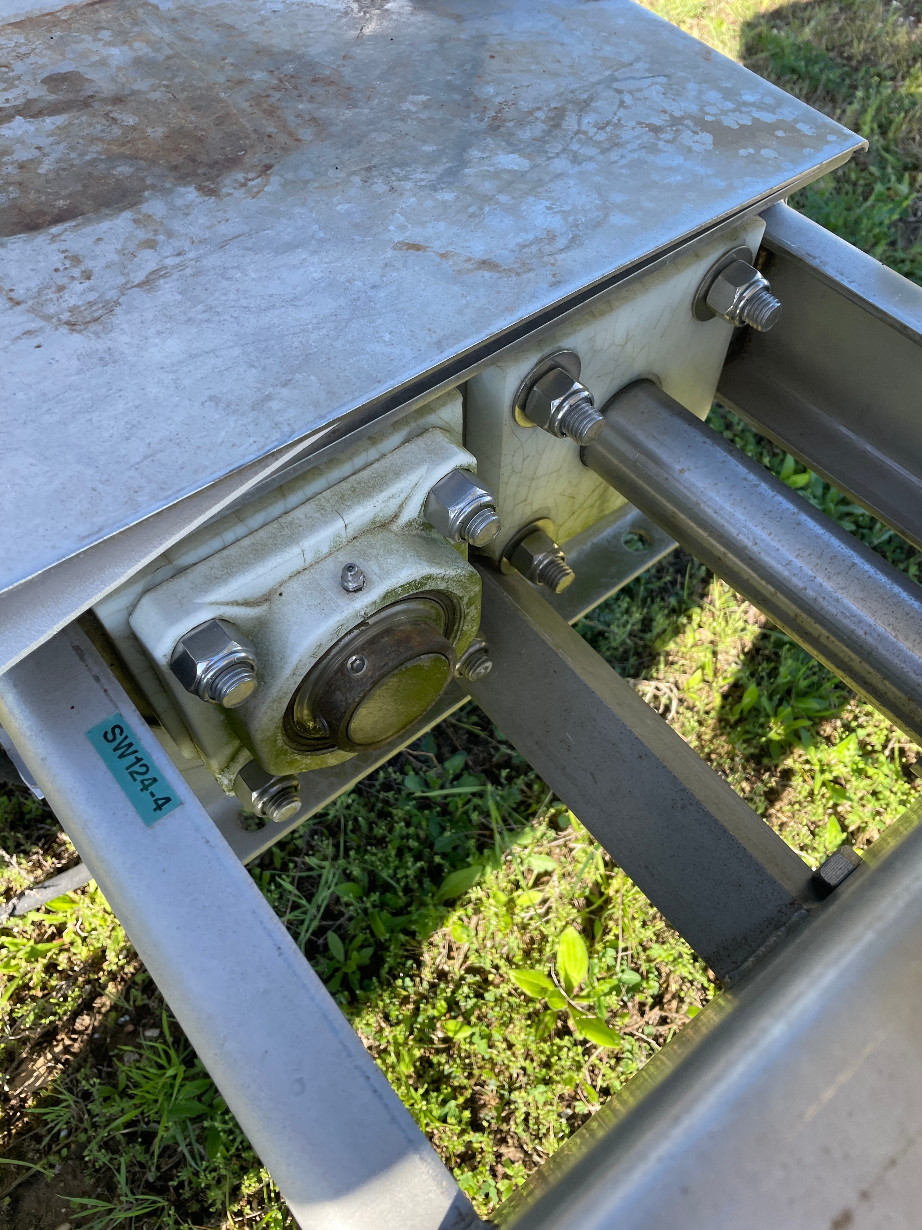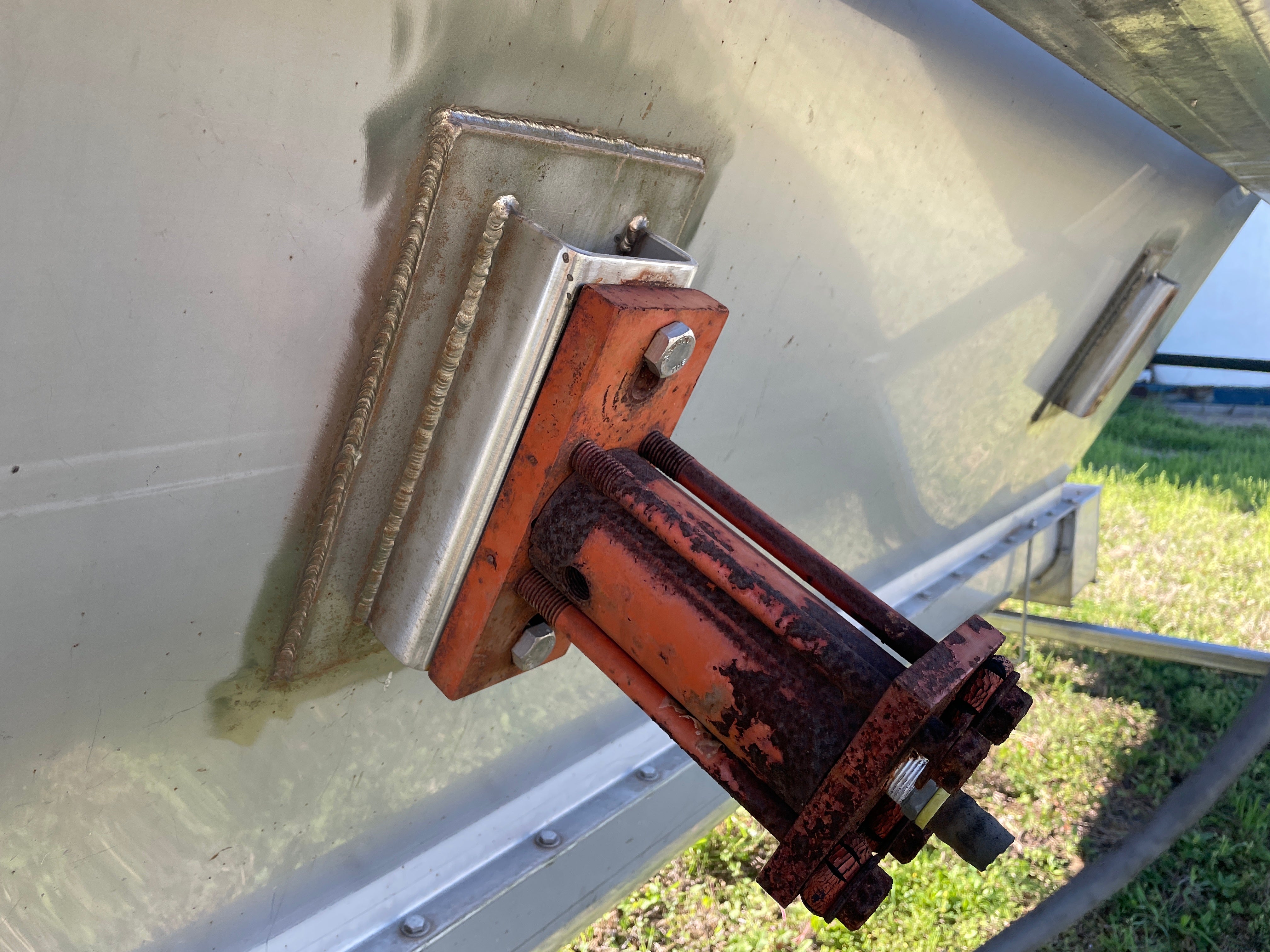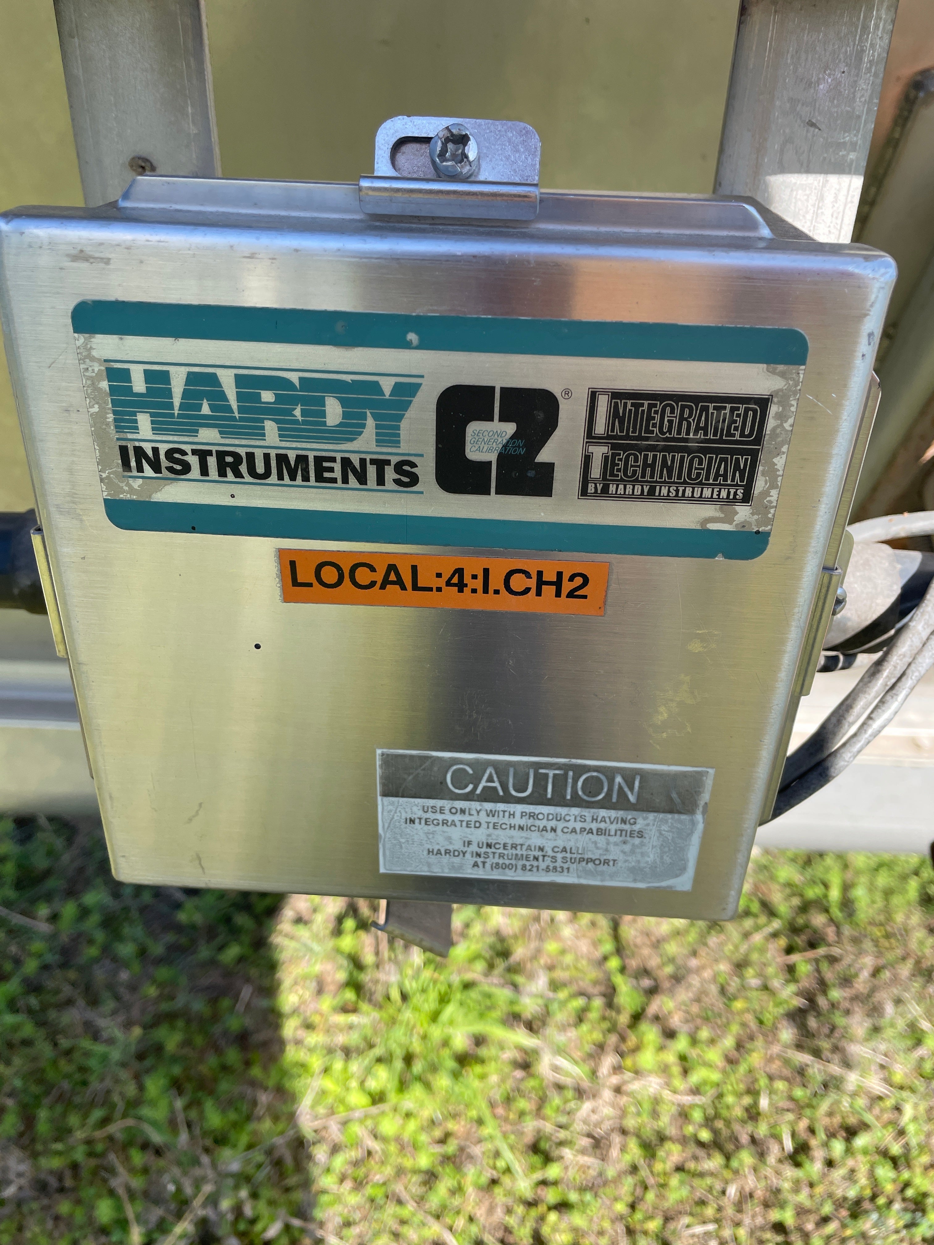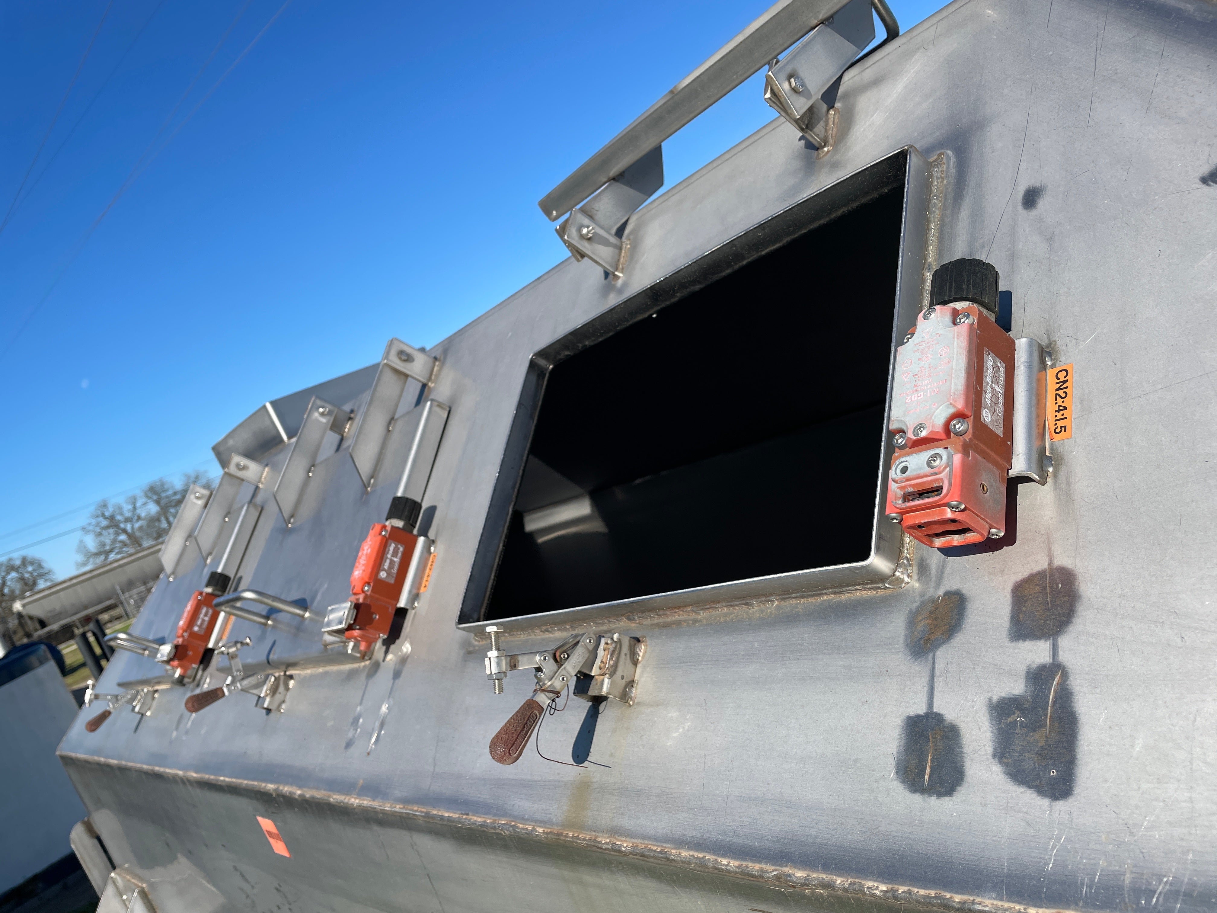 Depósito de almacenamiento de hielo de acero inoxidable con dos sinfines y paleta niveladora encima de los sinfines. Este contenedor mide 48 X 48 X 9' de largo, dos barrenas de 6 diámetros también tienen celdas de carga y un vibrador en cada lado. Construcción de acero inoxidable. Unidad de 5HP en sinfines, Unidad de 1HP en agitador. Longitud de carga: 16'.