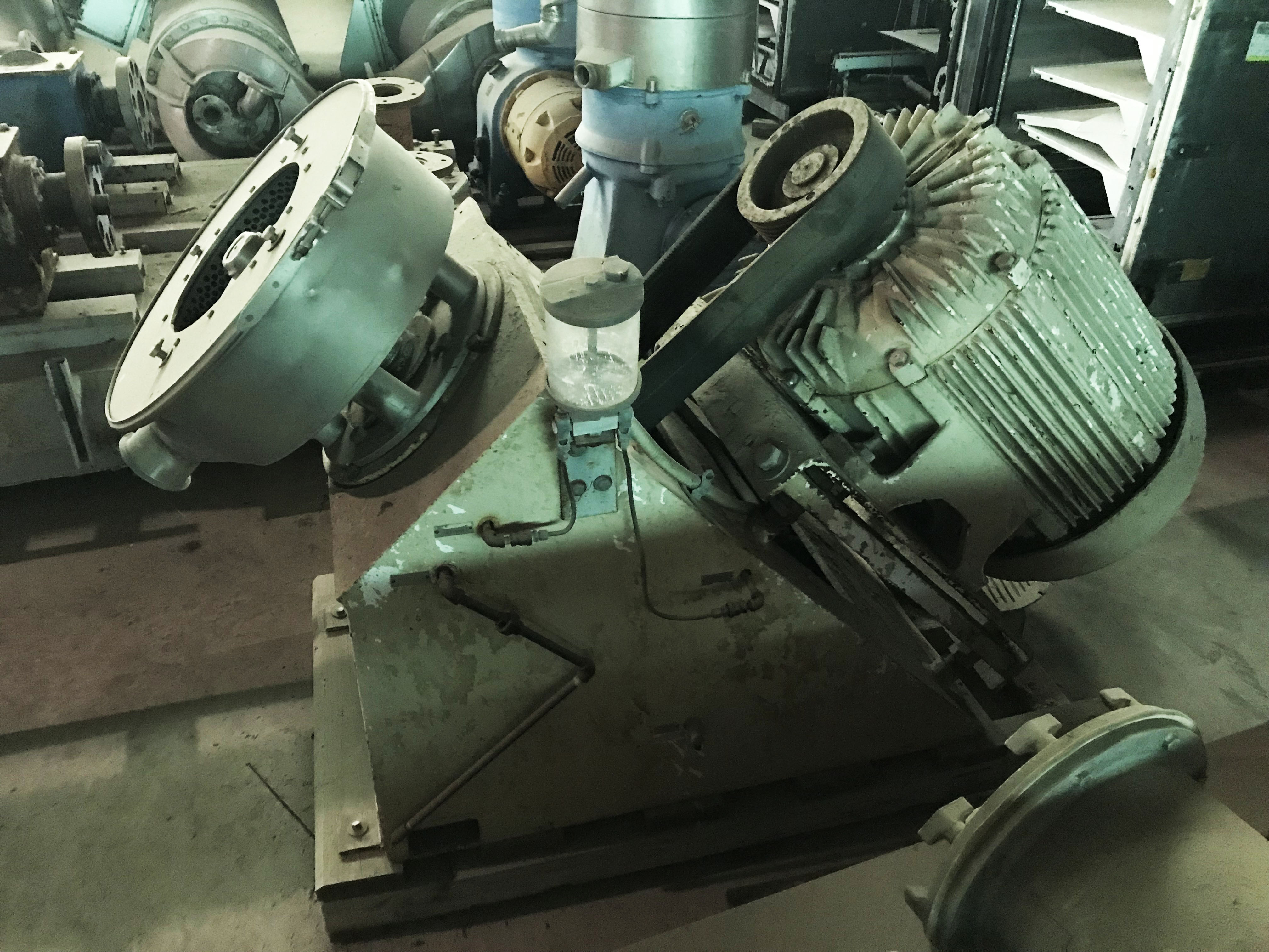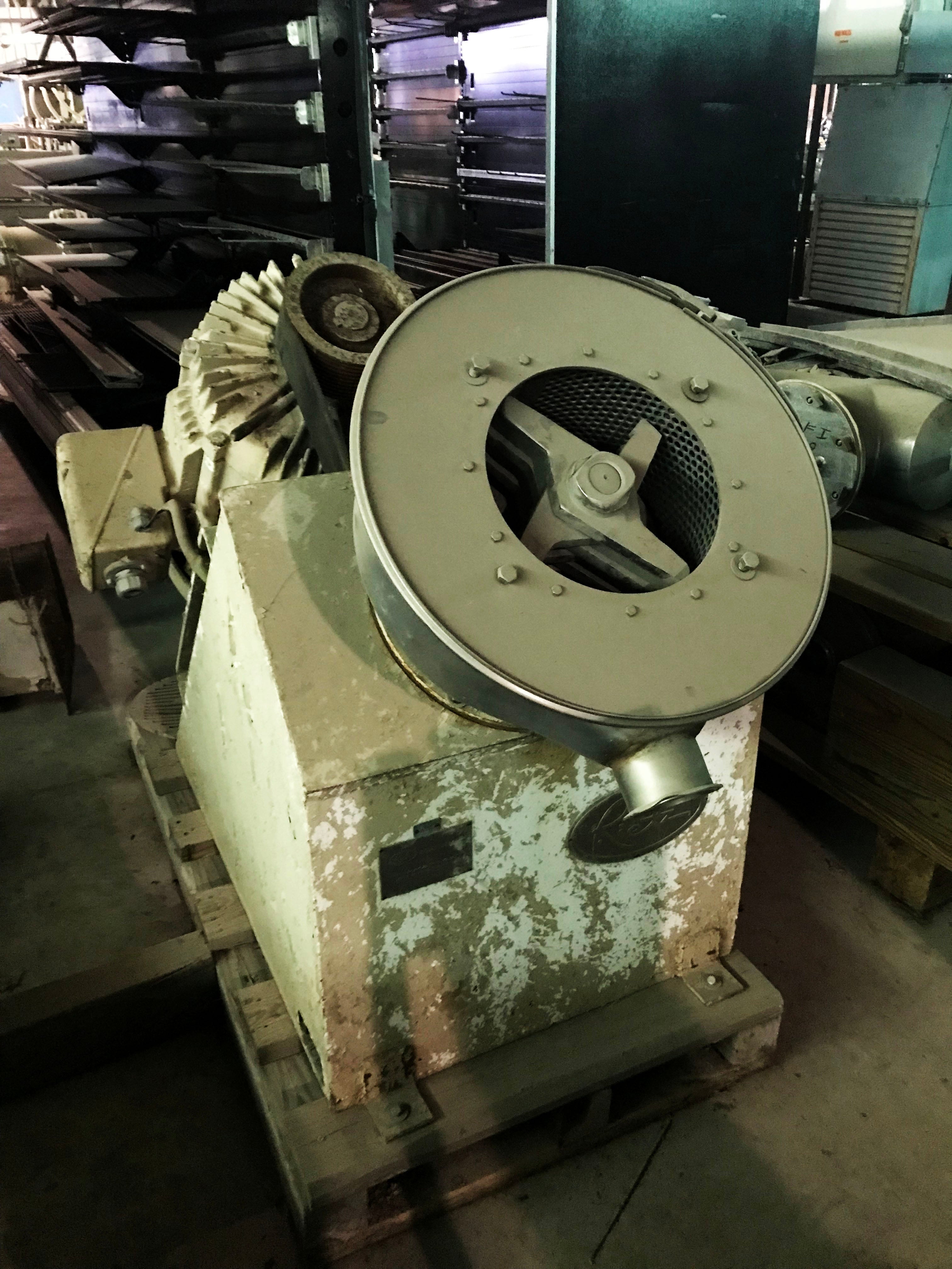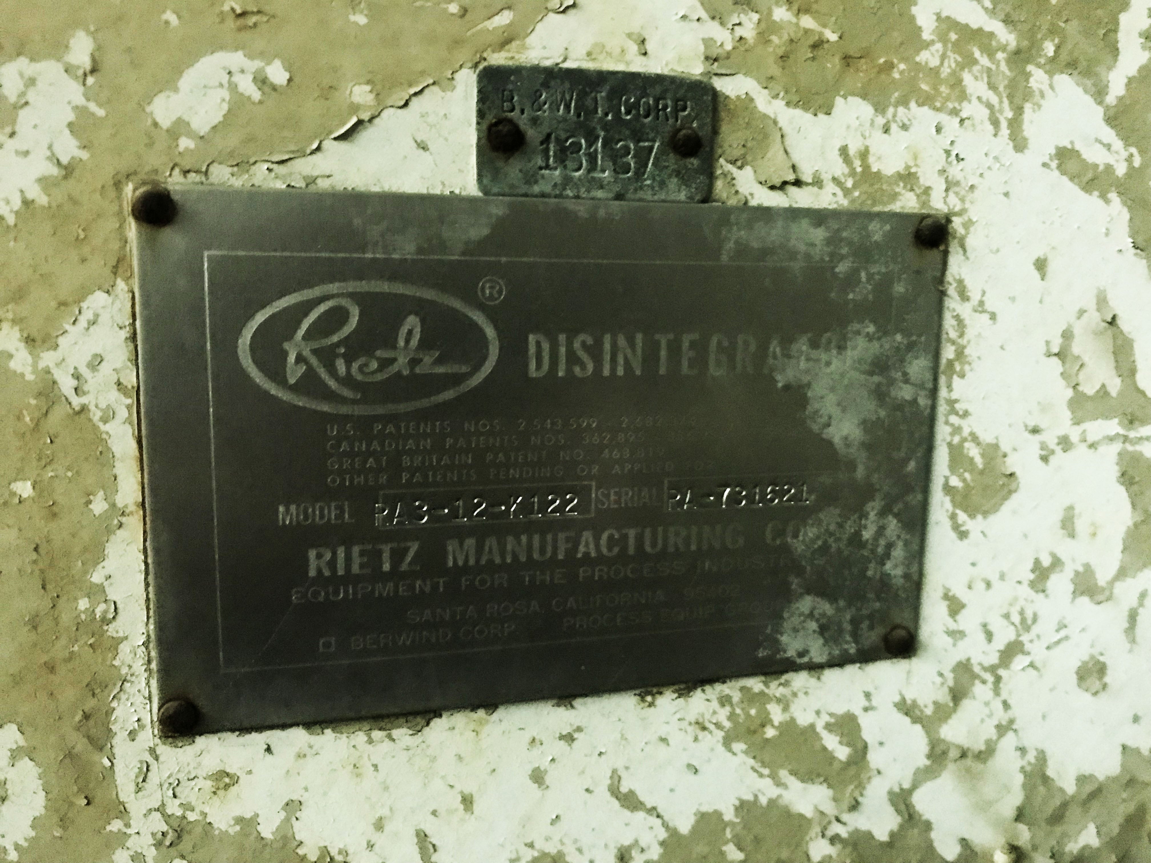 Desintegrador Hosokawa Bepex Rietz Serie RA. Modelo: RA3-12-K122. N/S: RA-731621. El desintegrador utiliza (7) 11 pulgadas de diámetro. Impulsores alojados en una pantalla de dispersión de malla de 0,033 pulgadas y 12 pulgadas de diámetro sostenida entre una base con un diámetro de 3/8 pulgadas. orificios y un soporte con orificios cuadrados de 3/4 pulg. x 3/4 pulg. Motor Allis-Chalmers, 75 hp, 3570 rpm, 230/460 V, 1 72/86 amperios, 60 Hz, trifásico. Los desintegradores de la serie RA se utilizan ampliamente para la pulpa fina de muchos productos alimenticios y para la dispersión fina y la homogeneización tanto en la industria alimentaria como en la química. Además, estos desintegradores Rietz tienen la capacidad de triturar y moler en húmedo a alta velocidad muchos materiales fibrosos y otros materiales extremadamente resistentes. Entradas: (1) 11 pulg. de diámetro. puerto de alimentación. Salidas: (1) 4 pulg. de diámetro. Conexión de línea S. Dimensiones totales: 78 pulgadas de largo x 41 pulgadas de ancho x 46-1/2 pulgadas de alto.