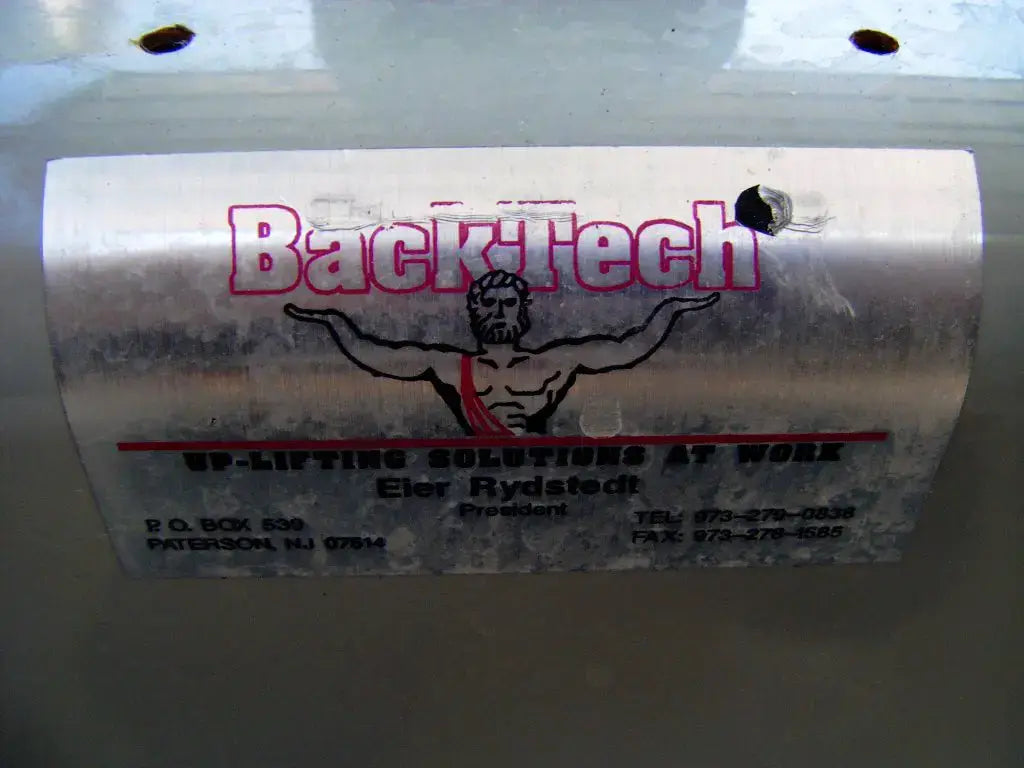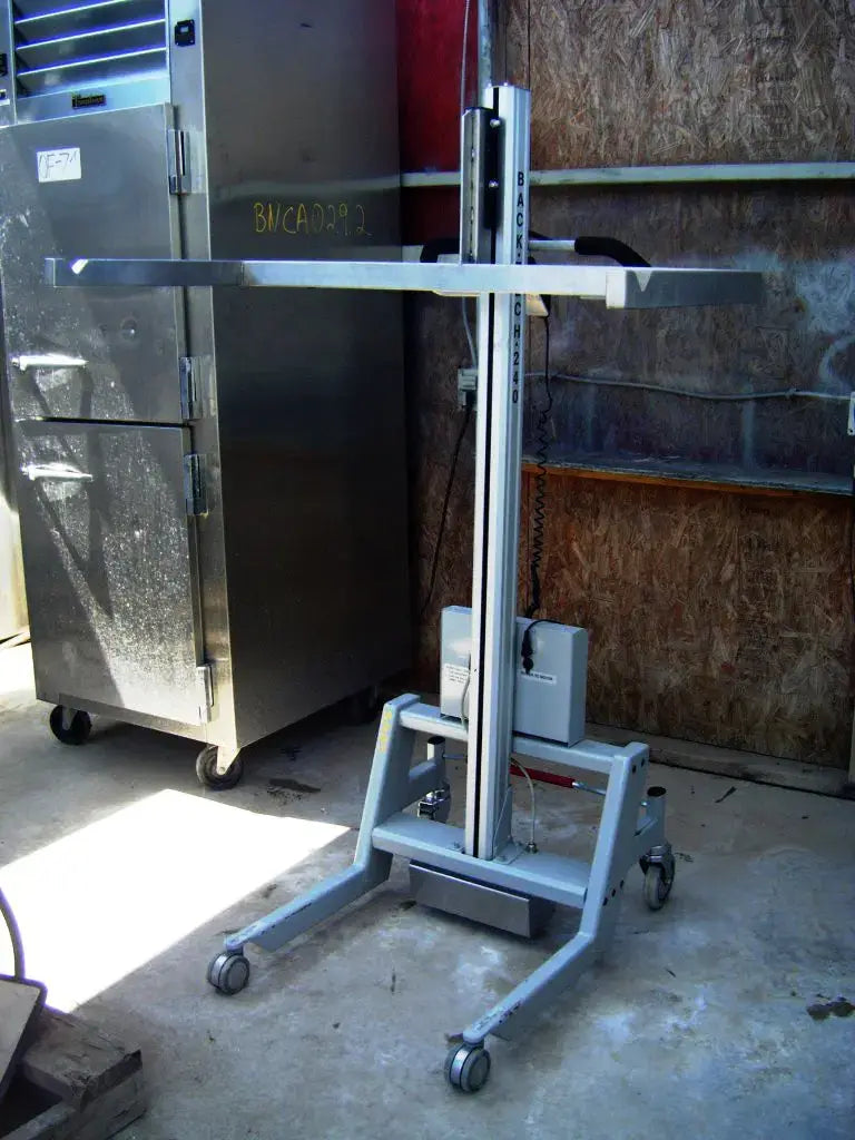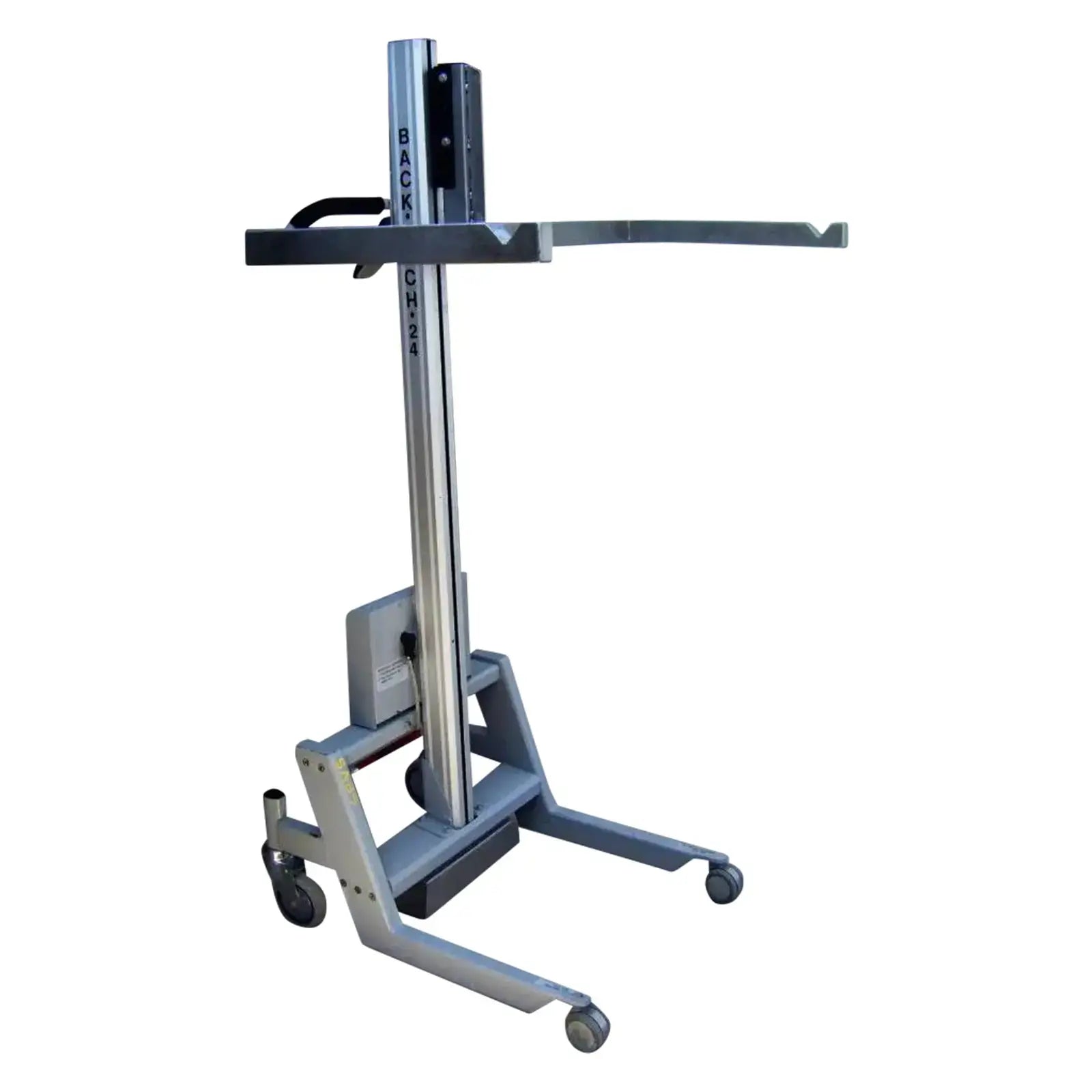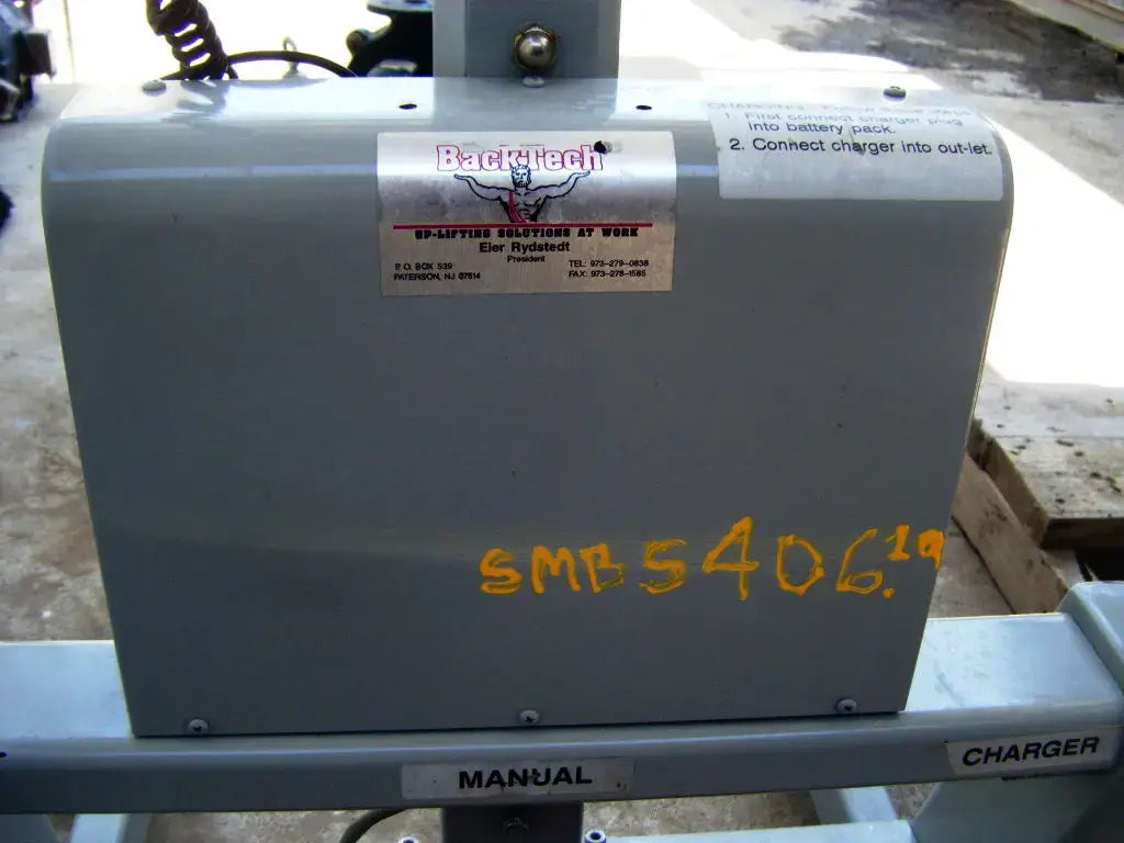 Elevador a batería Back Tech. Modelo: BT/240. Capacidad de carga máxima: 250 libras. La tecnología trasera. Cuenta con un sistema de freno central operado con el pie en las ruedas traseras, un paquete de baterías investigable y un control remoto con cable. Altura mínima de elevación: 4 pulg. Altura máxima de elevación: 4 pies. Alcance de la horquilla de elevación (ancho): 3 pies 5 pulg. Dimensiones totales: 3 pies 8 pulg. de largo x 3 pies x 5 pies 6 pulg. de alto. (ACN46)