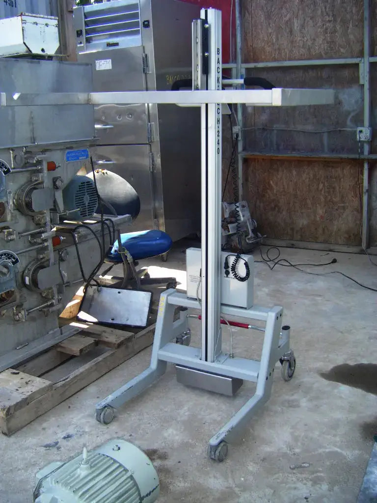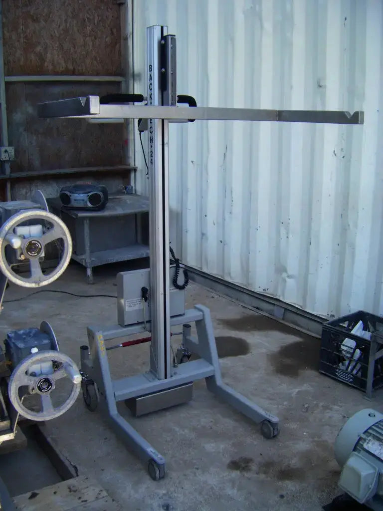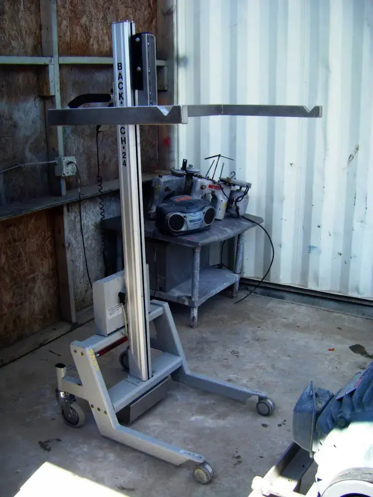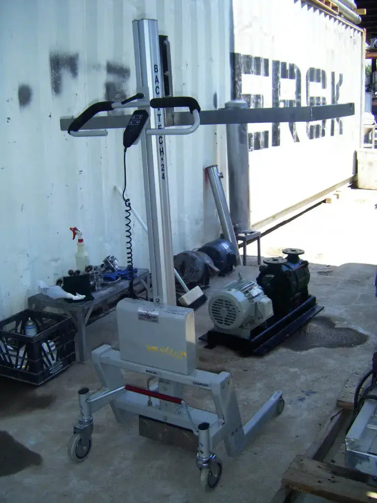Elevador a batería Back Tech. Modelo: BT/240. Capacidad de carga máxima: 250 libras. La tecnología trasera. Cuenta con un sistema de freno central operado con el pie en las ruedas traseras, un paquete de baterías investigable y un control remoto con cable. Altura mínima de elevación: 4 pulg. Altura máxima de elevación: 4 pies. Alcance de la horquilla de elevación (ancho): 3 pies 5 pulg. Dimensiones totales: 3 pies 8 pulg. de largo x 3 pies x 5 pies 6 pulg. de alto. (ACN46)