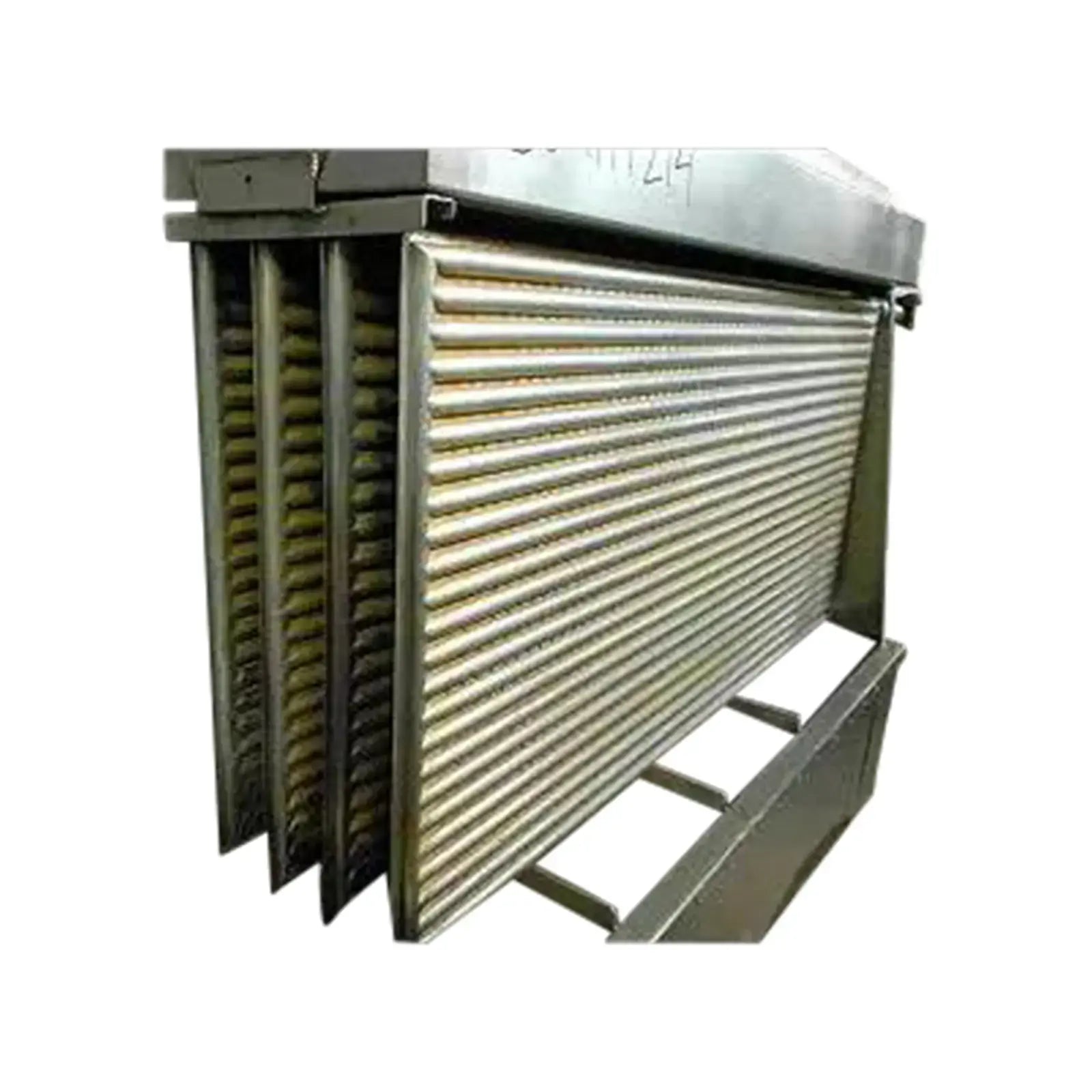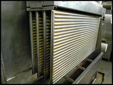 Enfriador de placas de película descendente de acero inoxidable Chester-Jensen Co. Bd. Nacional. No. 13374. Material de construcción acero inoxidable. Cantidad (4) placas con 24 corrugaciones cada una. Área total de la sección de enfriamiento: 171 pies cuadrados. MAWP de 200 PSI a 200 °F. Nota: falta una cubierta lateral. Dimensiones totales: 9 pies de largo x 3 pies 1 pulgada de ancho x 6 pies 5 pulgadas de alto.