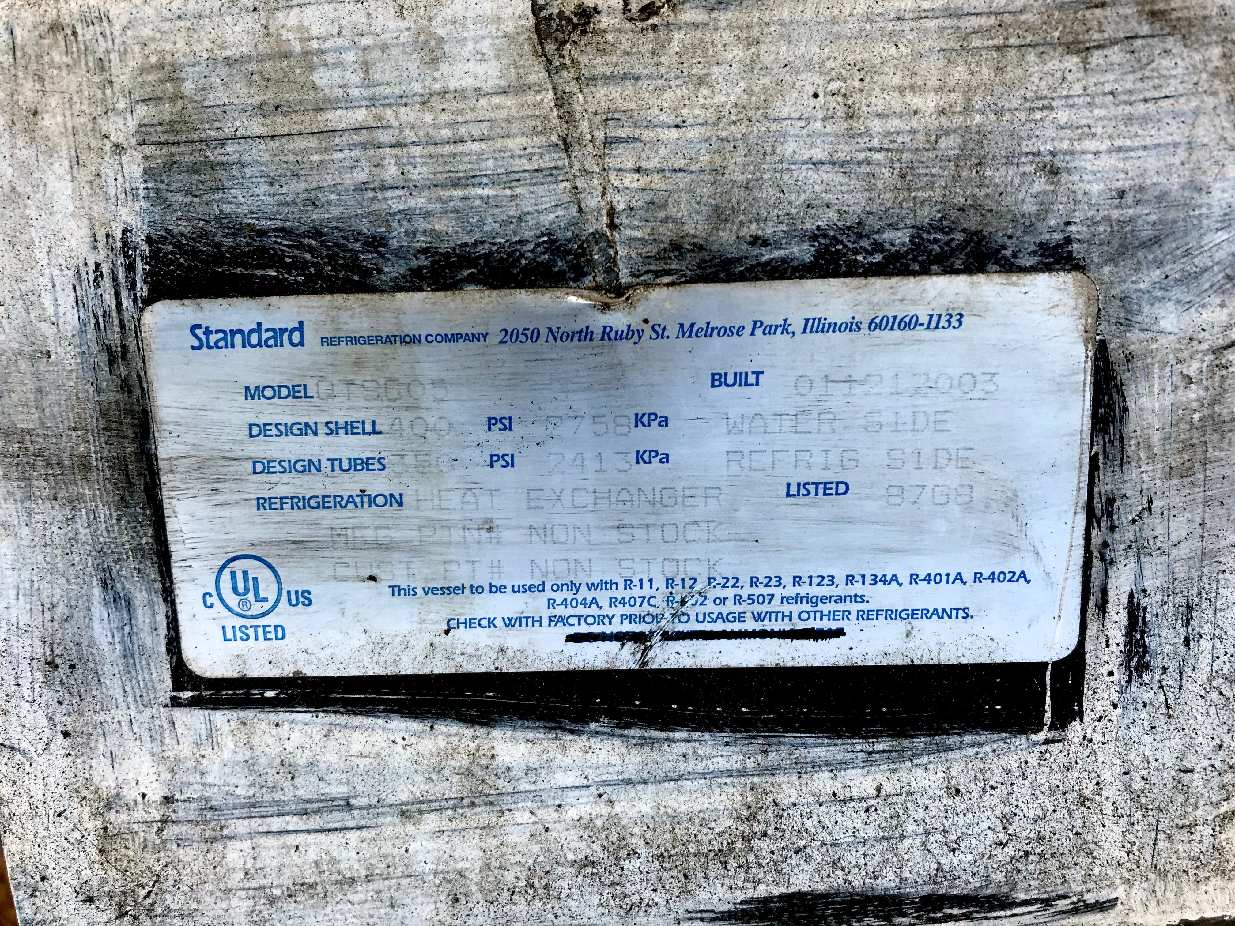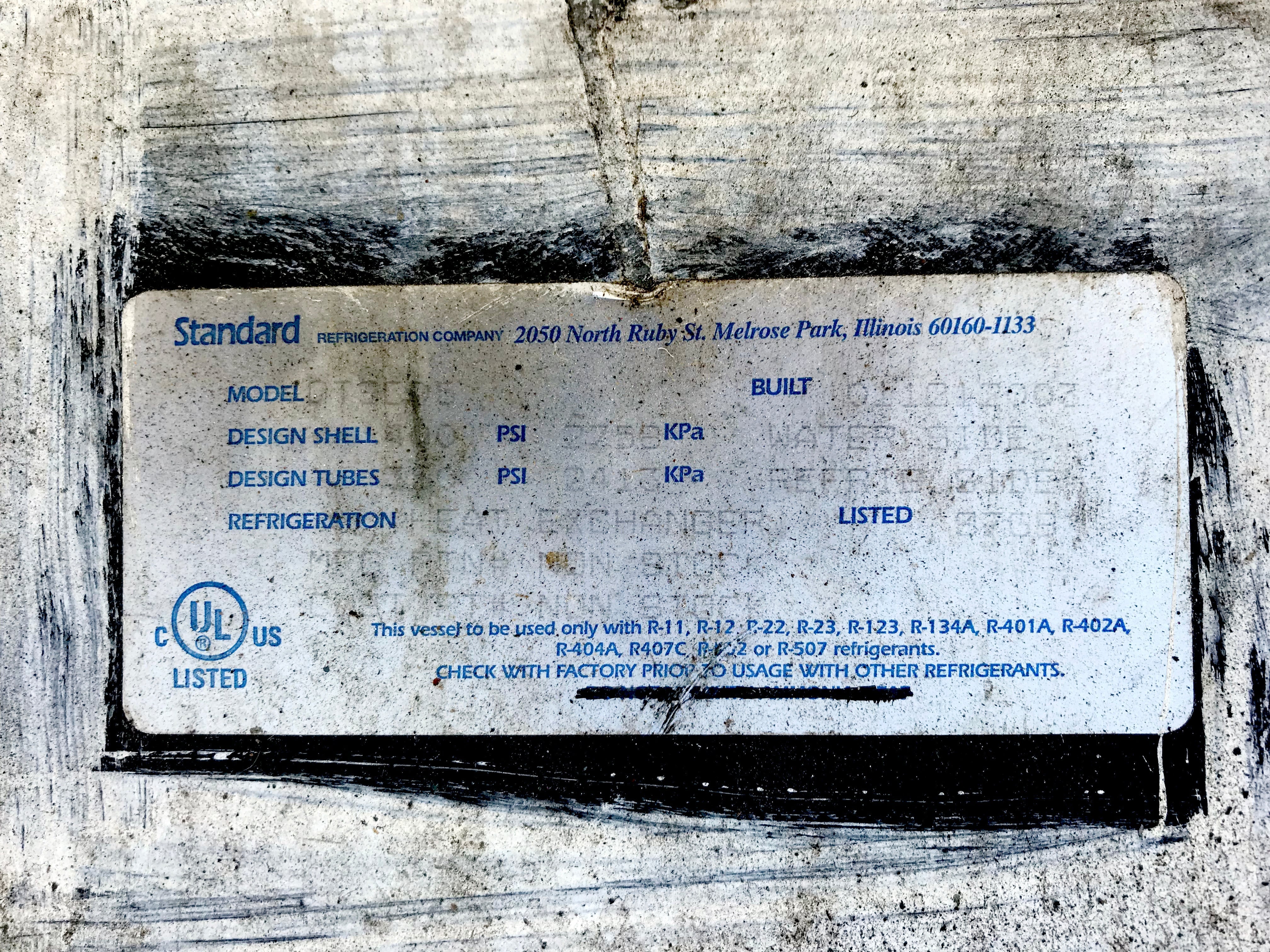 Enfriador de aceite para compresor de tornillo de freón. Estándar Refrigeración Co. Modelo: QTSC05. Año: 2003. Clasificación de carcasa: 400 PSI. Clasificación de tubos (lado del refrigerante): 350 PSI. Este recipiente debe usarse únicamente con refrigerantes R-11, R-22, R-23, R-123, R-134A, R-401A, R-402A, R-404A, R407C, R-507. Dimensiones de la carcasa: 5,5 pulgadas de diámetro exterior x 7 pies de largo en la pared lateral. Puertos: 1,5 pulgadas de refrigeración, 2 pulgadas de aceite.