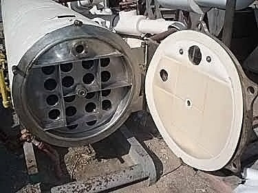 - Descripción de entradas y salidas: Inlets: (1) 1-1/2 in. dia. supply port (refrigerant), (1) 3 in. dia. S-line fitting (water). Outlets: (1) 3 in. dia. S-line fitting (water), (1) 3 in. dia. suction port (refrigerant)