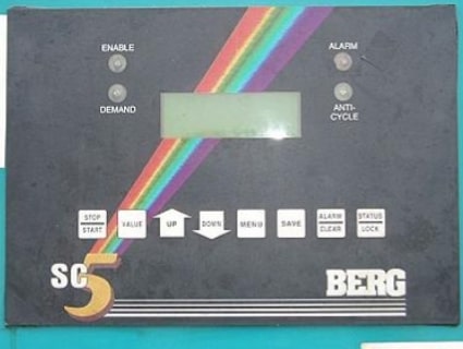 Enfriadora de líquidos Berg Chilling Systems. Modelo: ASR-160-4/1. La capacidad nominal de enfriamiento usando R-22 es de 182 toneladas con temperaturas respectivas de entrada y salida del agua de 60 °F y 50 °F y una temperatura de condensación de 120 °F. Requisitos del sistema: 460 V, 366 amperios, 60 Hz, trifásico. Aproximadamente 160 hp totales generados a partir de: (4) compresores Copeland de 6 cilindros. Dimensiones totales: 20 pies 10 pulgadas de largo x 69 pulgadas de ancho x 9 pies (H12) (ACN1440).