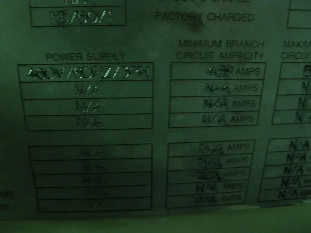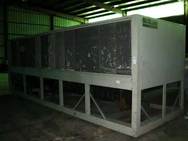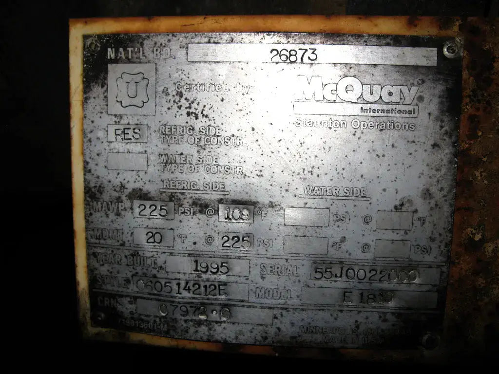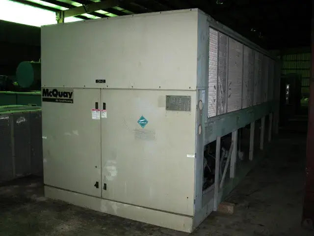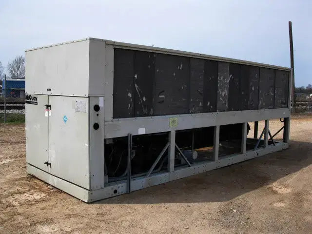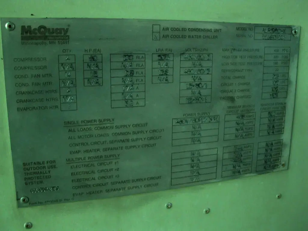 Enfriador de agua McQuay. Modelo ALR195C-X. Capacidad aproximada: 195 toneladas nominales usando R-22 basado en condiciones de aire ambiente de 95°F y un cambio de 10°TD entre 55°F y 45°F. Presión de prueba alta/baja: 380/150 psig. Presión máxima de alivio: 450 psig. (4) Compresores de 8 cilindros de 60 Hp cada uno 460V 60 Hz trifásicos. (14), 26 pulgadas de diámetro. ventiladores y motores: 1hp, 460V, 60 Hz, trifásicos. Flujo de aire total de la unidad 85,620 cfm. Área de superficie total de la cara del serpentín: 270 pies cuadrados. Altura y longitud de las aletas por circuito 80 x 243 pulgadas. Aletas por pulgada x filas de profundidad por circuito: 16 x 3. (4) Calentador del cárter más (1) calentador del evaporador 115 V 60Hz 1 fase. Dimensiones totales: 22 pies ¾ pulgadas de largo x 6 pies 11-1/2 pulgadas x 7 pies 6 pulgadas de alto (H15) (ACN880-95).