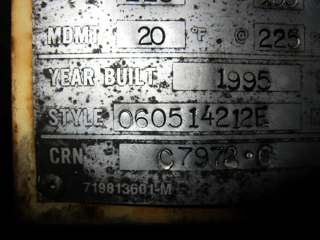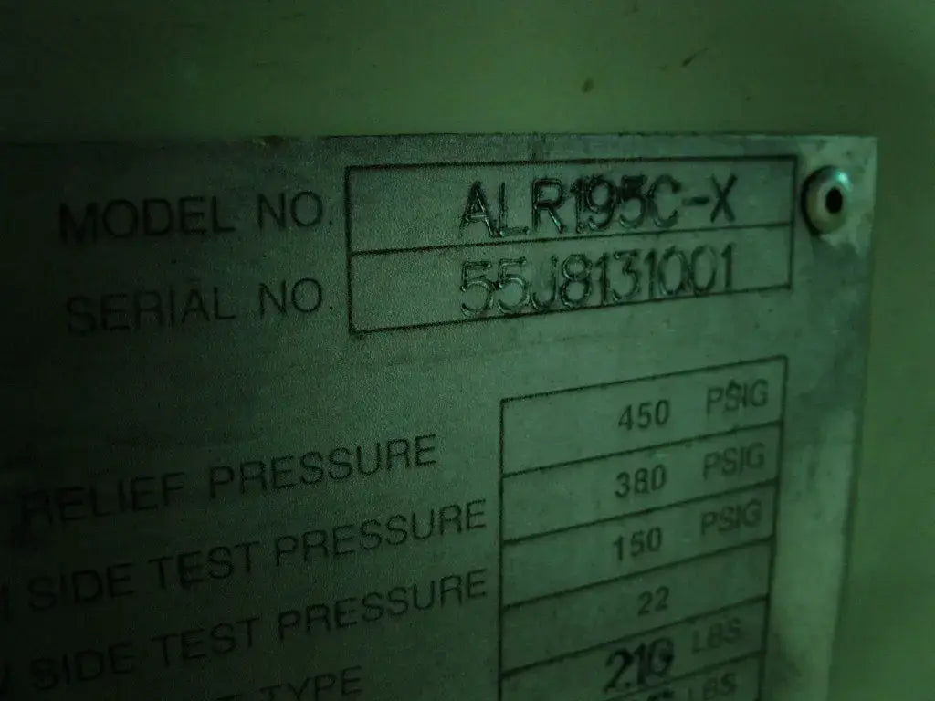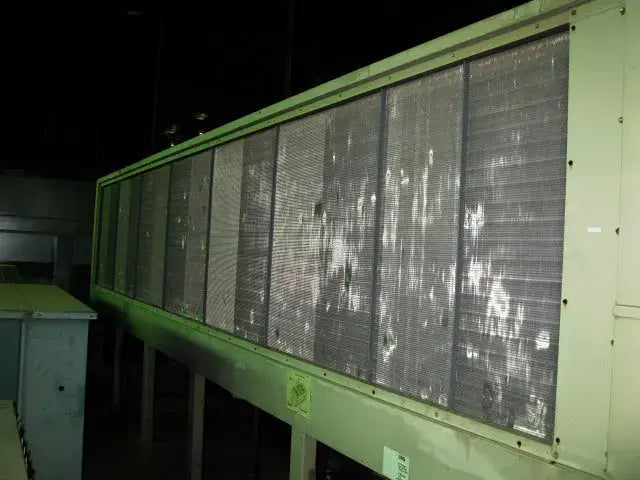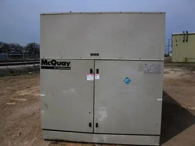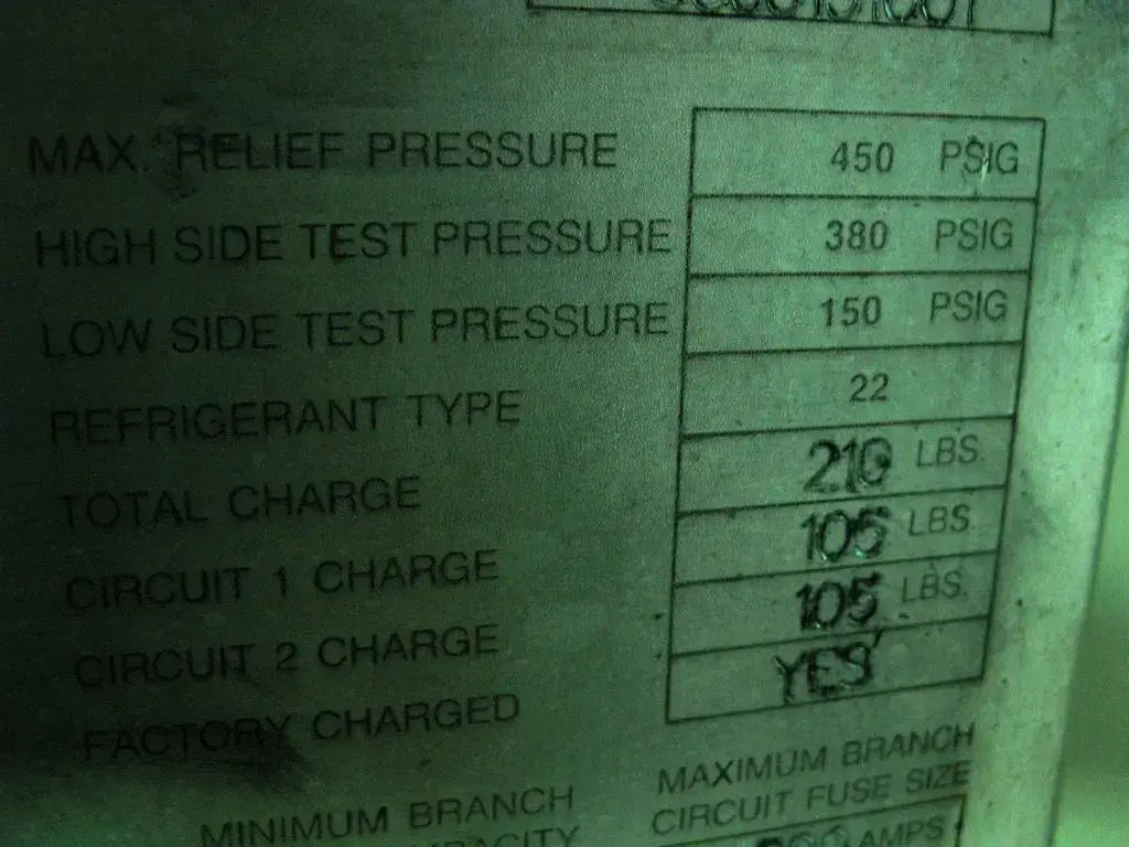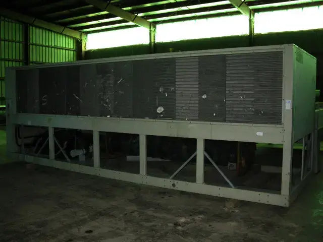 Enfriador de agua McQuay. Modelo ALR195C-X. Capacidad aproximada: 195 toneladas nominales usando R-22 basado en condiciones de aire ambiente de 95°F y un cambio de 10°TD entre 55°F y 45°F. Presión de prueba alta/baja: 380/150 psig. Presión máxima de alivio: 450 psig. (4) Compresores de 8 cilindros de 60 Hp cada uno 460V 60 Hz trifásicos. (14), 26 pulgadas de diámetro. ventiladores y motores: 1hp, 460V, 60 Hz, trifásicos. Flujo de aire total de la unidad 85,620 cfm. Área de superficie total de la cara del serpentín: 270 pies cuadrados. Altura y longitud de las aletas por circuito 80 x 243 pulgadas. Aletas por pulgada x filas de profundidad por circuito: 16 x 3. (4) Calentador del cárter más (1) calentador del evaporador 115 V 60Hz 1 fase. Dimensiones totales: 22 pies ¾ pulgadas de largo x 6 pies 11-1/2 pulgadas x 7 pies 6 pulgadas de alto (H15) (ACN880-95).