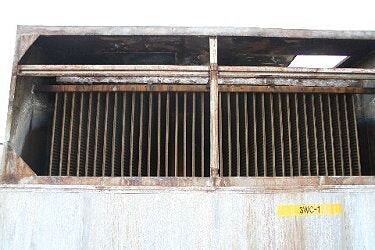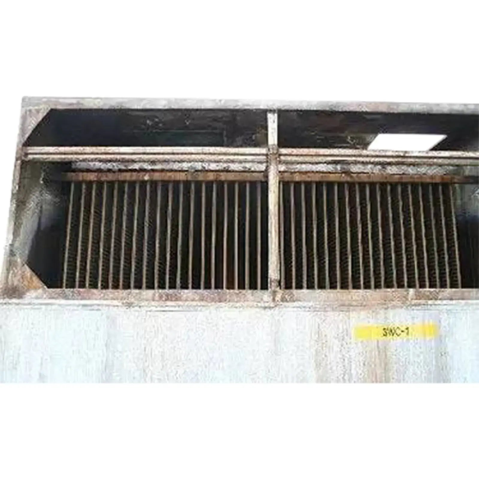 Enfriador de placas de amoníaco Chester-Jensen Co. Modelo: XB-36-OT-36-32. Capacidad de enfriamiento: 720 toneladas a 1152 gpm para una succión de 26°F con una TD de 15°. (36) Placas con 32 corrugaciones cada una. Área total de la sección de enfriamiento: 1,539 pies cuadrados. Dimensiones de la placa: 5 pies de ancho x 45 pulgadas de alto. Los enfriadores de placas Chester-Jensen Co enfrían de manera continua y segura agua, salmuera, glicoles y otros fluidos homogéneos hasta 1 °F de su punto de congelación. mediante la utilización de una característica de construcción interna única inherente al diseño de la placa de flujo corto de gas que minimiza la caída de presión del refrigerante, facilita la evacuación rápida y el reemplazo del vapor gastado y asegura el coeficiente de transferencia de calor más alto posible, maximizando así la relación de toneladas por caballo de fuerza. Peso seco: 7400 libras. Dimensiones totales: 14 pies de largo x 7 pies 10 pulgadas de ancho x 7 pies 10 pulgadas de alto (ND)