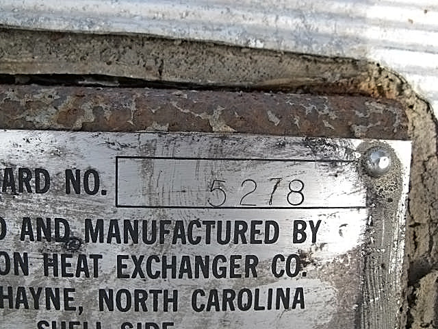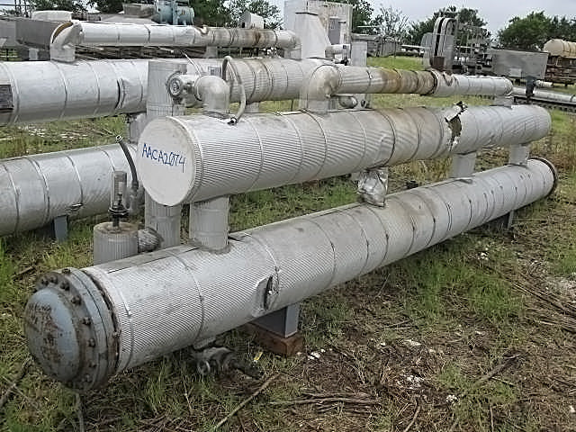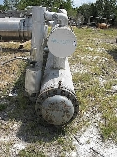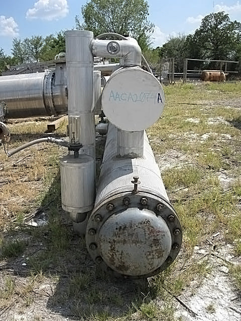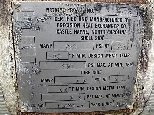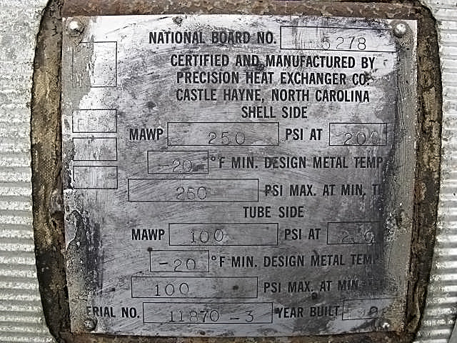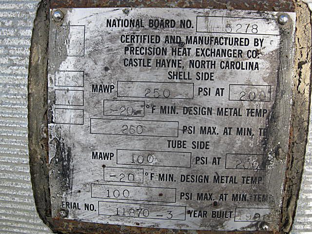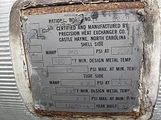 1990 Enfriador de productos Precision Heat Exchanger Co con tambor de compensación. Capacidad máxima estimada de superficie de intercambio de calor: 256 pies cuadrados (54) tubos de acero al carbono de 1 pulgada de diámetro x 217 pulgadas L. MAWP del lado de la carcasa: 250 psi a 200 °F, MDMT: -20 °F a 250 psi. Lado del tubo: MAWP: 100 psi a 200 °F, MDMT: -20 °F a 100 psi. (3) Modelo de Henry Technologies Valve Co.: indicadores de nivel de líquido LI-50. (2) Válvulas de alivio de seguridad Parker. Tipo SRH204. Presión de ajuste: 250 psig. Capacidad de aire 747 scfm. (2) Medidores de temperatura de dial WIKA. (2) Conjuntos de interruptor de flotador Parker tipo LL. Entradas/salidas: 5 pulgadas. Dimensiones totales: 19 pies 6 pulgadas de largo x 2 pies 5 pulgadas de ancho x 4 pies 9 pulgadas de alto.