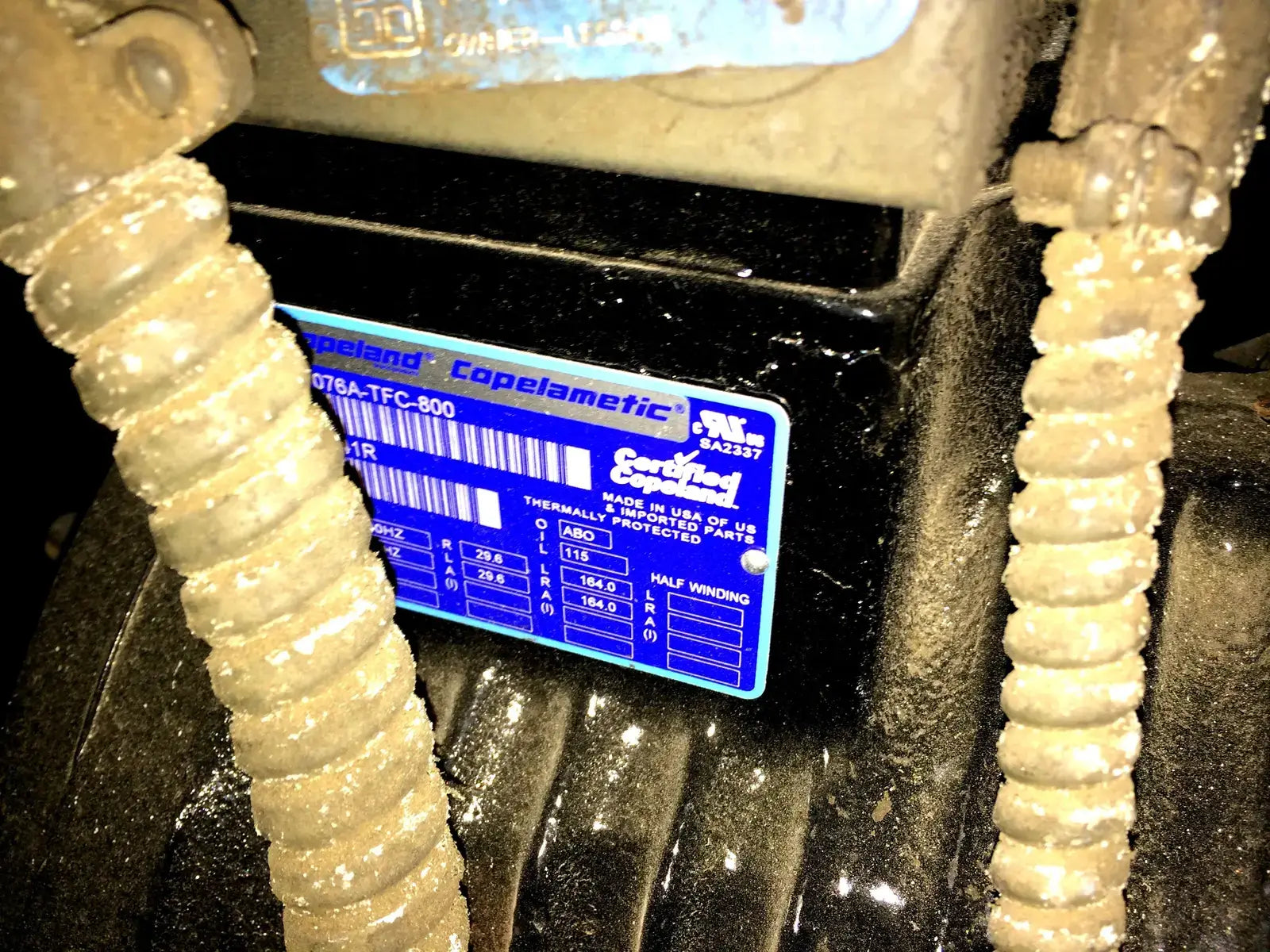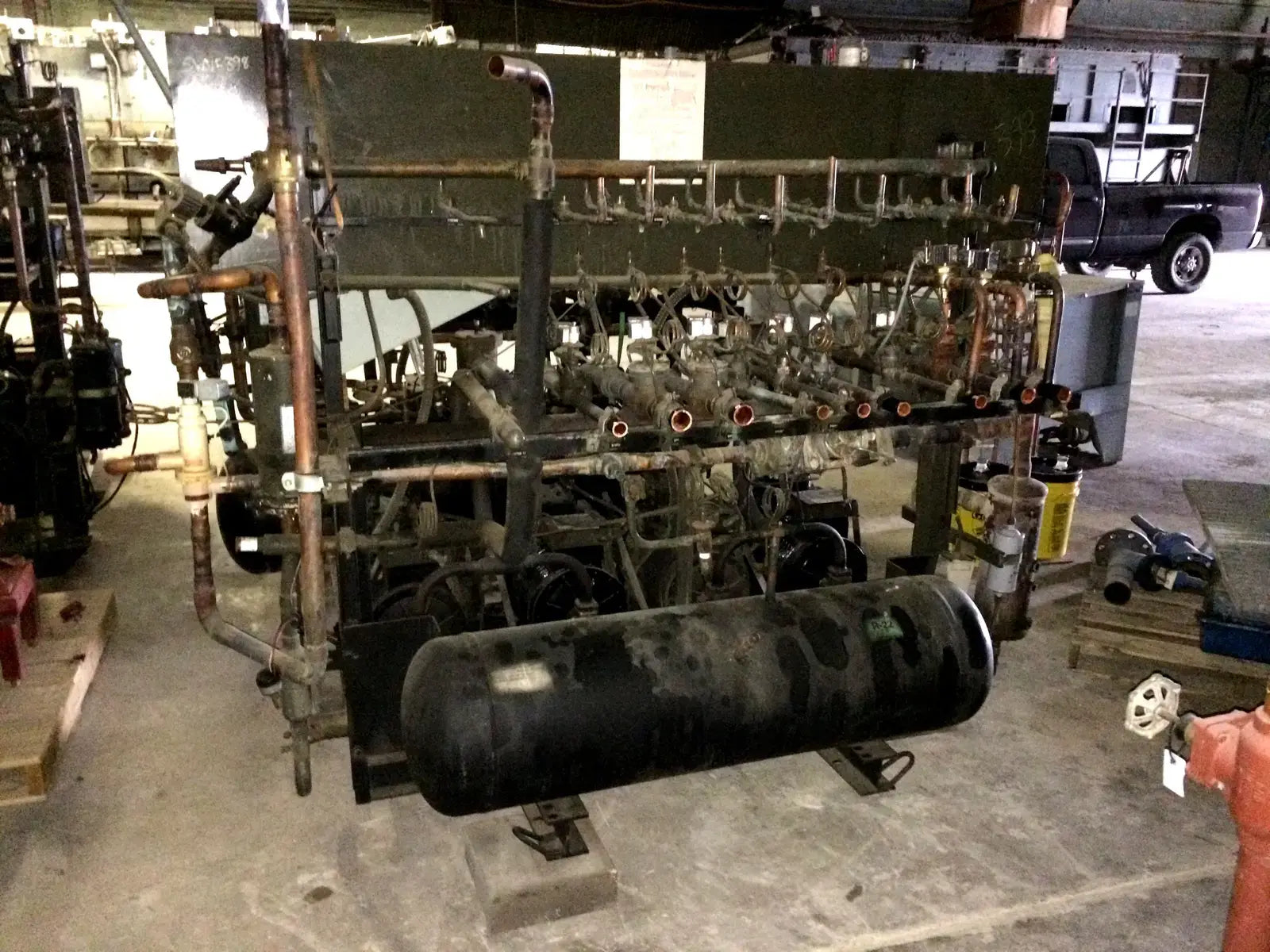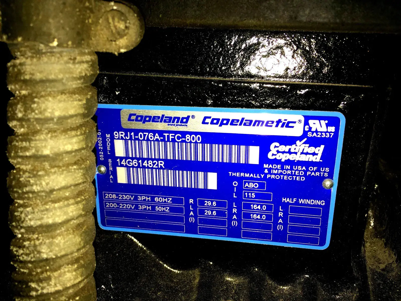 Hill Refrigeration Freon Refrigerante Compresor Rack C. Modelo: AQ9A3040HCM2. 30 CV, 220 V, trifásico, 60 Hz. Bastidor de refrigerante que incluye cuatro compresores de 7,5 HP, refrigerante R-22 y dos unidades de compresores reemplazadas en octubre de 2014. Compresor 1: Copeland Copelametic modelo: 9RJ1-076A-TFC-800, serie 14G61482R, 208-230 V, trifásico, 50 / 60 Hz. Compresor 2: Copeland Copelametic modelo: 9RJ1-0765-TFC-800, serie 95L72875, 208-230V, trifásico, 50/60 Hz. Compresor 3: Copeland Copelametic modelo: 9RJ1-076A-TFC-800, serie 14K61841R, 208-230V, trifásico, 50/60 Hz. Compresor 4: Copeland Copelametic modelo: 9RJ1-076A-TFC-800, serie 06B65455R, 208-230V, trifásico, 50/60 Hz.