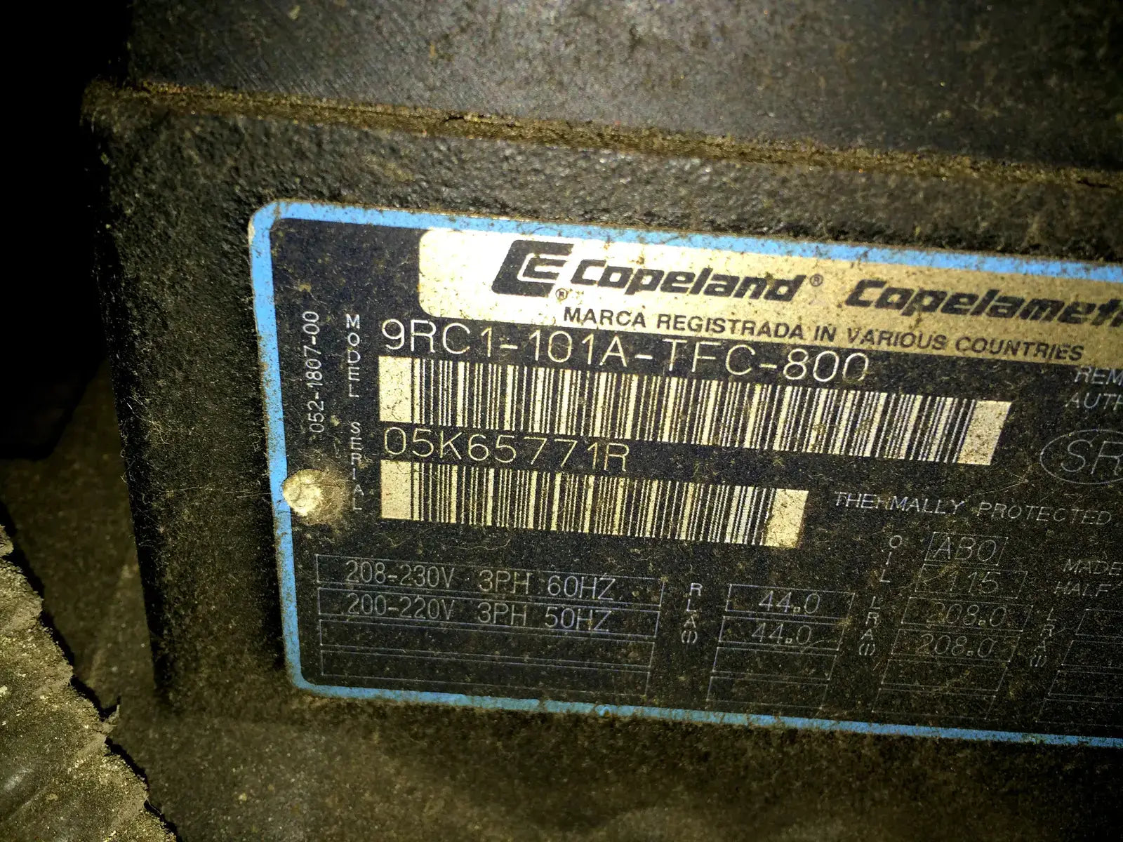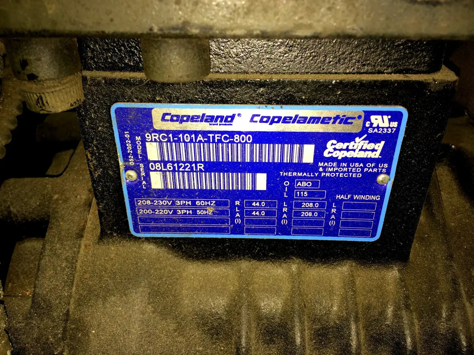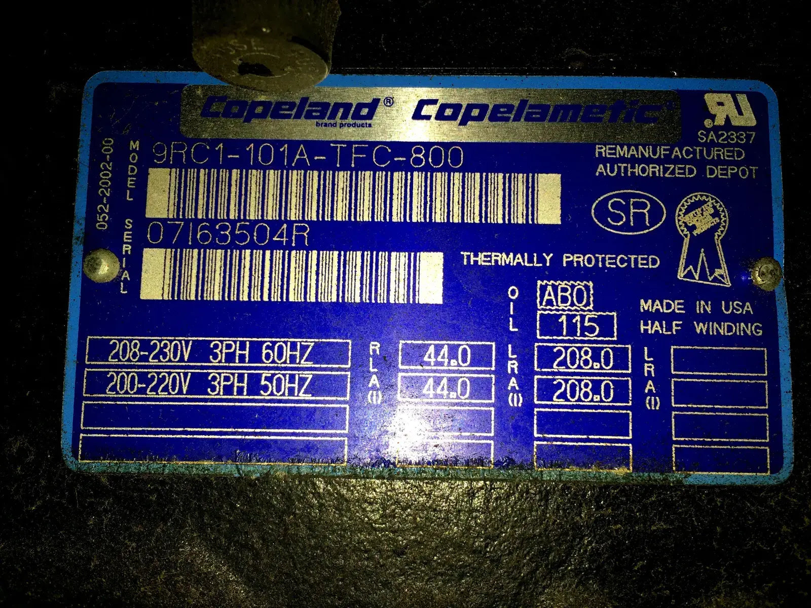 Hill Refrigeration Freon Refrigerante Compresor Rack D. Modelo: AQ9C4040RCM2. 40 CV, 220 V, trifásico, 60 Hz. Bastidor de refrigerante que incluye cuatro compresores de 10 HP actualizados de 2005/2007/2008/2014. Refrigerante R-22, incluye control temporizador, control de descongelación. Compresor 1: Copeland Copelametic modelo: 9RC1-101A-TFC-800, serie 07163504R, 208-230V, trifásico, 50/60 Hz. Compresor 2: Copeland Copelametic modelo: 9RC1-101A-TFC-800, serie 05K65771R, 208-230V, trifásico, 50/60 Hz. Compresor 3: Copeland Copelametic modelo: 9RC1-101A-TFC-800, serie 08L61221R, 208-230V, trifásico, 50/60 Hz. Compresor 4: Copeland Copelametic modelo: 9RC1-101AA-TFC-800, serie 14J62001R, 208-230V, trifásico, 50/60 Hz.