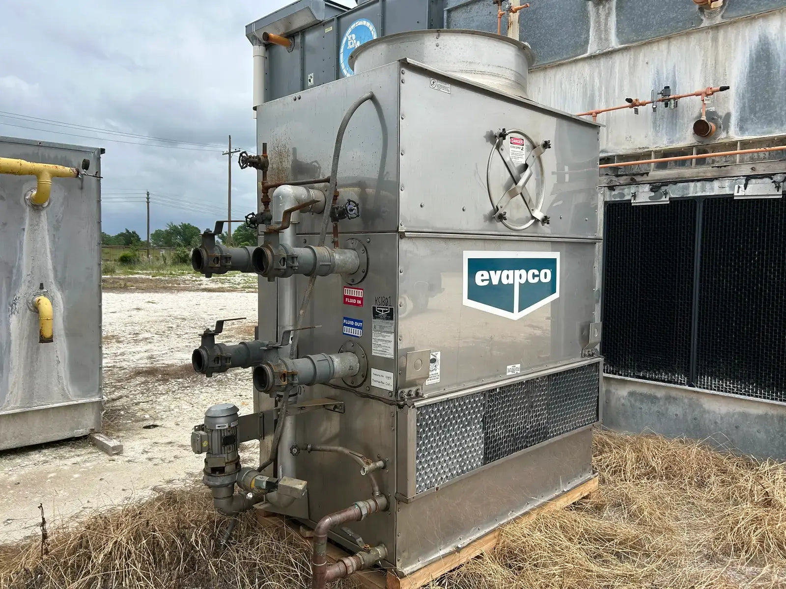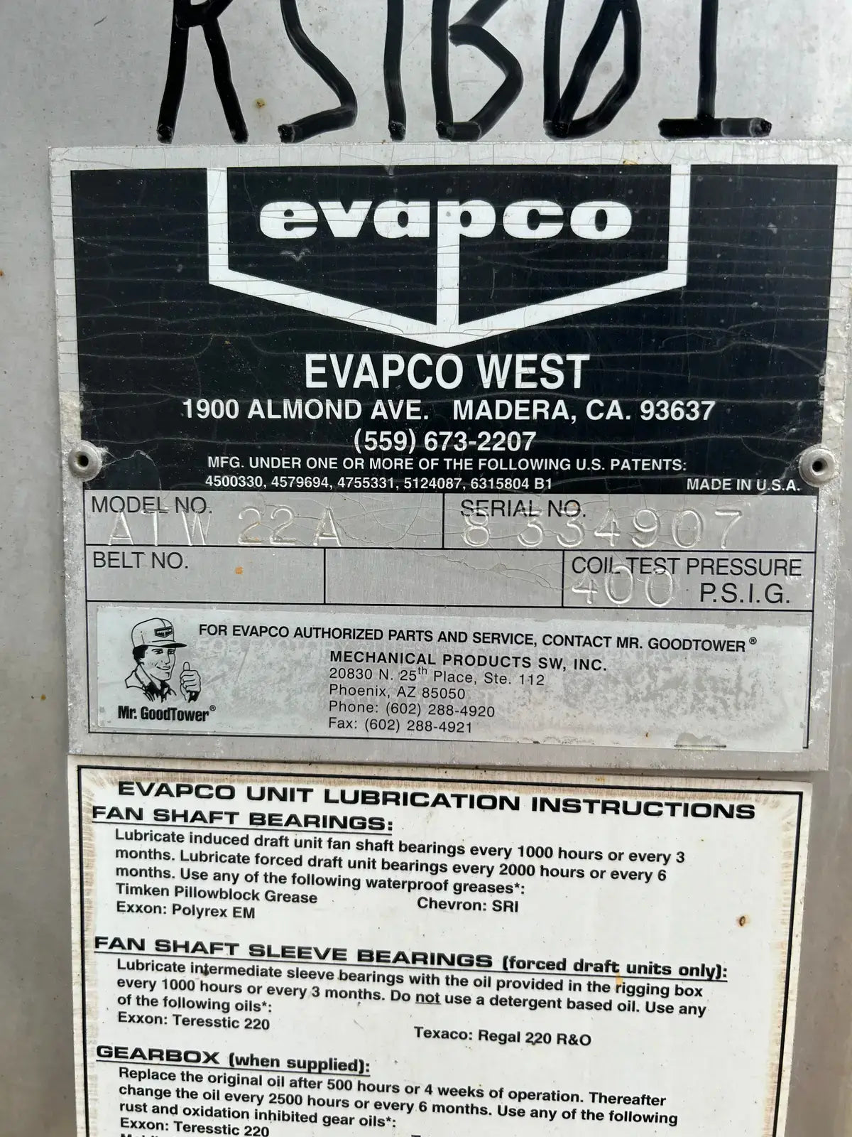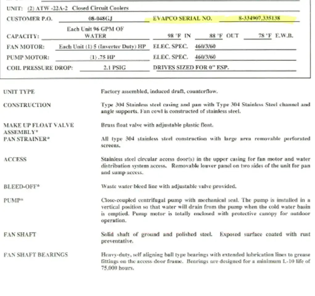 Torre de enfriamiento/condensador de circuito cerrado Evapco serie ATW. Modelo: ATW-22A. N.° de serie: 8334907. Presión de prueba del serpentín: 400 PSIG. Capacidad: 22 toneladas con un caudal de agua de 96 GPM, con una temperatura de entrada de 98 °F, un caudal de salida de 88 °F y un bulbo húmedo de 78 °F.