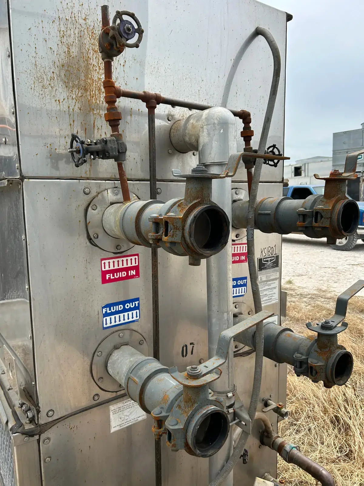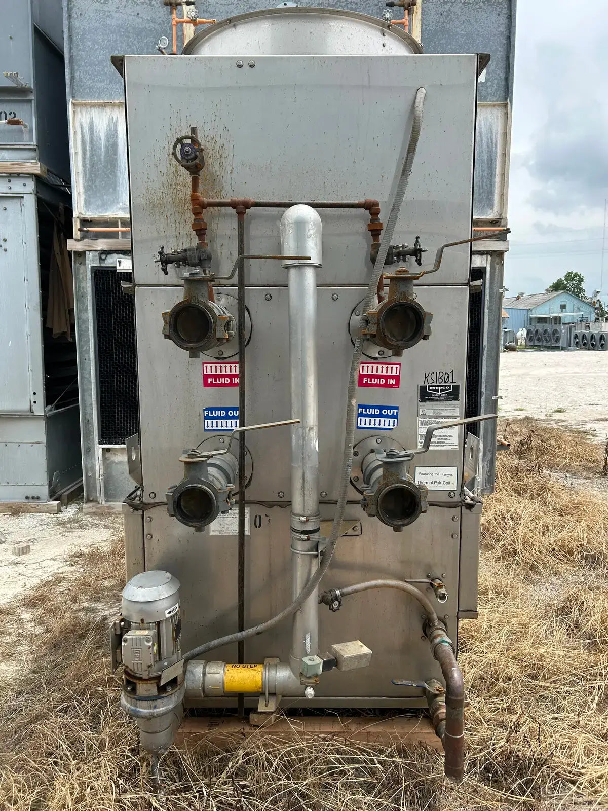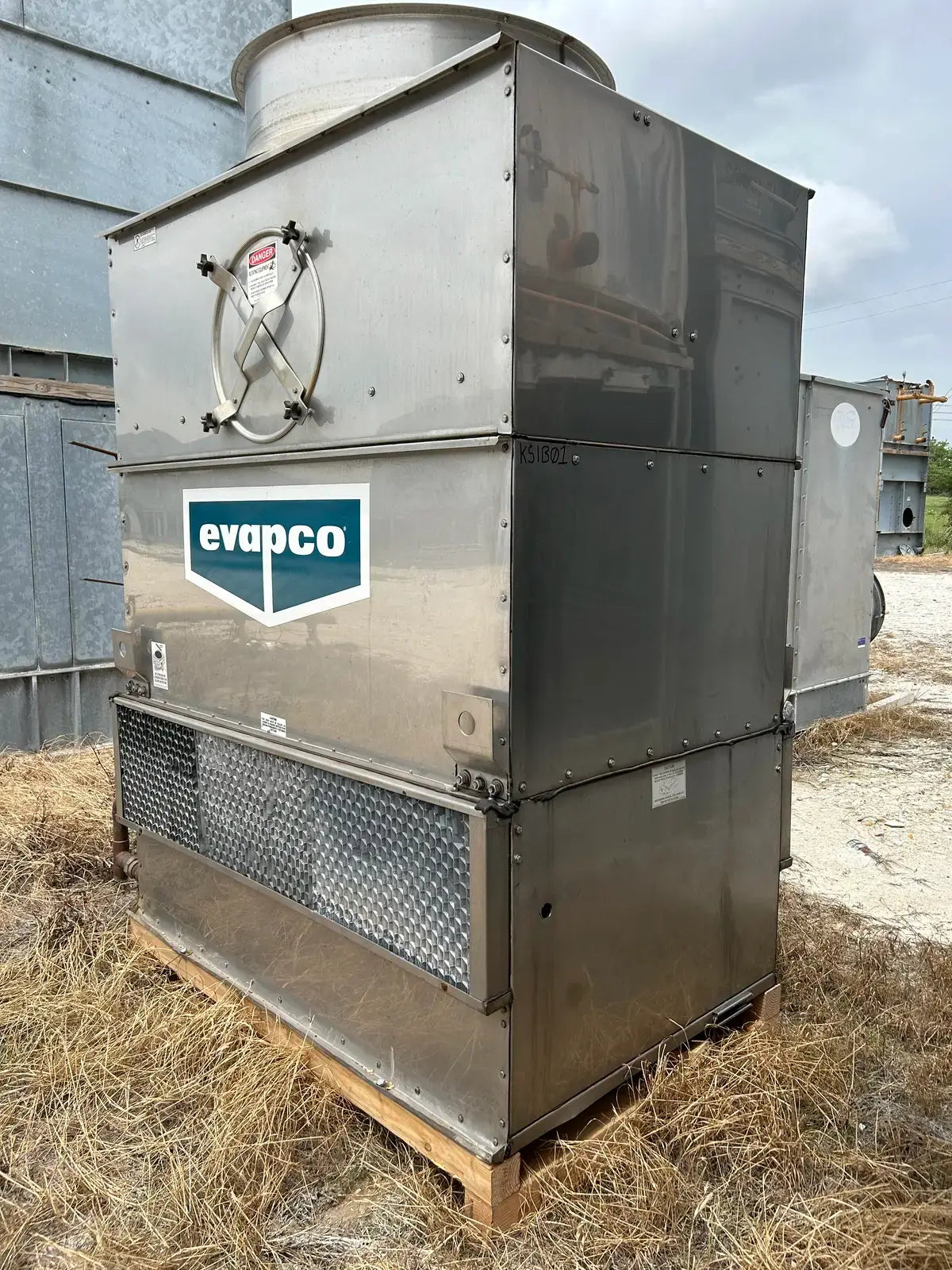 Torre de enfriamiento/condensador de circuito cerrado Evapco serie ATW. Modelo: ATW-22A. N.° de serie: 8334907. Presión de prueba del serpentín: 400 PSIG. Capacidad: 22 toneladas con un caudal de agua de 96 GPM, con una temperatura de entrada de 98 °F, un caudal de salida de 88 °F y un bulbo húmedo de 78 °F.