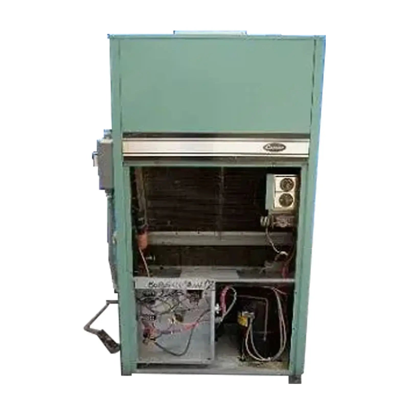 (2) Evaporador Portador-Circuitos de Agua. Número de serie R983380. Fuente de alimentación: 208-230 V, trifásica, 60 Hz, voltaje permitido en la unidad: 253 máx, 187 min. Amperios mínimos del circuito: 20 máx., 4 min. Compresor RLA: 13.0, LRA: 87, Ref: R22, 3.55 lbs. Presión de prueba: alta/baja 1410/150 psi. Ventilador interior: 208-230 V, monofásico, 60 Hz, FLA: 3,3, 1/3 hp, KW Out 0,248. Dimensiones totales: 43 pulgadas de largo x 34 pulgadas de ancho x 75 pulgadas de alto (H17).