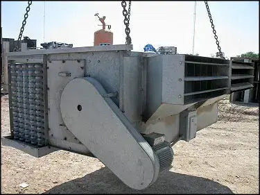 Evaporador colgante Rigidbilt Inc. Modelo: C110-103RA. Capacidad nominal estimada: 8,5 toneladas o 11 000 BTUH usando amoníaco de expansión directa (R-717) para una habitación de 40 °F con una temperatura de succión de 30 °F. Bobina: 10 filas de un tubo de ¾ de pulgada de diámetro con 3 aletas por pulgada. (2) ventiladores con diseño de jaula de ardilla, de 2 pies 1 pulgada de diámetro, cada uno con 48 aspas. Diámetros de polea: (1) impulsor de 7-1/2 pulg. (1) 1 pie 1-3/4 pulg. impulsado. Motor eléctrico estadounidense: 5 hp, 1725 rpm, 230/460 V, 14,4/7,2 A, 60 Hz, trifásico. Caja de alimentación de encendido/apagado Cutler-Hammer: 20 hp máx., 600 V, 30 A, trifásica. Dimensiones de la entrada de aire frontal: 3 pies de largo x 1 pie de ancho. Entradas/salidas: (1) 2-1/2 pulgadas NPT, (1) 2 pulgadas NPT, (1) ¾ pulgadas NPT. Dimensiones de la ventilación de aire frontal: 3 pies de largo x 1 pie de ancho. Dimensiones totales: 8 pies 6-1/2 pulgadas de largo x 3 pies 7-1/2 pulgadas de ancho x 6 pies 5-1/4 pulg. H. (ACN145).