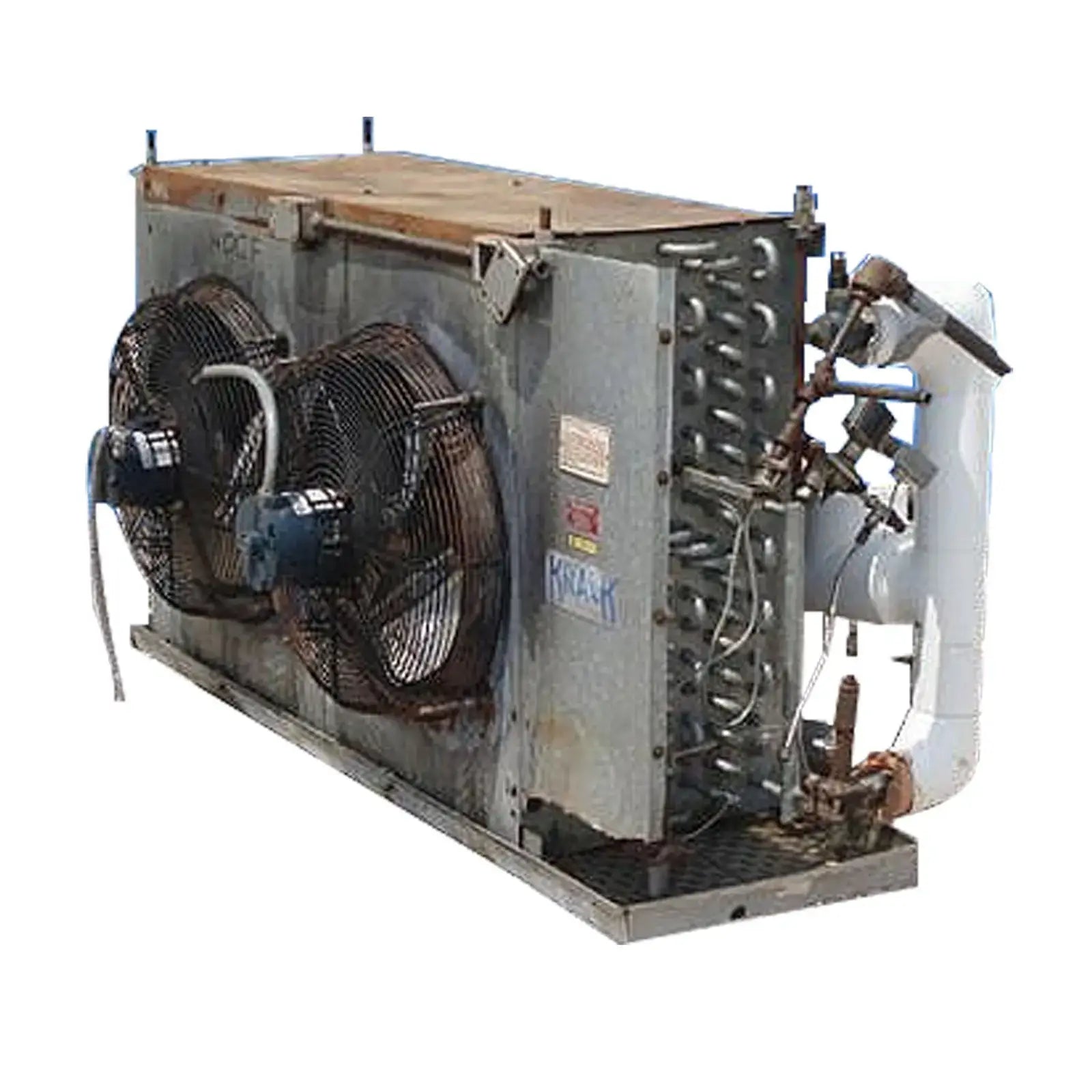 Evaporador de amoníaco recirculado Krack. Diámetro del ventilador: 22 pulgadas (2) motores Century AC, 1/2 hp, 1140 rpm, 200-230/460 V, 20-19/9,5 amperios, 60 Hz, trifásicos. Entradas: (1) 3/4 pulg. de diámetro. alimentación de refrigerante. Salidas: (1) 3/4 pulg. de diámetro. Drenaje FNPT, (1) 3/4 pulg. de diámetro. Puerto de descarga de refrigerante con bridas, (1) 2 pulg. de diámetro. Puerto de succión de refrigerante. Dimensiones totales: 6 pies 4 pulgadas de largo x 3 pies 2 pulgadas de ancho x 2 pies 8 pulgadas de alto.