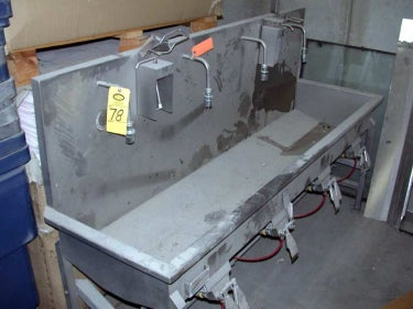 Fregadero para lavado de manos de acero inoxidable Fasco con (4) interruptores de rodilla, 234 boquillas. Dimensiones totales: 6 pies 9 pulgadas de largo x 2 pies de ancho x 5 pies 11 pulgadas de alto.