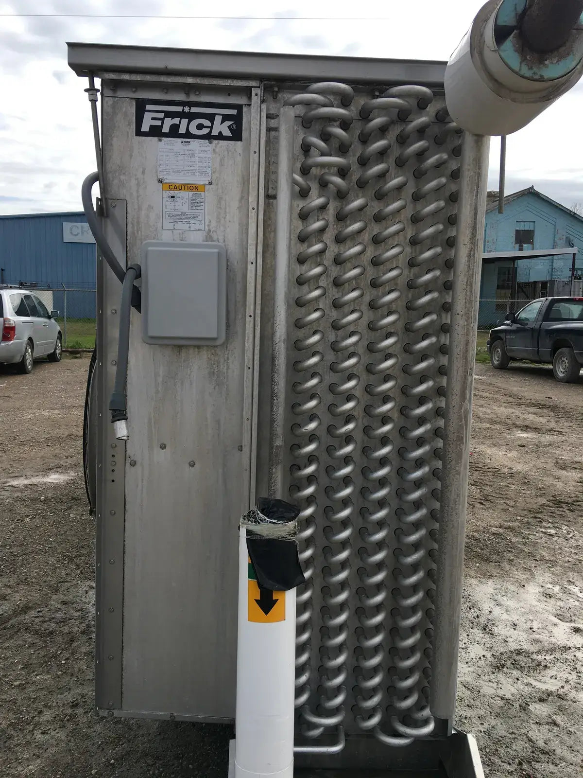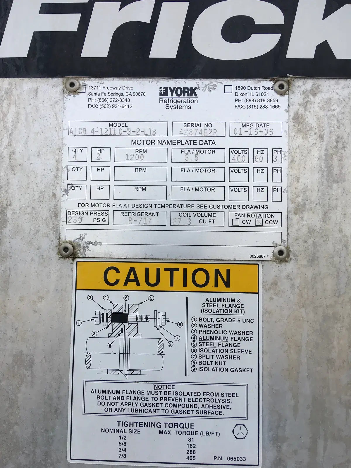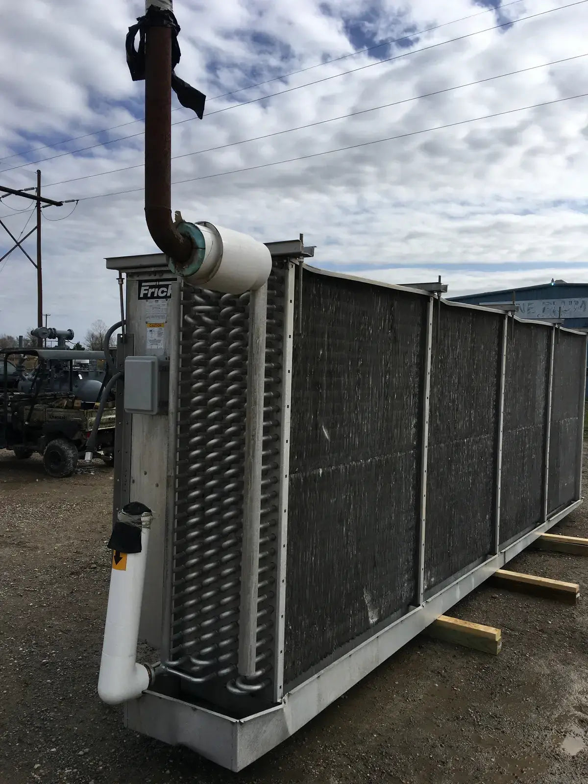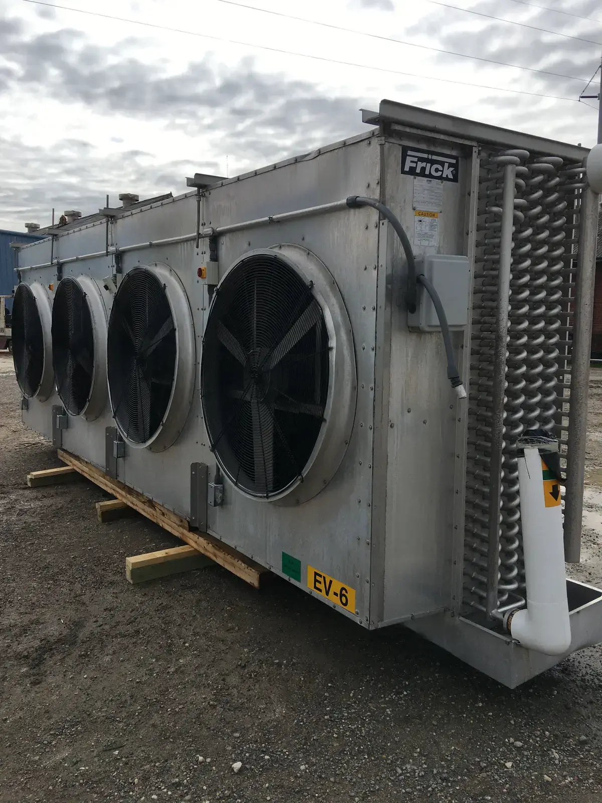 Frick ALCB-4-1211-0-3-2-LTB Serpentín evaporador de amoníaco: 112 TR, 4 ventiladores (baja temperatura) Este evaporador funciona con serpentines esmerilados de baja temperatura. Tiene una capacidad de 89941 (BTUH / °F TD) con un tonelaje estimado de 112,42625 (TR) @15TD. Un flujo de aire de 112858 CFM y una velocidad frontal de 934 FPM. Tiene baterías de recirculación de alimentación superior con sistema de descongelación a gas. Anteriormente funcionaba con amoníaco (R717 | NH3). Se incluyen 4 motores de ventilador de 2 HP.