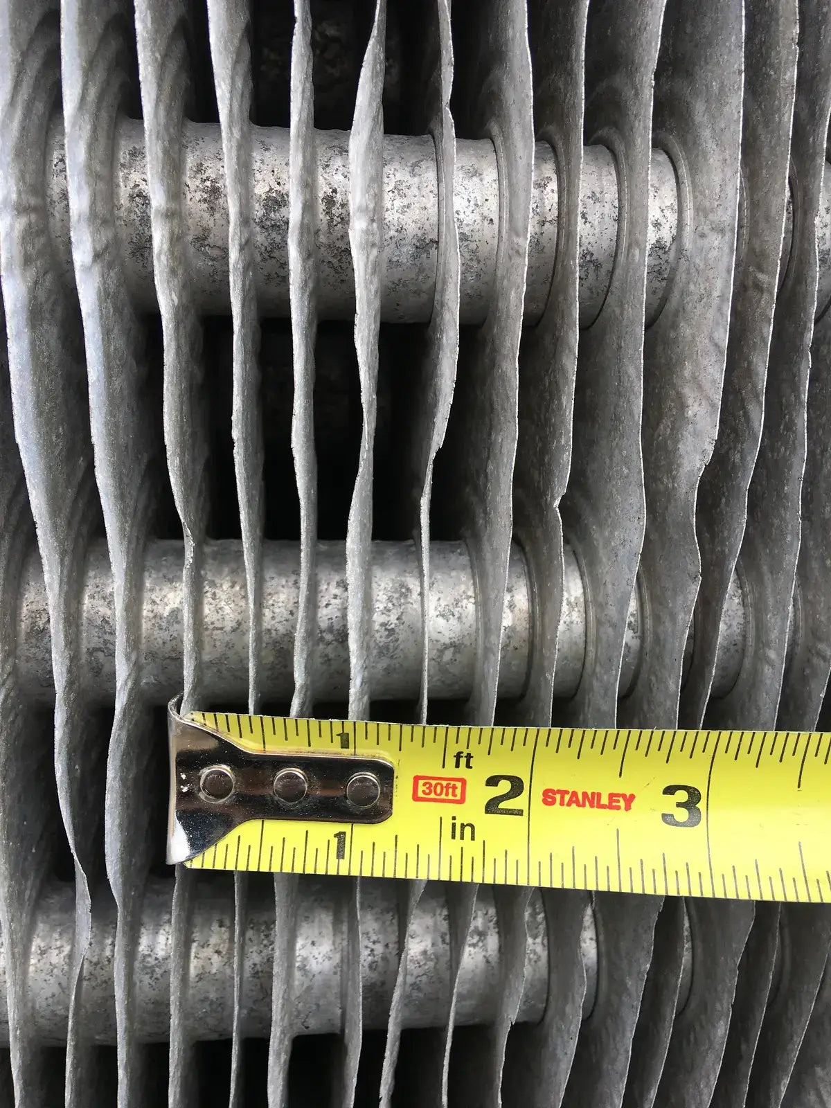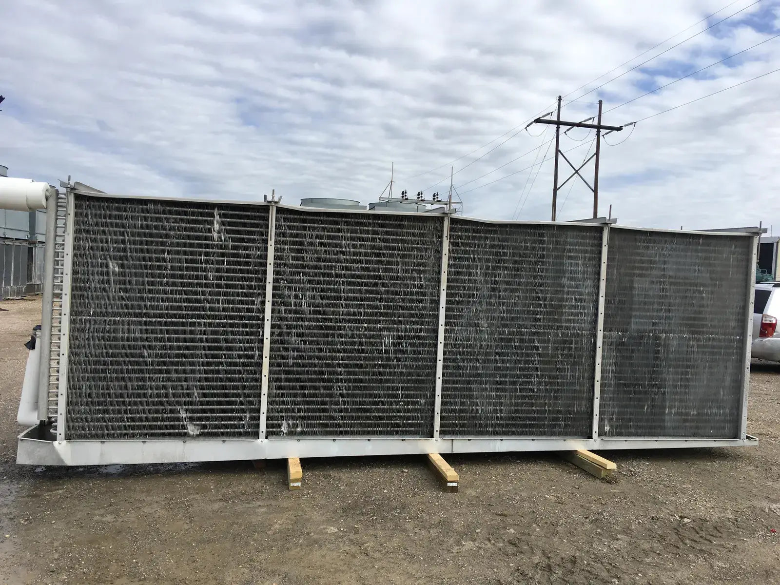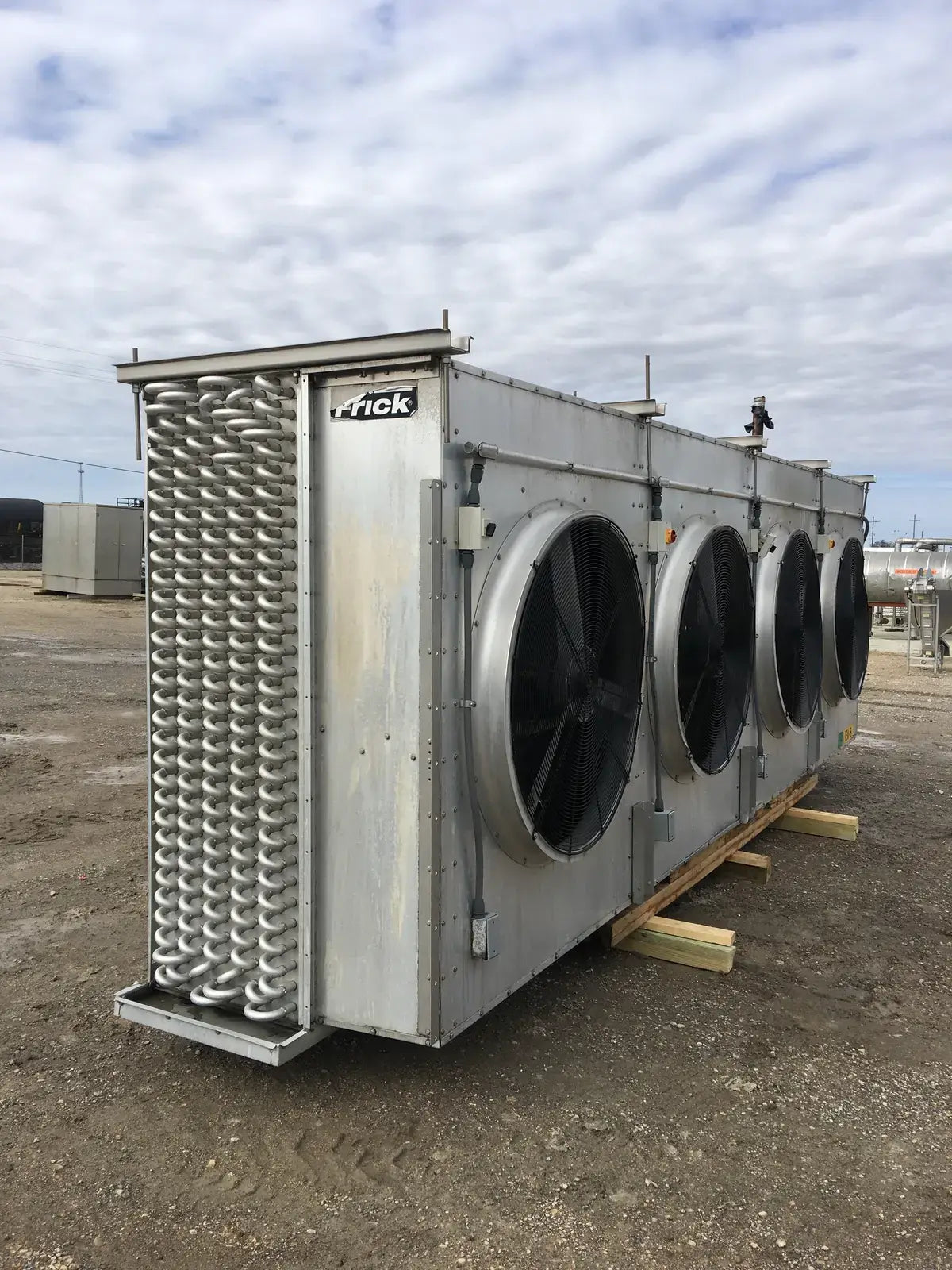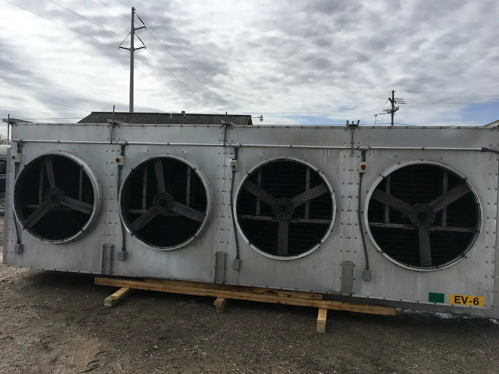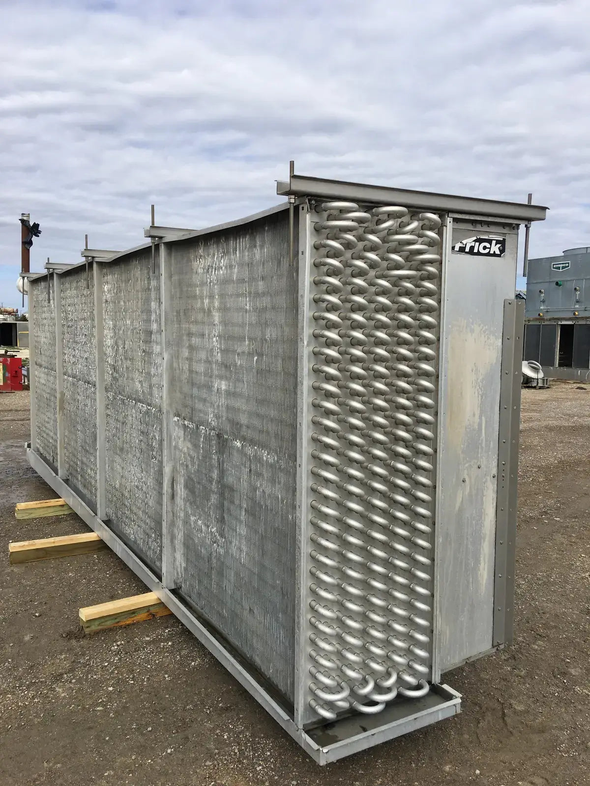 Frick ALCB-4-1211-0-3-2-LTB Serpentín evaporador de amoníaco: 112 TR, 4 ventiladores (baja temperatura) Este evaporador funciona con serpentines esmerilados de baja temperatura. Tiene una capacidad de 89941 (BTUH / °F TD) con un tonelaje estimado de 112,42625 (TR) @15TD. Un flujo de aire de 112858 CFM y una velocidad frontal de 934 FPM. Tiene baterías de recirculación de alimentación superior con sistema de descongelación a gas. Anteriormente funcionaba con amoníaco (R717 | NH3). Se incluyen 4 motores de ventilador de 2 HP.