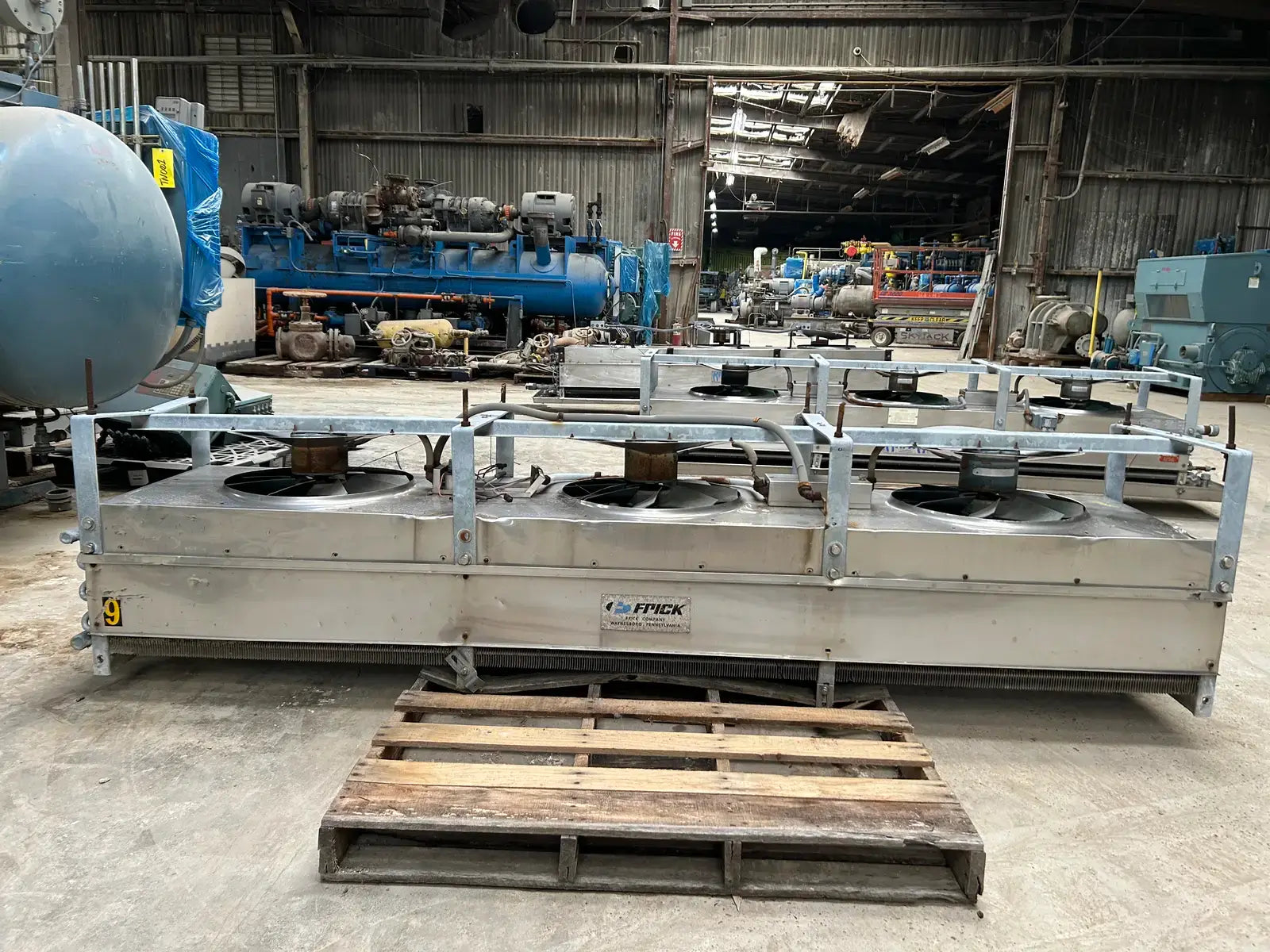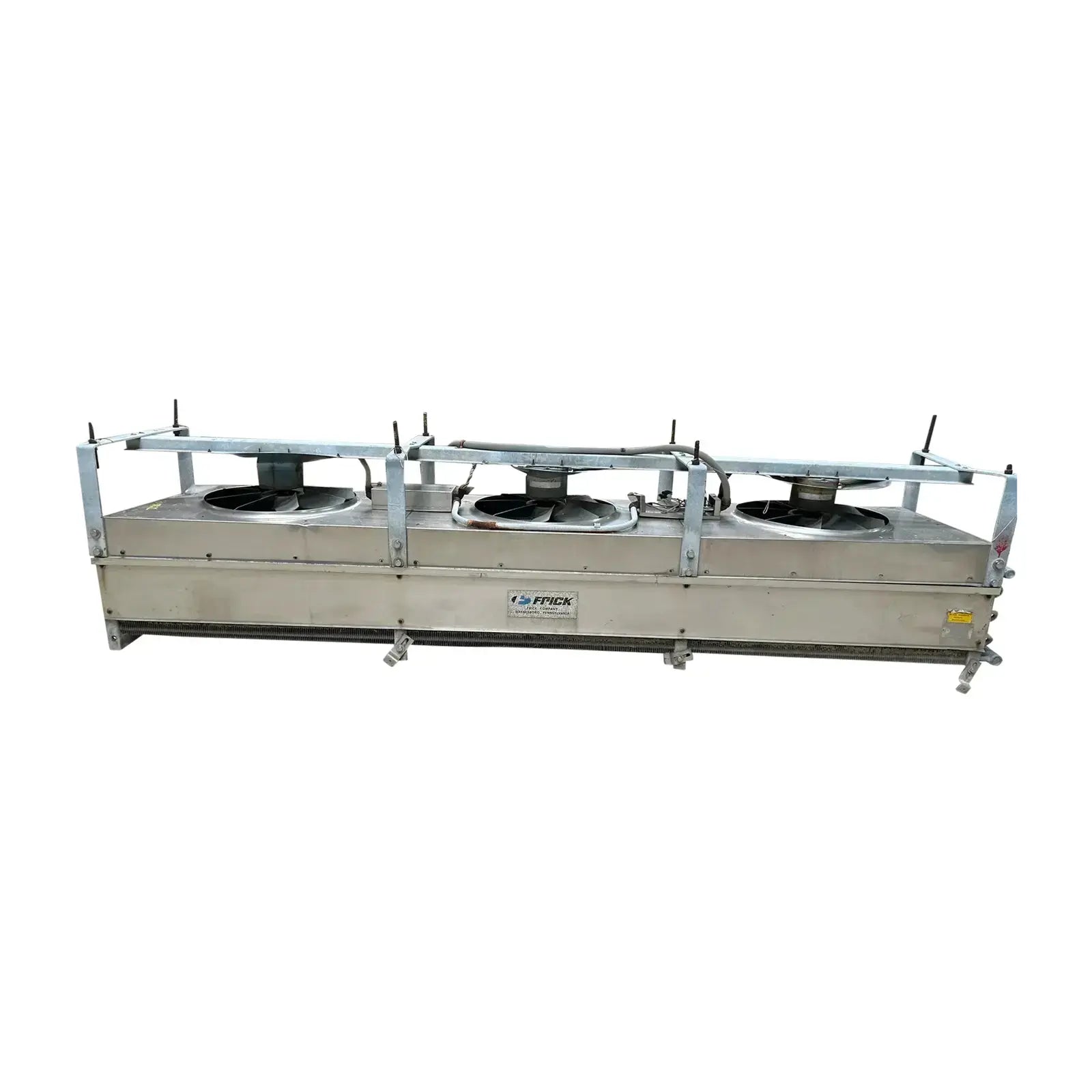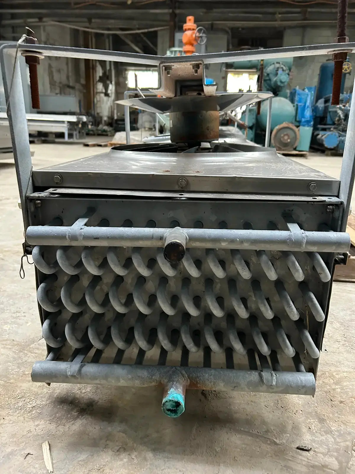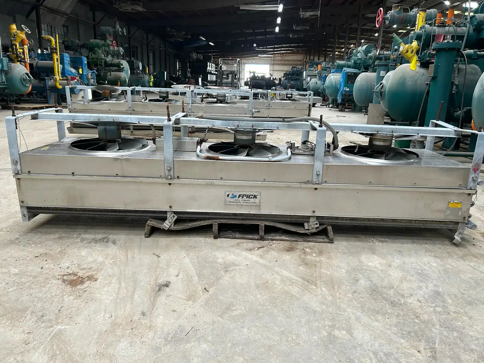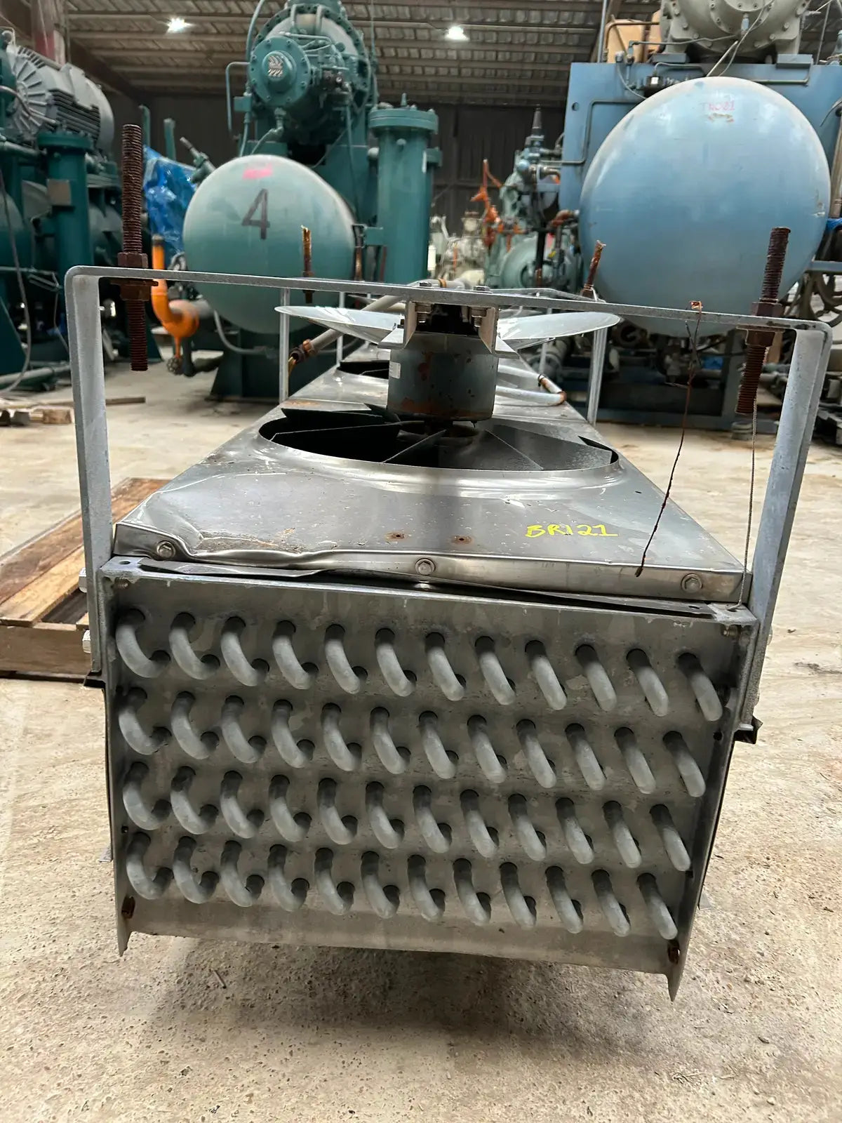 Evaporador enfriador Frick BTRS-38-RTA. 3 ventiladores, motores de 1/6 hp y 5550 CFM. Gabinete y bandeja de drenaje de acero inoxidable. 4,12 toneladas (49 500 Btuh a 10 °C).