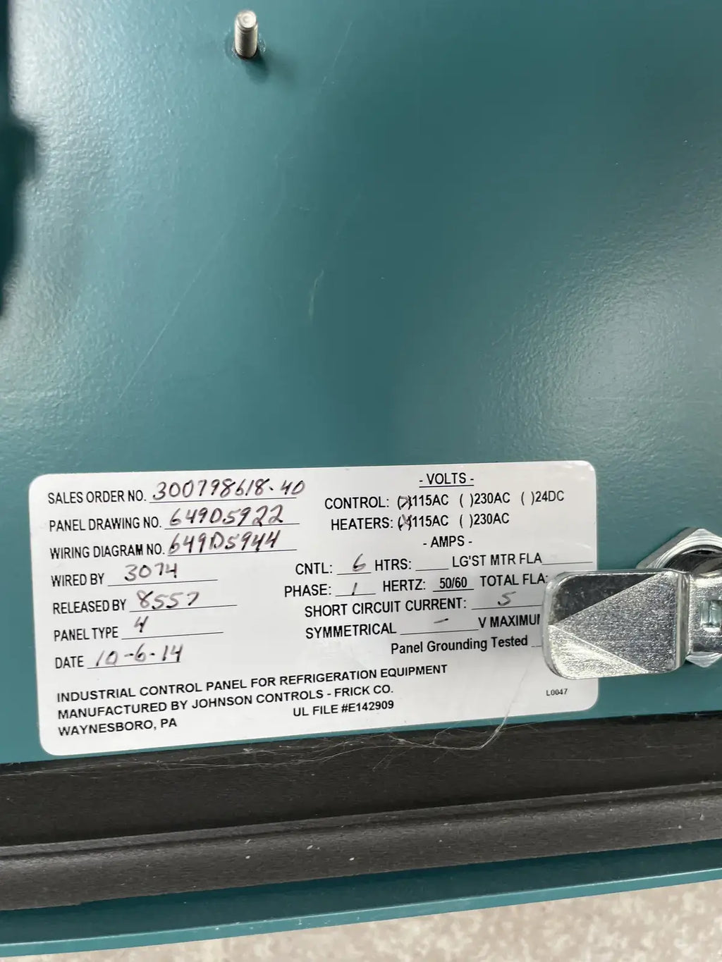 Frick Quantum HD Retrofit Micro Control Panel. Type: Quantum HD Retrofit. Serial No: 10241L43194391. Production Order: 5009514705.